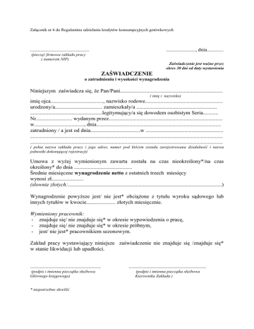 Załącznik nr 6 do Regulaminu udzielania kredytów konsumpcyjnych gotówkowych .............................................. ......................., dnia............. (pieczęć firmowa zakładu pracy z numerem NIP) Zaświadczenie jest waŜne przez okres 30 dni od daty wystawienia ZAŚWIADCZENIE o zatrudnieniu i wysokości wynagrodzenia Niniejszym zaświadcza się, Ŝe Pan/Pani.......................................................................... ( imię i nazwisko) imię ojca......................................, nazwisko rodowe........................................................ urodzony/a.................................. zamieszkały/a .......................................................... ....................................................legitymujący/a się dowodem osobistym Seria........... Nr.......................... wydanym przez.................................................................................. w...................................., dnia.......................................................................................... zatrudniony / a jest od dnia....................................w ........................................................ ........................................................................................................................................... ........................................................................................................................................... ( pełna nazwa zakładu pracy i jego adres, numer pod którym została zarejestrowana działalność i nazwa jednostki dokonującej rejestracji) Umowa z wyŜej wymienionym zawarta została na czas nieokreślony*/na czas określony* do dnia .......................................... Średnie miesięczne wynagrodzenie netto z ostatnich trzech miesięcy wynosi zł....................... (słownie złotych:...............................................................................................................) Wynagrodzenie powyŜsze jest/ nie jest* obciąŜone z tytułu wyroku sądowego lub innych tytułów w kwocie..................... złotych miesięcznie. Wymieniony pracownik: - znajduje się/ nie znajduje się* w okresie wypowiedzenia o pracę, - znajduje się/ nie znajduje się* w okresie próbnym, - jest/ nie jest* pracownikiem sezonowym. Zakład pracy wystawiający niniejsze zaświadczenie nie znajduje się /znajduje się* w stanie likwidacji lub upadłości. ................................................... (podpis i imienna pieczątka słuŜbowa Głównego księgowego) * niepotrzebne skreślić ........................................................ (podpis i imienna pieczątka słuŜbowa Kierownika Zakładu )