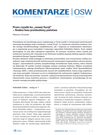 Ośrodek Studiów Wschodnich im. Marka Karpia NUMER 228 | 07.12.2016 www.osw.waw.pl Przez czystki ku „nowej Turcji” – finalna faza przebudowy państwa Mateusz Chudziak Prowadzone od nieudanego puczu wojskowego w Turcji czystki w instytucjach państwowych oznaczają decydujący etap w budowie „nowej Turcji”, tj. ostateczne zniesienie zarówno resztek starego kemalistowskiego establishmentu, jak i rozprawę ze środowiskiem obwinianego o organizację puczu kaznodziei (i dawnego sojusznika) Fethullaha Gülena. Przez władze postrzegany on jest jako największe zagrożenie. W szerszym wymiarze celem czystek jest ostateczna wymiana elit. Prowadzi to do eliminacji wszelkiej opozycji zdolnej zagrozić władzy prezydenta Recepa Tayyipa Erdoğana. Doraźne działania władz polegają na eliminacji przeciwników oraz wzmacnianiu władzy prezydenta i jego osobistej kontroli nad kluczowymi instytucjami (zapowiadana reforma konstytucyjna i wprowadzenie systemu prezydenckiego formalizować będą zmianę, która właśnie się dokonuje). W wyniku czystek następuje swoista rewolucja kadrowa. Miejsce usuniętych funkcjonariuszy zajmują beneficjenci kilkunastoletniej epoki rządów Partii Sprawiedliwości i Rozwoju (AKP), a także przedstawiciele starych elit republikańskich, którzy mają współtworzyć nowy porządek. Uznawani są oni za niezbędnych do zachowania ciągłości funkcjonowania instytucji. Skala tej wymiany, rozmach, z jaką jest przeprowadzana oraz jej instytucjonalne obwarowanie noszą znamiona procesu o charakterze rewolucyjnym, prowadzącego do powstania nowego porządku politycznego. Fethullah Gülen – wróg nr 1 Próba przewrotu z 15 lipca 2016 roku miała charakter puczu wojskowego, a armia powszechnie uważana była dotąd za jedną z najpoważniejszych sił zdolnych zagrozić Erdoğanowi i potencjalną alternatywę dla jego rządów, jednak wydarzenia te stały się pretekstem dla władz do przeprowadzenia ostatecznej rozprawy z Ruchem Fethullaha Gülena – środowiskiem uznawanym przez nie za faktycznie najgroźniejszego oponenta (zob. Aneks). Skala jego wpływów w armii tureckiej jest trudna do oszacowania, niemniej mógł on odegrać pewną rolę w przygotowaniu puczu. Władze wykorzystały próbę obalenia rządu do ostatecznego zdyskredyto- wania i usunięcia wpływów charyzmatycznego kaznodziei w państwie. Prowadzone od momentu puczu czystki we wszystkich strukturach administracji państwowej stanowią kontynuację1 toczonej od wielu miesięcy kampanii wymierzonej w środowisko związane z Gülenem. Działania władz przeciw zwolennikom Gülena, którzy w trudnej do oszacowania skali infiltro Do 2013 roku Fethullah Gülen był głównym sojusznikiem Erdoğana. W grudniu 2013 roku nastąpił rozłam pomiędzy władzami a Ruchem będący skutkiem skandalu korupcyjnego, w którym obciążono czterech ministrów oraz najbliższe otoczenie samego Erdoğana. Od tego czasu Ruch uznawany jest za „państwo równoległe”, którego celem jest obalenie demokratycznie wybranego rządu. Szerzej zob. Dexter Filkins, Turkey’s Thirty-Year Coup, New Yorker, 17.10.2016, http://www.newyorker. com/magazine/2016/10/17/turkeys-thirty-year-coup 1 KOMENTARZE OSW NUMER 228 1 wali instytucje państwowe, przybrały rozmiary niemające precedensu w historii nowoczesnego państwa tureckiego. Jednym z głównych powodów, dla których skala czystek jest tak duża, wydaje się być amorficzność Ruchu (brak formalnego członkostwa, niejednolitość jego bazy społecznej, niejawny mechanizm zależności personalnych, finansowych i politycznych) oraz jego masowość (liczba zaangażowanych członków Ruchu Gülena na całym świecie szacowana jest na 3–6 mln osób2, w tym ok. 1 mln w samej Turcji3). Mimo iż doszło do puczu wojskowego, czystki wymierzone są w Ruch Gülena – przez władze uznawany za największe zagrożenie. Prowadzone czystki przybrały formę działań o charakterze masowym i prewencyjnym jednocześnie. Do 5 listopada aresztowano ponad 34 tys. osób, zwolniono z pracy ponad 105 tys. funkcjonariuszy służby cywilnej oraz usunięto ze stanowisk 3600 sędziów i prokuratorów. Większość osób poddanych represjom oskarżana jest o sprzyjanie puczystom. Kolejnymi dziedzinami funkcjonowania państwa, w których dochodzi do represji, są: szkolnictwo (zwolniono ponad 6 tys. pracowników naukowych, 20 tys. nauczycieli i zamknięto przeszło 2 tys. placówek edukacyjnych) oraz media (zamknięto w sumie 186 gazet, stacji telewizyjnych, portali internetowych itp.; aresztowano 142 dziennikarzy). Zarówno edukacja, jak i sektor medialny były dotąd obszarami szczególnej aktywności Ruchu Gülena – na tym polu jednak konfrontacja trwała od 2013 roku. Od tego czasu zamknięto placówki oferujące prywatne kursy uzupełniające dla kandydatów na studia (tzw. dershane) oraz sukcesywnie przejmowano związane z Ruchem holdingi medialne, do których należały gazety codzienne i stacje telewizyjne (największe z nich to Koza Ipek oraz Feza Gazetecilik przejęte w październiku 2015 oraz marcu 2016 roku). Nieudany pucz był jedynie katalizatorem, a nawet pretekstem, do rozprawy z Ruchem, który postrzegany był przez władze jako skrajnie niebezpieczny już w grudniu 2013 roku4. Ma on bowiem charakter masowy, jego celem było wykształcenie nowych muzułmańskich elit i transformacja państwa oraz społeczeństwa tureckiego w „długim marszu”. Stąd brała się tak liczna obecność zwolenników Gülena w różnych strukturach państwowych. Z uwagi na amorficzność Ruchu władze postanowiły usunąć jego członków w masowej akcji, jednocześnie poddając represjom osoby, co do których zachodziło jedynie podejrzenie związków z wrogim wobec rządu środowiskiem. Za ilustrację nadużyć idących w parze z czystkami może posłużyć fakt, że do Trybunału Konstytucyjnego (którego dwóch sędziów również usunięto) wpłynęło w tym czasie ponad 40 tys. s