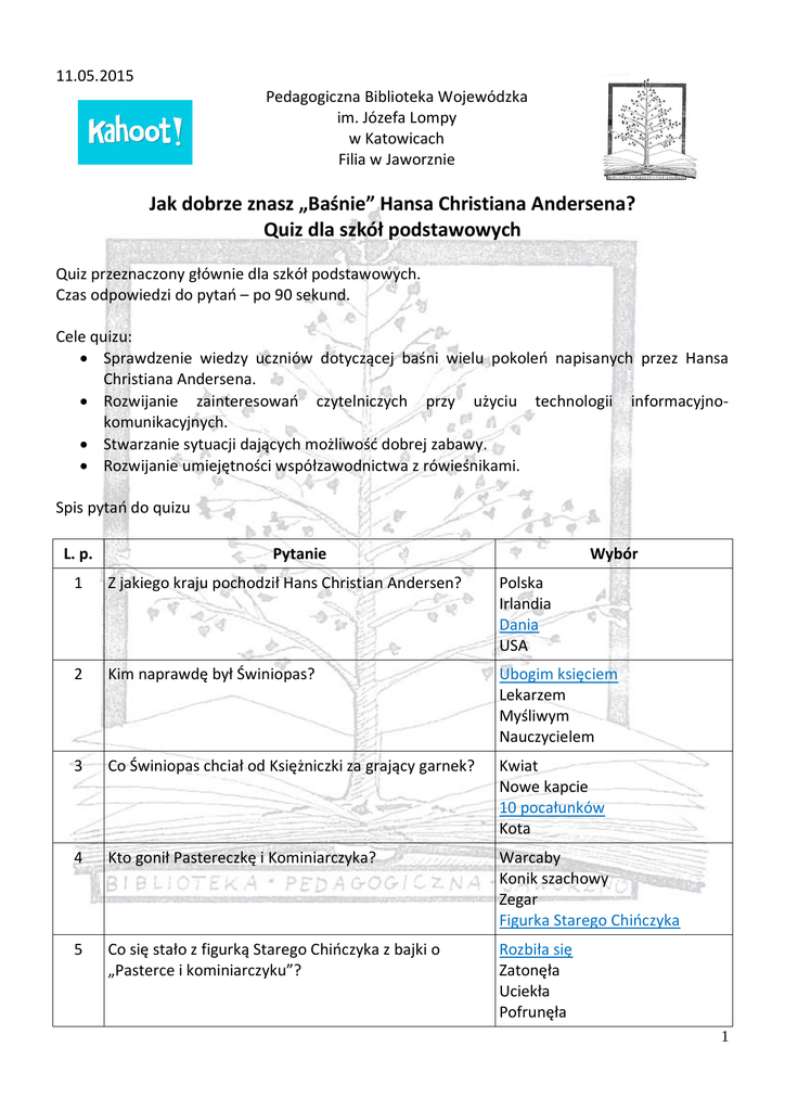 11.05.2015 Pedagogiczna Biblioteka Wojewódzka im. Józefa Lompy w Katowicach Filia w Jaworznie Jak dobrze znasz „Baśnie” Hansa Christiana Andersena? Quiz dla szkół podstawowych Quiz przeznaczony głównie dla szkół podstawowych. Czas odpowiedzi do pytań – po 90 sekund. Cele quizu: Sprawdzenie wiedzy uczniów dotyczącej baśni wielu pokoleń napisanych przez Hansa Christiana Andersena. Rozwijanie zainteresowań czytelniczych przy użyciu technologii informacyjnokomunikacyjnych. Stwarzanie sytuacji dających możliwość dobrej zabawy. Rozwijanie umiejętności współzawodnictwa z rówieśnikami. Spis pytań do quizu L. p. Pytanie Wybór 1 Z jakiego kraju pochodził Hans Christian Andersen? Polska Irlandia Dania USA 2 Kim naprawdę był Świniopas? Ubogim księciem Lekarzem Myśliwym Nauczycielem 3 Co Świniopas chciał od Księżniczki za grający garnek? Kwiat Nowe kapcie 10 pocałunków Kota 4 Kto gonił Pastereczkę i Kominiarczyka? Warcaby Konik szachowy Zegar Figurka Starego Chińczyka 5 Co się stało z figurką Starego Chińczyka z bajki o „Pasterce i kominiarczyku”? Rozbiła się Zatonęła Uciekła Pofrunęła 1 6 Czym różnił się Ołowiany Żołnierz od swoich kolegów? Nie miał broni Miał jedną nogę Nosił plecak Miał pasek 7 Co chciał szczur od Ołowianego Żołnierza? Okruszków Sera Jabłek Paszportu 8 Co przeszkadzało Prawdziwej Księżniczce w wyspaniu się? Śpiewanie ptaków Trzaskanie talerzami Ziarnko grochu Otwarte okno 9 Gdzie ukryte było ziarenko grochu, które przeszkadzało w łóżku Prawdziwej Księżniczce? w szafie w komodzie na talerzu 10 Jak miał na imię ogrodnik, który chciał ściąć stare drzewa pełne gniazd? Hans Larsen Christian Olaf 11 Jaki kwiat miał ścinać codziennie ogrodnik Larsen dla księżniczki? Różę Lilię Karczocha Kalafiora 12 Czyjego śpiewu słuchała Stokrotka? Gołębia Skowronka Kosa Bociana 13 Z jakiego kwiatu zaparzona herbata, pomogła przeziębionemu chłopcu? Kaktusa Konwalii Bzu Wiśni 14 W jakim naczyniu siedziała Bzowa Babuleńka? w imbryku w rondlu w kotle na patelni 15 Co zastąpiło prawdziwego słowika w ogrodzie Cesarza Małpka Chin? Sztuczny słowik Słoń Żyrafa 2 16 Ile ciekawych świata ziarenek grochu było w jednym strączku? Dziesięć - 10 Pieć - 5 Trzy - 3 Dwa - 2 17 Kto oglądał codziennie, jak rośnie groch za oknem? chora dziewczynka babcia dziadek mały chłopiec 18 Co musiała zeszyć igła do cerowania? Sukienkę Spodnie Pantofle kucharki Szlafrok 19 Jaki ptak uratował życie Chińskiemu Cesarzowi? Bocian Kruk Kawka Słowik 20 Co potrafił robić zaczarowany kufer? latać pływać gotować mówić 21 Jak miała na imię dziewczynka znaleziona w tulipanie? Roszpunka Calineczka Ariel Małgosia 22 Kogo poślubiła Calineczka? Duszka Kwiatów Tomcia Palucha Ołowianego Żołnierzyka Kominiarczyka 23 Jakiego koloru są kwiaty lnu? zielone brązowe szare Niebieskie 24 Co można otrzymać z lnu? Płótno Wodę Atrament Śnieg 25 Co miał na sobie tytułowy bohater z bajki „Nowe szaty jedwabny płaszcz cesarza”? Nic Nowe spodnie Koszulę 3 26 Z czego Eliza plotła koszule dla swoich zaczarowanych braci? z jedwabiu z lnu z pokrzyw z wierzby 27 W co byli zaczarowani bracia Elzy? w dzikie łabędzie w pszczoły w koty w myszy 28 Co najlepiej potrafiła robić „Stara Latarnia”? Mrugać Świecić Śpiewać Grać 29 Co się stało z „Imbrykiem”, kiedy urwało mu się ucho i Został doniczką stłukła pokrywka? Naprawiono mu ucho Sprzedano Zamknięto w szafie 30 Kto odwiedzał kogucika na dachu i opowiadał mu historie o obcych krajach? Motyle Ptaki wędrowne Żaby Ważki 31 W jaki dzień toczy się akcja baśni „Dziewczynka z zapałkami”? w Boże Narodzenie w Wielkanoc w wigilię Nowego Roku w Noc Świętojańską 32 Z czego jest znany „Ole Zmruż-Oko”? z celnego oka Najlepiej opowiada bajki Umie leczyć zęby Widzi przez ściany 33 W jakiego ptaka zamieniło się „Brzydkie Kaczątko”? w bociana w srokę w łabędzia w kruka 34 Jak miał na imię chłopiec, którego zabrała „Królowa Śniegu”? Kay Adam Hans Stefen 35 Co stopiło lód w sercu Kay’a? ognisko Złoty napój Słońce gorące łzy Gerdy oprac. J. Wypart 4