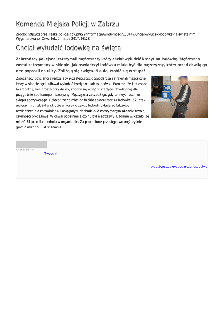 Komenda Miejska Policji w Zabrzu Źródło: http://zabrze.slaska.policja.gov.pl/k29/informacje/wiadomosci/158449,Chcial-wyludzic-lodowke-na-swieta.html Wygenerowano: Czwartek, 2 marca 2017, 08:28 Chciał wyłudzić lodówkę na święta Zabrzańscy policjanci zatrzymali mężczyznę, który chciał wyłudzić kredyt na lodówkę. Mężczyzna został zatrzymany w sklepie. Jak oświadczył lodówka miała być dla mężczyzny, który przed chwilą go o to poprosił na ulicy. Zbliżają się święta. Nie daj zrobić się w słupa! Zabrzańscy policjanci zwalczający przestępczość gospodarczą zatrzymali mężczyznę, który w sklepie agd usiłował wyłudzić kredyt na zakup lodówki. Pomimo, że jest osobą bezrobotną, bez grosza przy duszy, zgodził się wziąć w kredycie chłodziarkę dla przygodnie spotkanego mężczyzny. Mężczyzna zaczepił go, gdy ten wychodził ze sklepu spożywczego. Obiecał, że co miesiąc będzie spłacał raty za lodówkę. 52-latek uwierzył mu i złożył w sklepie wniosek o zakup lodówki składając fałszywe oświadczenie o zatrudnieniu i osiąganym dochodzie. Z zatrzymanym obecnie trwają czynności procesowe. W chwili popełnienia czynu był nietrzeźwy. Badanie wskazało, że miał 0,84 promila alkoholu w organizmie. Za popełnione przestępstwo mężczyźnie grozi nawet do 8 lat więzienia. Ocena: 5/5 (2) Tweetnij przestępstwa gospodarcze, oszustwa