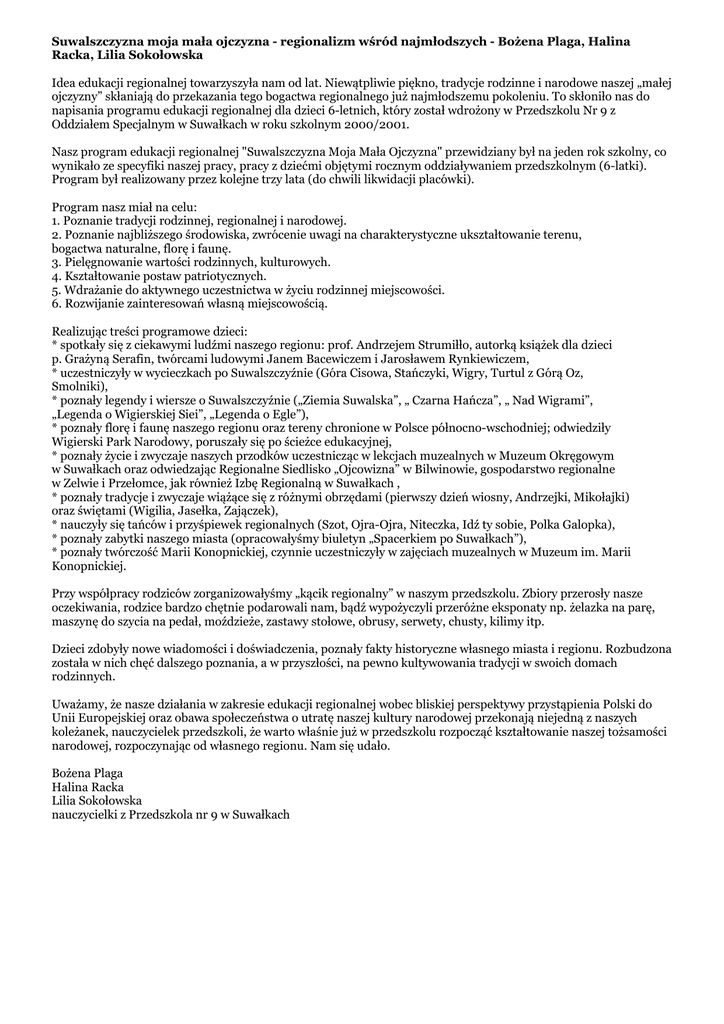 Suwalszczyzna moja mała ojczyzna - regionalizm wśród najmłodszych - Bożena Plaga, Halina Racka, Lilia Sokołowska Idea edukacji regionalnej towarzyszyła nam od lat. Niewątpliwie piękno, tradycje rodzinne i narodowe naszej „małej ojczyzny” skłaniają do przekazania tego bogactwa regionalnego już najmłodszemu pokoleniu. To skłoniło nas do napisania programu edukacji regionalnej dla dzieci 6-letnich, który został wdrożony w Przedszkolu Nr 9 z Oddziałem Specjalnym w Suwałkach w roku szkolnym 2000/2001. Nasz program edukacji regionalnej "Suwalszczyzna Moja Mała Ojczyzna" przewidziany był na jeden rok szkolny, co wynikało ze specyfiki naszej pracy, pracy z dziećmi objętymi rocznym oddziaływaniem przedszkolnym (6-latki). Program był realizowany przez kolejne trzy lata (do chwili likwidacji placówki). Program nasz miał na celu: 1. Poznanie tradycji rodzinnej, regionalnej i narodowej. 2. Poznanie najbliższego środowiska, zwrócenie uwagi na charakterystyczne ukształtowanie terenu, bogactwa naturalne, florę i faunę. 3. Pielęgnowanie wartości rodzinnych, kulturowych. 4. Kształtowanie postaw patriotycznych. 5. Wdrażanie do aktywnego uczestnictwa w życiu rodzinnej miejscowości. 6. Rozwijanie zainteresowań własną miejscowością. Realizując treści programowe dzieci: * spotkały się z ciekawymi ludźmi naszego regionu: prof. Andrzejem Strumiłło, autorką książek dla dzieci p. Grażyną Serafin, twórcami ludowymi Janem Bacewiczem i Jarosławem Rynkiewiczem, * uczestniczyły w wycieczkach po Suwalszczyźnie (Góra Cisowa, Stańczyki, Wigry, Turtul z Górą Oz, Smolniki), * poznały legendy i wiersze o Suwalszczyźnie („Ziemia Suwalska”, „ Czarna Hańcza”, „ Nad Wigrami”, „Legenda o Wigierskiej Siei”, „Legenda o Egle”), * poznały florę i faunę naszego regionu oraz tereny chronione w Polsce północno-wschodniej; odwiedziły Wigierski Park Narodowy, poruszały się po ścieżce edukacyjnej, * poznały życie i zwyczaje naszych przodków uczestnicząc w lekcjach muzealnych w Muzeum Okręgowym w Suwałkach oraz odwiedzając Regionalne Siedlisko „Ojcowizna” w Bilwinowie, gospodarstwo regionalne w Zelwie i Przełomce, jak również Izbę Regionalną w Suwałkach , * poznały tradycje i zwyczaje wiążące się z różnymi obrzędami (pierwszy dzień wiosny, Andrzejki, Mikołajki) oraz świętami (Wigilia, Jasełka, Zajączek), * nauczyły się tańców i przyśpiewek regionalnych (Szot, Ojra-Ojra, Niteczka, Idź ty sobie, Polka Galopka), * poznały zabytki naszego miasta (opracowałyśmy biuletyn „Spacerkiem po Suwałkach”), * poznały twórczość Marii Konopnickiej, czynnie uczestniczyły w zajęciach muzealnych w Muzeum im. Marii Konopnickiej. Przy współpracy rodziców zorganizowałyśmy „kącik regionalny” w naszym przedszkolu. Zbiory przerosły nasze oczekiwania, rodzice bardzo chętnie podarowali nam, bądź wypożyczyli przeróżne eksponaty np. żelazka na parę, maszynę do szycia na pedał, moździeże, zastawy stołowe, obrusy, serwety, chusty, kilimy itp. Dzieci zdobyły nowe wiadomości i doświadczenia, poznały fakty historyczne własnego miasta i regionu. Rozbudzona została w nich chęć dalszego poznania, a w przyszłości, na pewno kultywowania tradycji w swoich domach rodzinnych. Uważamy, że nasze działania w zakresie edukacji regionalnej wobec bliskiej perspektywy przystąpienia Polski do Unii Europejskiej oraz obawa społeczeństwa o utratę naszej kultury narodowej przekonają niejedną z naszych koleżanek, nauczycielek przedszkoli, że warto właśnie już w przedszkolu rozpocząć kształtowanie naszej tożsamości narodowej, rozpoczynając od własnego regionu. Nam się udało. Bożena Plaga Halina Racka Lilia Sokołowska nauczycielki z Przedszkola nr 9 w Suwałkach