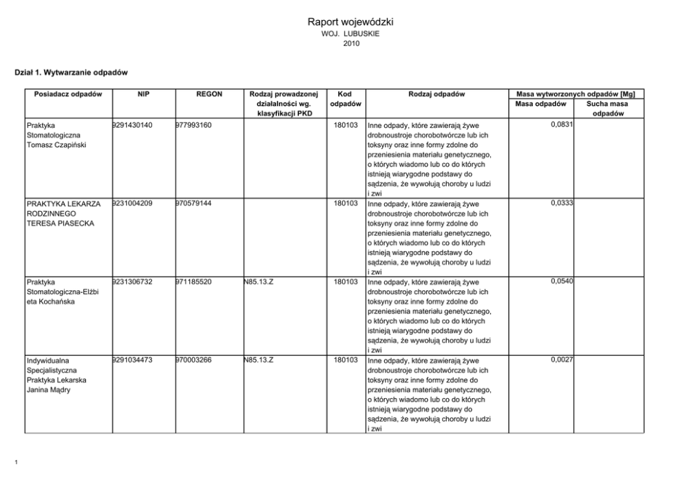 Raport wojewódzki WOJ. LUBUSKIE 2010 Dział 1. Wytwarzanie odpadów Posiadacz odpadów 1 NIP REGON Rodzaj prowadzonej działalności wg. klasyfikacji PKD Kod odpadów Praktyka Stomatologiczna Tomasz Czapiński 9291430140 977993160 180103 PRAKTYKA LEKARZA RODZINNEGO TERESA PIASECKA 9231004209 970579144 180103 Praktyka Stomatologiczna-Elżbi eta Kochańska 9231306732 971185520 N85.13.Z 180103 Indywidualna Specjalistyczna Praktyka Lekarska Janina Mądry 9291034473 970003266 N85.13.Z 180103 Rodzaj odpadów Inne odpady, które zawierają żywe drobnoustroje chorobotwórcze lub ich toksyny oraz inne formy zdolne do przeniesienia materiału genetycznego, o których wiadomo lub co do których istnieją wiarygodne podstawy do sądzenia, że wywołują choroby u ludzi i zwi Inne odpady, które zawierają żywe drobnoustroje chorobotwórcze lub ich toksyny oraz inne formy zdolne do przeniesienia materiału genetycznego, o których wiadomo lub co do których istnieją wiarygodne podstawy do sądzenia, że wywołują choroby u ludzi i zwi Inne odpady, które zawierają żywe drobnoustroje chorobotwórcze lub ich toksyny oraz inne formy zdolne do przeniesienia materiału genetycznego, o których wiadomo lub co do których istnieją wiarygodne podstawy do sądzenia, że wywołują choroby u ludzi i zwi Inne odpady, które zawierają żywe drobnoustroje chorobotwórcze lub ich toksyny oraz inne formy zdolne do przeniesienia materiału genetycznego, o których wiadomo lub co do których istnieją wiarygodne podstawy do sądzenia, że wywołują choroby u ludzi i zwi Masa wytworzonych odpadów [Mg] Masa odpadów Sucha masa odpadów 0,0831 0,0333 0,0540 0,0027 WARSZTAT SZKOLENIOWO USŁUGOWY - MECH. POJAZDOWA-ŚLUSA RSTWO BAPRO - MET Sp. z o.o. 5961049470 9720818035 210327112 O90.02.Z 631049791 130208 Inne oleje silnikowe, przekładniowe i smarowe 0,3740 150202 0,1490 160103 Sorbenty, materiały filtracyjne (w tym filtry olejowe nieujęte w innych grupach), tkaniny do wycierania (np. szmaty, ścierki) i ubrania ochronne zanieczyszczone substancjami niebezpiecznymi (np. PCB) Zużyte opony 160107 Filtry olejowe 0,0300 160113 Płyny hamulcowe 0,0380 160114 0,0260 160117 Płyny zapobiegające zamarzaniu zawierające niebezpieczne substancje Metale żelazne 160118 Metale nieżelazne 1,6580 160119 Tworzywa sztuczne 0,3000 160120 Szkło 0,6200 160199 Inne niewymienione odpady 0,9690 160601 Baterie i akumulatory ołowiowe 0,4270 160801 0,0150 070213 Zużyte katalizatory zawierające złoto, srebro, ren, rod, pallad, iryd lub platynę (z wyłączeniem 16 08 07) Odpady tworzyw sztucznych 150102 Opakowania z tworzyw sztucznych 0,1710 160213 Zużyte urządzenia zawierające niebezpieczne elementy inne niż wymienione w 16 02 09 do 16 02 12 Żelazo i stal 0,0200 170405 Zakład Wielobranżowy IMPORT-EKSPORT Stanisław Sikorski 2 9251426623 971201264 DH25.24.Z 1,2580 30,4620 0,3000 87,5900 120105 Odpady z toczenia i wygładzania tworzyw sztucznych 5,2000 150106 Zmieszane odpady opakowaniowe 1,2000 210017825 Zakład Wyrobow i Prefabrykatów Betonowych Dionizy Woiński 080318 Odpadowy toner drukarski inny niż wymieniony w 08 03 17 0,0030 150202 Sorbenty, materiały filtracyjne (w tym filtry olejowe nieujęte w innych grupach), tkaniny do wycierania (np. szmaty, ścierki) i ubrania ochronne zanieczyszczone substancjami niebezpiecznymi (np. PCB) Zużyte urządzenia inne niż wymienione w 16 02 09 do 16 02 13 Odpady betonu oraz gruz betonowy z rozbiórek i remontów Odpadowe emulsje i roztwory z obróbki metali niezawierające chlorowców Sorbenty, materiały filtracyjne (w tym filtry olejowe nieujęte w innych grupach), tkaniny do wycierania (np. szmaty, ścierki) i ubrania ochronne zanieczyszczone substancjami niebezpiecznymi (np. PCB) Odpadowa tkanka zwierzęca 0,1000 160214 170101 HOUGHTON POLSKA Sp. z o.o. 5272218827 014893872 G51.55.Z 120109 150202 Konecke Sp. z o.o. 5981477022 211022700 G51.17.Z 020202 100103 130208 150102 150202 150203 160213 3 0,0204 0,4000 72,0000 15,0100 65,0000 Popioły lotne z torfu i drewna niepoddanego obróbce chemicznej Inne oleje silnikowe, przekładniowe i smarowe Opakowania z tworzyw sztucznych 0,4500 Sorbenty, materiały filtracyjne (w tym filtry olejowe nieujęte w innych grupach), tkaniny do wycierania (np. szmaty, ścierki) i ubrania ochronne zanieczyszczone substancjami niebezpiecznymi (np. PCB) Sorbenty, materiały filtracyjne, tkaniny do wycierania (np. szmaty, ścierki) i ubrania ochronne inne niż wymienione w 15 02 02 Zużyte urządzenia zawierające niebezpieczne elementy inne niż wymienione w 16 02 09 do 16 02 12 0,8200 0,4300 2,4200 0,1800 0,0020 Przedsiebiorstwo Usługowo-Handlowe "Artwas" Artur, Katarzyna Wasilkowscy 5993108750 210144268 G50.20.A 150101 Opakowania z papieru i tektury 0,2000 150102 Opakowania z tworzyw sztucznych 0,0200 150110 0,0030 160109 Opakowania zawierające pozostałości substancji niebezpiecznych lub nimi zanieczyszczone (np. środkami ochrony roślin I i II klasy toksyczności - bardzo toksyczne i toksyczne) Sorbenty, materiały filtracyjne (w tym filtry olejowe nieujęte w innych grupach), tkaniny do wycierania (np. szmaty, ścierki) i ubrania ochronne zanieczyszczone substancjami niebezpiecznymi (np. PCB) Elementy zawierające PCB 160117 Metale żelazne 0,5000 180101 Narzędzia chirurgiczne i zabiegowe oraz ich resztki (z wyłączeniem 18 01 03) Inne odpady, które zawierają żywe drobnoustroje chorobotwórcze lub ich toksyny oraz inne formy zdolne do przeniesienia materiału genetycznego, o których wiadomo lub co do których istnieją wiarygodne podstawy do sądzenia, że wywołują choroby u ludzi i zwi Inne odpady niż wymienione w 18 01 03 Inne odpady, które zawierają żywe drobnoustroje chorobotwórcze lub ich toksyny oraz inne formy zdolne do przeniesienia materiału genetycznego, o których wiadomo lub co do których istnieją wiarygodne podstawy do sądzenia, że wywołują choroby u ludzi i zwi 0,0020 150202 GABINET LARYNGOLOGICZNY 