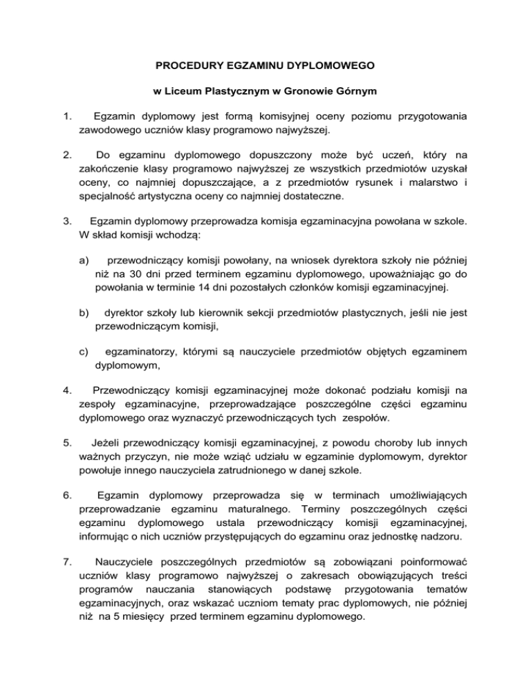 PROCEDURY EGZAMINU DYPLOMOWEGO w Liceum Plastycznym w Gronowie Górnym 1. Egzamin dyplomowy jest formą komisyjnej oceny poziomu przygotowania zawodowego uczniów klasy programowo najwyższej. 2. Do egzaminu dyplomowego dopuszczony może być uczeń, który na zakończenie klasy programowo najwyższej ze wszystkich przedmiotów uzyskał oceny, co najmniej dopuszczające, a z przedmiotów rysunek i malarstwo i specjalność artystyczna oceny co najmniej dostateczne. 3. Egzamin dyplomowy przeprowadza komisja egzaminacyjna powołana w szkole. W skład komisji wchodzą: a) przewodniczący komisji powołany, na wniosek dyrektora szkoły nie później niż na 30 dni przed terminem egzaminu dyplomowego, upoważniając go do powołania w terminie 14 dni pozostałych członków komisji egzaminacyjnej. b) dyrektor szkoły lub kierownik sekcji przedmiotów plastycznych, jeśli nie jest przewodniczącym komisji, c) egzaminatorzy, którymi są nauczyciele przedmiotów objętych egzaminem dyplomowym, 4. Przewodniczący komisji egzaminacyjnej może dokonać podziału komisji na zespoły egzaminacyjne, przeprowadzające poszczególne części egzaminu dyplomowego oraz wyznaczyć przewodniczących tych zespołów. 5. Jeżeli przewodniczący komisji egzaminacyjnej, z powodu choroby lub innych ważnych przyczyn, nie może wziąć udziału w egzaminie dyplomowym, dyrektor powołuje innego nauczyciela zatrudnionego w danej szkole. 6. Egzamin dyplomowy przeprowadza się w terminach umożliwiających przeprowadzanie egzaminu maturalnego. Terminy poszczególnych części egzaminu dyplomowego ustala przewodniczący komisji egzaminacyjnej, informując o nich uczniów przystępujących do egzaminu oraz jednostkę nadzoru. 7. Nauczyciele poszczególnych przedmiotów są zobowiązani poinformować uczniów klasy programowo najwyższej o zakresach obowiązujących treści programów nauczania stanowiących podstawę przygotowania tematów egzaminacyjnych, oraz wskazać uczniom tematy prac dyplomowych, nie później niż na 5 miesięcy przed terminem egzaminu dyplomowego. 8. Obserwatorami egzaminu dyplomowego mogą być przedstawiciele ministra właściwego do spraw kultury i dziedzictwa narodowego, jednostki nadzoru, szkół wyższych oraz związków zrzeszających artystów, ale nie uczestniczą w przeprowadzaniu egzaminu dyplomowego ani ustalaniu jego wyników. 9. Egzamin dyplomowy obejmuje: a) część praktyczną polegającą na prezentacji i obronie pracy dyplomowej z zakresu specjalności artystycznej, Przy prezentacji i obronie pracy praktycznej uczniowie dodatkowo dokonują prezentacji prac towarzyszących dyplomowi (aneks) z zakresu rysunku oraz rzeźby lub malarstwa. b) część ustną z historii sztuki zdawaną na poziomie podstawowym. Laureat lub finalista olimpiady artystycznej jest zwolniony z części ustnej egzaminu dyplomowego. Zwolnienie jest równoznaczne z uzyskaniem oceny celującej z tej części egzaminu. 10. Kolejność zdawania poszczególnych części egzaminu dyplomowego ustala przewodniczący komisji egzaminacyjnej. 11. Uczeń powinien złożyć gotową pracę dyplomową, aneks oraz ich cyfrowy zapis nie później niż na tydzień przed wystawieniem ocen końcoworocznych. 12. Tematy egzaminacyjne z historii sztuki przygotowuje egzaminator lub zespół egzaminacyjny, a zatwierdza przewodniczący komisji egzaminacyjnej, opatrując je podpisem oraz podłużną pieczęcią szkoły. Tematów egzaminacyjnych nie udostępnia się uczniom, przechowuje je przewodniczący komisji. Zakres treści tematów egzaminacyjnych jest zgodny z podstawą programową na poziomie podstawowym. 13. Część ustna egzaminu dyplomowego obejmuje: Zestawy egzaminacyjne zawierające trzy tematy do omówienia. Z przygotowanych zestawów egzaminacyjnych uczeń losuje jeden zestaw. Zamiana wylosowanego zestawu na inny jest niedozwolona. Uczeń otrzymuje 20 minut na przygotowanie odpowiedzi. Po wylosowaniu zestawu egzaminacyjnego uczeń nie opuszcza sali, poza uzasadnionymi przypadkami i za zgodą przewodniczącego komisji, przed zakończeniem egzaminu. Nieuzasadnione opuszczenie sali jest równoznaczne z odstąpieniem od egzaminu dyplomowego. Czas trwania egzaminu z historii sztuki nie może przekroczyć 60 minut wraz z przygotowaniem, a komisja może w tym czasie egzaminować tylko jednego ucznia. Zestawy z historii sztuki obejmują szczegółowo następujące zagadnienia. Treści nauczania: 1. Terminy i pojęcia z zakresu sztuk pięknych. 2. Gatunki i techniki sztuk plastycznych. 3. Chronologia i charakterystyka epok, stylów i kierunków w sztuce: starożytnej (Egipt, Grecja, Rzym, w tym sztuka wczesnochrześcijańska), średniowiecznej (sztuka bizantyńska, romańska, gotycka), nowożytnej (renesans, manieryzm, barok, rokoko), XIX wieku (od klasycyzmu po secesję), XX wieku (kierunki i tendencje w sztuce do 1970 r.). 4. Twórczość wybranych artystów. 5. Dzieło sztuki - forma, treść, funkcja na tle uwarunkowań historycznokulturowych. 6. Mecenat artystyczny i jego wpływ na kształt dzieła artystycznego na wybranych przykładach. 7. Najważniejsze muzea i zbiory dzieł sztuki w Polsce i na świecie. Osiągnięcia uczniów: 1. Znajomość terminów i pojęć z zakresu sztuk pięknych, w tym gatunków i technik sztuk plastycznych. 2. Dokonywanie chronologicznego przeglądu dziejów sztuk plastycznych i przedstawianie charakterystyki poszczególnych epok, stylów i kierunków, w tym pod kątem treści i środków plastycznych. 3. Dostrzeganie i charakterystyka podstawowych cech twórczości wybitnych artystów i szkół artystycznych. 4. Wiązanie dzieła sztuki i zjawisk artystycznych z uwarunkowaniami historyczno-kulturowymi (funkcje sztuki i środowisko powstania dzieła). 5. Znajomość pojęcia mecenatu artystycznego i umiejętność określania jego wpływu na kształt dzieła. 6. Opisywanie i analizowanie dzieła sztuki pod względem formy i treści. 7. Znajomość podstawowych tematów treści dzieł. 8. Um