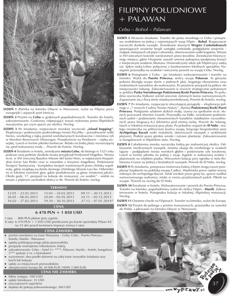 FILIPINY POŁUDNIOWE + PALAWAN Cebu – Bohol – Palawan DZIEŃ 5 Wczesne śniadanie. Transfer do portu morskiego w Cebu i przeprawa wodolotem na jedną z najmniejszych wysp Filipin - Bohol. Rozpoczęcie wycieczki dookoła wysepki. Zwiedzanie sławnych Wzgórz Czekoladowych sprawiających wrażenie kropli zastygłej czekolady, podglądanie tarsjerów małpek mniejszych od pięści człowieka, obserwowanie walki kogutów. Wizyta w XVI wiecznym kościele wzniesionym przez Jezuitów. Zwiedzanie historycznego miejsca, gdzie Hiszpanie zawarli umowę pokojową (podpisaną krwią!) z miejscowym wodzem Sikatuna. Doświadczymy także jak Filipińczycy sadzą ryż. Spływ rzeką Loboc połączony z kosztowaniem lokalnych specjałów. Następnie przesiadka na wodolot i wieczorny powrót na wyspę Cebu. Nocleg. DZIEŃ 6 Pożegnanie z Cebu - po śniadaniu wykwaterowanie i transfer na lotnisko. Wylot do Puerto Princesa, stolicy wyspy Palawan. Ta górzysta pokryta dżunglą wyspa słynie z pięknych plaż, bogatego ekosystemu oraz znakomitych warunków do nurkowania. Po przylocie przejazd na północ do miejscowości Sabang. Zakwaterowanie w resorcie strategicznie położonym w pobliżu Parku Narodowego Podziemnej Rzeki Puerto Princesa. Po południu wycieczka łódkami wśród wiecznie zielonych lasów namorzynowych. Zapoznanie się z florą strefy międzyzwrotnikowej. Powrót do hotelu, nocleg. DZIEŃ 1 Zbiórka na lotnisku Okęcie w Warszawie, wylot na Filipiny przez europejski i azjatycki port lotniczy. DZIEŃ 2 Przylot na Cebu w godzinach popołudniowych. Transfer do hotelu, zakwaterowanie. Gratisowy, odprężający masaż wykonany przez filipińskich masażystów, po czym spacer po okolicy. Nocleg. DZIEŃ 7 Po śniadaniu, rozpoczęcie ekscytującej przygody – eksploracja jednego z „7 nowych Cudów Świata Natury”, słynnej Podziemnej Rzeki Puert Princesa. Podążanie szlakiem dzikich małp, szansa na spotkanie m.in. dużych jaszczurek Monitor Lizards. Przesiadka na łódki, zwiedzanie podziemnych jaskiń i podziwianie niesamowitych kształtów stalaktytów wyrzeźbionych przez biegnącą 8,2 kilometra pod ziemią rzekę. Powrót do Sabang, lunch w lokalnej restauracji przy plaży. Po południu wyjazd do El Nido - małego miasteczka na północnym krańcu wyspy, leżącego bezpośrednio przy Archipelagu Bacuit (setki malutkich, dziewiczych wysepek z urokliwymi plażami). Podróż przez górskie wioski i ryżowe plantacje. Zakwaterowanie w bungalowach w filipińskim stylu. Nocleg. DZIEŃ 3 Po śniadaniu, rozpoczęcie morskiej wycieczki „island hopping”. Eksploracja i podziwianie podwodnego świata Pacyfiku – poszukiwanie rybki Nemo, snorkeling z fajką pośród wielobarwnych koralowców i mnóstwa ryb w Morskim Rezerwacie Hilutungan. Przepłyniecie na Pandanon – rajską wysepkę. Lunch w formie pikniku barbecue. Relaks na białej plaży wynurzającej DZIEŃ 8 Całodzienna morska wycieczka łodzią po malowniczej okolicy. Odsię spod turkusowej wody… Powrót do hotelu. Nocleg. krywanie niezliczonych wysepek, świetna okazja do snorkelingu w wodach DZIEŃ 4 Śniadanie w hotelu, zwiedzanie miasta Cebu, do którego w 1521 roku laguny - podglądanie świata morskich głębin i podziwianie rafy koralowej. podczas swej podróży dookoła świata przypłynął Ferdynand Magellan. Wizyta Lunch w formie pikniku na jednej z wysp. Kąpiele w turkusowej wodzie i m.in. w XVI wiecznej Bazylice Minore del Santo Nino, w najstarszym hiszpańplażowanie na miękkim piasku. Wieczorem kolacja przy ognisku w stylu Roskim forcie San Pedro oraz w rotundzie z Krzyżem Magellana. Podziwianie binsona Crusoe na jednej z bezludnych wysepek. Powrót do El Nido, nocleg. Świątyni Taoistycznej - kompleksu świątyń wzniesionych przez chińską wspól- DZIEŃ 9 Po śniadaniu, przeprawa motorową łodzią (chętni mogą nawet przenotę, gdzie znajdują sią dzieła słynnego chińskiego filozofa Lao-Tse. Odwiedzipłynąć kajakiem) na pobliską wyspę Cadlao. Wędrówka przez rajskie tereny ny w lokalnej wytwórni gitar, gdzie produkowane są gitary światowej jakości. należące do archipelagu Bacuit. Szlak wiedzie przez gesty las, spacer wzdłuż Około godz. 17, przejazd na kolacje do restauracji „na wodzie” - widok na namorzynowego wybrzeża, relaks w cieniu przybrzeżnych jaskiń. Piknik na miasto z pięknym zachodem słońca w tle. Powrót do hotelu, nocleg. wyspie. Powrót na nocleg do El Nido. TERMINY 12.01 – 23.01.2013 26.01 – 06.02.2013 16.02 – 27.02.2013 13.03 – 24.03.2013 24.04 – 05.05.2013 19.10 – 30.10.2013 09.11 – 20.11.2013 24.11 – 05.12.2013 27.12 – 07.01.2014* CENA 6 470 PLN + 1 850 USD DZIEŃ 10 Śniadanie w hotelu. Wykwaterowanie i powrót do Puerto Princesa. Transfer na lotnisko, popołudniowy wylot do stolicy Filipin - Manili. Zakwaterowanie w hotelu. Pożegnalna kolacja w lokalnej, filipińskiej restauracji. Nocleg. DZIEŃ 11 Ostatnie chwile na Filipinach. Transfer na lotnisko, wylot do Europy. DZIEŃ 12 Przylot do jednego z portów tranzytowych, przesiadka na samolot do Polski. Lądowanie na lotnisku Okęcie w Warszawie. I rata: 800 PLN płatne przy zapisie II rata: 6 470 PLN + 1 850 USD przeliczone po kursie sprzedaży Pekao SA na 35 dni przed terminem imprezy (minus I rata) CENA ZAWIERA ·przelot samolotem na trasie Warszawa – Cebu; Cebu - Puerto Princesa – Manila; Manila - Warszawa · opiekę polskojęzycznego pilota-przewodnika · przejazdy wewnętrzne mikrobusem, łodzią ·zakwaterowanie: Cebu – hotel 4+ ****; Palawan, Manila – hotele, bungalowy 3*** (pokoje 2-os. z łazienkami) ·wyżywienie: dwa posiłki dziennie na całej trasie (wszystkie śniadania oraz lunch lub kolacja) · opłaty za miejscowych przewodników · ubezpieczenie Europa (KL 30 000 EUR i NNW 3 000 EUR) CENA NIE ZAWIERA · · · · bilety wstępu: 100 USD opłaty lotniskowe: 35 USD zwyczajowych napiwków dopłata do pokoju jednoosobowego: 560 USD 37