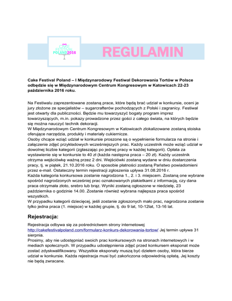 REGULAMIN Cake Festival Poland – I Międzynarodowy Festiwal Dekorowania Tortów w Polsce odbędzie się w Międzynarodowym Centrum Kongresowym w Katowicach 22-23 października 2016 roku. Na Festiwalu zaprezentowane zostaną prace, które będą brać udział w konkursie, oceni je jury złożone ze specjalistów – sugarcrafterów pochodzących z Polski i zagranicy. Festiwal jest otwarty dla publiczności. Będzie mu towarzyszyć bogaty program imprez towarzyszących, m.in. pokazy prowadzone przez gości z całego świata, na których będzie się można nauczyć technik dekoracji. W Międzynarodowym Centrum Kongresowym w Katowicach zlokalizowane zostaną stoiska oferujące narzędzia, produkty i materiały cukiernicze. Osoby chcące wziąć udział w konkursie proszone są o wypełnienie formularza na stronie i załączenie zdjęć przykładowych wcześniejszych prac. Każdy uczestnik może wziąć udział w dowolnej liczbie kategorii (zgłaszając po jednej pracy w każdej kategorii). Opłata za wystawienie się w konkursie to 40 zł (każda następna praca – 20 zł). Każdy uczestnik otrzyma wejściówkę ważną przez 2 dni. Wejściówki zostaną wydane w dniu dostarczenia pracy, tj. w piątek, 21.10.2016 roku. O sposobie płatności zostaną Państwo powiadomieni przez e-mail. Ostateczny termin rejestracji zgłoszenia upływa 31.08.2016 r. Każda kategoria konkursowa zostanie nagrodzona 1., 2. i 3. miejscem. Zostaną one wybrane spośród nagrodzonych wcześniej prac oznakowanych plakietkami z informacją, czy dana praca otrzymała złoto, srebro lub brąz. Wyniki zostaną ogłoszone w niedzielę, 23 października o godzinie 14.00. Zostanie również wybrana najlepsza praca spośród wszystkich. W przypadku kategorii dziecięcej, jeśli zostanie zgłoszonych mało prac, nagrodzona zostanie tylko jedna praca (1. miejsce) w każdej grupie, tj. do 9 lat, 10-12lat, 13-16 lat. Rejestracja: Rejestracja odbywa się za pośrednictwem strony internetowej http://cakefestivalpoland.com/formularz-konkurs-dekorowania-tortow/ Jej termin upływa 31 sierpnia. Prosimy, aby nie udostępniać swoich prac konkursowych na stronach internetowych i w mediach społecznych. W przypadku udostępnienia zdjęć przed konkursem eksponat może zostać zdyskwalifikowany. Wszystkie eksponaty muszą być dziełem osoby, która bierze udział w konkursie. Każda rejestracja musi być zakończona odpowiednią opłatą. Jej koszty nie będą zwracane. Do zgłoszenia online muszą być dołączone przynajmniej 2 zdjęcia wcześniej wykonanych prac (nie dotyczy kategorii dziecięcej), najlepiej w danej kategorii konkursowej (niewymagane). Jeśli zostanie zarejestrowana większa liczba zgłoszeń niż przewidziana pojemność hali wystawowej, jury wybierze uczestników, którzy przejdą do drugiego etapu konkursu. Ten proces będzie przeprowadzony na podstawie zdjęć przesłanych podczas rejestracji. Każdy rejestrujący się będzie poinformowany e-mailem o przyjęciu zgłoszenia, a następnie o dalszych szczegółach. Osobom, które nie zostaną zakwalifikowane, zostanie zwrócone 90% opłaty. Dostawa pracy konkursowej: Wszystkie prace konkursowe muszą być dostarczone w piątek, 21 października w godzinach 16.00-18.00. Da to dość czasu sędziom na obejrzenie wszystkich eksponatów (konkurs trwa tylko 2 dni). Każdy uczestnik po przybyciu zarejestruje się, zostanie mu przydzielone miejsce na wystawienie eksponatu. Organizatorzy rezerwują sobie prawo do przeniesienia/przestawienia eksponatów w razie potrzeby. Będzie również dostępna przestrzeń do dokonania podstawowych napraw uszkodzeń, które mogły powstać podczas transportu. Uczestnicy proszeni są o przyniesienie swojego kompletu narzędzi. Pojemniki, w których były transportowanie eksponaty, muszą być usunięte z wystawy zaraz po dostawie oraz przywiezione z powrotem na odbiór eksponatu (przestrzeń na przechowywanie opakowań nie będzie dostępna). Każdy uczestnik może mieć jednego pomocnika do rozstawienia prac konkursowych. Po ustawieniu prac należy natychmiast opuścić halę. Na wystawę można wrócić w sobotę (proszę mieć przy sobie wyjściówkę). Uczestnicy konkursu otrzymają potwierdzenia udziału (konieczne do przedstawienia w dniu przywiezienia pracy). Plakietki referencyjne uczestnika: Uczestnikowi wystawy zostaną wydane 2 plakietki (identyfikatory). Prosimy o doczepienie jednej plakietki do swojej pracy konkursowej, tak aby była widoczna dla sędziów, drugą natomiast prosimy doczepić do podstawy pracy konkursowej w celach bezpieczeństwa. Po doczepieniu plakietek prosi się uczestnika o ustawienie eksponatu na wyznaczonym miejscu (przydzielane wg kategorii i nr). Po wyeksponowaniu swojej pracy otrzymają Państwo plakietkę uczestnika konkursu (musi być ona noszona podczas trwania konkursu). Bezpieczeństwo: Pomimo zastosowania zasad bezpieczeństwa organizatorzy nie biorą odpowiedzialności za ewentualne uszkodzenia lub zgubienie eksponatu, sprzętu lub rzeczy osobistych. Prawa własności do twórczości: Biorąc udział w konkursie, wykonawca zezwala aby prace były fotografowane, a zdjęcia udostępniane i wykorzystywane przez organizatora w przyszłości. Zdjęcia: Zdjęcia zwycięskich prac mogą być publikowane w magazynach, mediach społecznościowych lub w telewizji. Usunięcie prac z wystawy: Wszystkie prace konkursowe muszą być usunięte po godzinie 17.00 w niedzielę, 23 października, nie wcześniej. Prace pozostawione po godzinie 18.00 zostaną zniszczone przez organizatora. Wyniki: Ocena prac zostanie dokonana w piątek przed otwarciem wystawy. Wyniki zostaną ogłoszone w sobotę do godziny 14.00. 1., 2. 3. miejsce w każdej kategorii zostanie ogłoszone w niedzielę. Spotkanie z sędziami: Aby dowiedzieć się, czym kierowali się sędziowie, należy z nimi porozmawiać w niedzielę. Zachęca się uczestników do rozmowy z przewodniczącym składu sędziowskiego, by uzyskać dalsze wskazówk