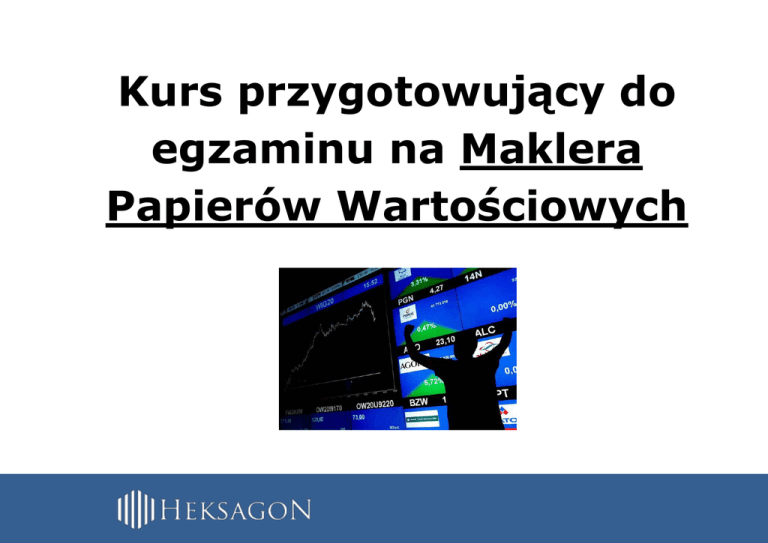 Kurs przygotowujący do egzaminu na Maklera Papierów Wartościowych Osoba prowadząca: PIOTR BIBRZYCKI Doświadczenie biznesowe zdobywał pracując jako doradca finansowy jednej z czołowych firm doradztwa finansowego w Polsce. Posiada licencję maklera papierów wartościowych z uprawnieniami do czynności doradztwa inwestycyjnego. Uczestnik wielu szkoleń i konferencji z zakresu rynku kapitałowego, w tym m.in. prowadzonej przez Giełdę Papierów Wartościowych „Szkoły giełdowej" oraz kursu realizowanego przez Fundację Edukacji Rynku Kapitałowego we współpracy z Fundacją Promocji i Akredytacji Kierunków Ekonomicznych, pod Patronatem Komisji Nadzoru Finansowego oraz Giełdy Papierów Wartościowych. Posiada również European Computer Driving Licence. Od maja do września 2010 roku był zatrudniony na stanowisku Asystenta ds. Inwestycji w Katowickim oddziale Noble Banku, a następnie w październiku 2010 roku został zatrudniony na stanowisku Analityka Rynku Kapitałowego w firmie Polskie Doradztwo Finansowe sp. z o. o. gdzie pracuje do dziś. Prezes firmy Europejskie Centrum Informacji Finansowej sp. z o. o. Od roku 2008 stale związany z branżą szkoleniową – prowadził szereg kursów przygotowujących do egzaminu na licencjonowanego Maklera Papierów Wartościowych oraz wiele szkoleń z zakresu finansów. Jeśli zależy Ci na zdobyciu licencji maklera to jesteś w odpowiednim miejscu i w odpowiednim czasie! Piotr Bibrzycki zadba o to abyś perfekcyjnie przygotował się do egzaminu i nie tylko. Pokaże Ci na podstawie własnego, wieloletniego doświadczenia, w jaki sposób jako makler pozycjonować się na rynku pracy i wprowadzi Cię do skomplikowanego świata GPW. Cel nadrzędny szkolenia Kompletne i kompetentne przygotowane uczestników szkolenia do egzaminu na licencjonowanego Maklera Papierów Wartościowych z uprawnieniami do wykonywania czynności doradztwa inwestycyjnego przeprowadzanego przez Komisję Nadzoru Finansowego. Cel programowy szkolenia Zdobycie przez uczestników szkolenia szerokiej wiedzy teoretycznej z zakresu finansów i inwestycji ze szczególnym naciskiem na zagadnienia bezpośrednio powiązane z rynkiem kapitałowym i działaniem Giełdy Papierów Wartościowych. Poznanie zasad panujących na rynku kapitałowym oraz zrozumienie zasad notowań instrumentów finansowych przekładające się na lepsze zrozumienie zasad inwestowania. Dla kogo przeznaczone jest szkolenie Szkolenie przeznaczone jest dla osób zainteresowanych uzyskaniem licencji Maklera Papierów Wartościowych, a także dla osób chcących znacząco poszerzyć swoją wiedzę z zakresu rynku kapitałowego. Ogólny program szkolenia Szkolenie w standardowej wersji obejmuje jedenaście spotkań z których każde trwa sześć godzin zegarowych. W trakcie kursu przeprowadzane są cykliczne testy wiedzy, które mobilizują uczestników do systematycznej nauki. Szczegółowy program spotkań: ZAJĘCIA I podstawowe informacje na temat egzaminu wskazówki dotyczące planowania nauki co tak naprawdę trzeba wiedzieć na egzamin w jaki sposób uczyć się prawa omówienie regulaminu GPW i Szczegółowych Zasad Obrotu Giełdowego zagadnienia związane z matematyką finansową – podstawy teoretyczne ZAJĘCIA II matematyka finansowa – rozwiązywanie zadań z testów z lat ubiegłych test z regulaminu GPW i Szczegółowych Zasad Obrotu Giełdowego omówienie ustawy o obrocie i rozporządzeń do niej zagadnienia dotyczące ustalania kursów na Giełdzie Papierów Wartościowych: o rodzaje zleceń na GPW o arkusz zleceń o dopuszczalne wahania kursów o zasada ustalania cen transakcji giełdowych rozwiązywanie zadań z ustalania kursów ZAJĘCIA III kontynuacja rozwiązywania zadań z ustalania kursów zagadnienia dotyczące wyceny instrumentów dłużnych – podstawy teoretyczne: m.in o rodzaje instrumentów dłużnych: bony skarbowe, obligacje skarbowe, korporacyjne oraz samorządowe o różne rodzaje ryzyka związanego z instrumentami dłużnymi o wycena obligacji o duration Macaulaya o zmodyfikowane duration o wypukłość obligacji (convexity) o podstawowe strategie inwestycyjne związane z obligacjami ZAJĘCIA IV wycena instrumentów dłużnych - rozwiązywanie zadań test z przerobionego dotychczas prawa omówienie ustawy o obligacjach, o nadzorze nad rynkiem kapitałowym i finansowym oraz o giełdach towarowych zagadnienia związane z analizą finansową – podstawy teoretyczne:m.in o analiza: struktury bilansu, rachunku zysków i strat, rachunku o analiza struktury kapitałowej w przedsiębiorstwie – sposoby finansowania działalności o dźwignia operacyjna i finansowa, dźwignia łączna o pojęcie średniego ważonego kosztu kapitału (WACC) ZAJĘCIA V ZAJĘCIA VII analiza finansowa – rozwiązywanie zadań test z przerobionego dotychczas prawa omówienie ustawy o funduszach inwestycyjnych, o ofercie publicznej i etyki zagadnienia związane z wyceną akcji - podstawy teoretyczne: o rodzaje metod wyceny: metody majątkowe, dochodowe, porównawcze i mieszane o model Williamsa, o model Gordona, o model zysku rezydualnego, wycena spółki połączona z wartościami FCFF oraz FCFE o wycena spółki połączona z wartościami FCFF oraz FCFE o metody wyceny związane z enterprise value – wady i zalety ZAJĘCIA VI wycena akcji – rozwiązywanie zadań test z przerobionego dotychczas prawa omówienie ustawy o rachunkowości i regulaminu CeTO zagadnienia dotyczące instrumentów pochodnych – podstawy teoretyczne: o rodzaje operacji: zabezpieczające, arbitrażowe, spekulacyjne, giełdowe i pozagiełdowe instrumenty pochodne o futures a forward – rodzaje, wycena, czynniki warunkujące cenę kontraktu, podstawowe własności opcji, wartość wewnętrzna, wartość czasowa, wykorzystanie opcji instrumenty pochodne – rozwiązywanie zadań test z przerobionego dotychczas prawa zagadnienia dotyczące teorii portfelowej – podstawy teoretyczne: o stopa zwrotu, współczynnik zmienno