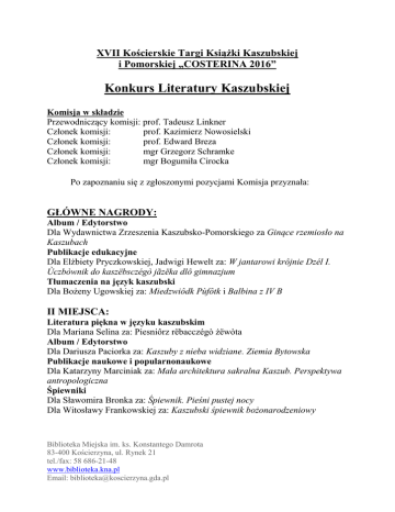 XVII Kościerskie Targi Książki Kaszubskiej i Pomorskiej „COSTERINA 2016” Konkurs Literatury Kaszubskiej Komisja w składzie Przewodniczący komisji: prof. Tadeusz Linkner Członek komisji: prof. Kazimierz Nowosielski Członek komisji: prof. Edward Breza Członek komisji: mgr Grzegorz Schramke Członek komisji: mgr Bogumiła Cirocka Po zapoznaniu się z zgłoszonymi pozycjami Komisja przyznała: GŁÓWNE NAGRODY: Album / Edytorstwo Dla Wydawnictwa Zrzeszenia Kaszubsko-Pomorskiego za Ginące rzemiosło na Kaszubach Publikacje edukacyjne Dla Elżbiety Pryczkowskiej, Jadwigi Hewelt za: W jantarowi krôjnie Dzél I. Ùczbòwnik do kaszëbsczégò jãzëka dlô gimnazjum Tłumaczenia na język kaszubski Dla Bożeny Ugowskiej za: Miedzwiôdk Pùfôtk i Balbina z IV B II MIEJSCA: Literatura piękna w języku kaszubskim Dla Mariana Selina za: Piesniôrz rëbacczégò żëwòta Album / Edytorstwo Dla Dariusza Paciorka za: Kaszuby z nieba widziane. Ziemia Bytowska Publikacje naukowe i popularnonaukowe Dla Katarzyny Marciniak za: Mała architektura sakralna Kaszub. Perspektywa antropologiczna Śpiewniki Dla Sławomira Bronka za: Śpiewnik. Pieśni pustej nocy Dla Witosławy Frankowskiej za: Kaszubski śpiewnik bożonarodzeniowy Biblioteka Miejska im. ks. Konstantego Damrota 83-400 Kościerzyna, ul. Rynek 21 tel./fax: 58 686-21-48 www.biblioteka.kna.pl Email: [email protected] III MIEJSCA: Album / Edytorstwo Dla Cezarego Obracht-Prondzyńskiego, Kazimierza Rolbieckiego za: Bytowskie szlaki. Atrakcje, niespodzianki i tajemnice zapisane w przestrzeni Publikacje naukowe i popularnonaukowe Dla Hanny Makurat za: Poezja twórców z kręgu „Klëki” Dla Daniela Kalinowskiego za: Żydzi polscy i pomorscy. Studia o ludziach i literaturze Śpiewniki Dla Wacława Kirkowskiego za: Starzno, mòja wies. Pieśni kaszubskie WYRÓŻNIENIA: Literatura piękna w języku kaszubskim Jerzego Stachurskiego za: Lustro rzeki Dla Stanisława Jankego, Macieja Tamkuna za: Szescdzesątka Album / Edytorstwo Dla Macieja Kurpiewskiego za: Wejherowa dawny czar. Miasto i okolice w fotografii Augustyna Ziemensa (1867-1948) Biblioteka Miejska im. ks. Konstantego Damrota 83-400 Kościerzyna, ul. Rynek 21 tel./fax: 58 686-21-48 www.biblioteka.kna.pl Email: [email protected] XVII Kościerskie Targi Książki Kaszubskiej i Pomorskiej „COSTERINA 2016” Konkurs Literatury Pomorskiej Komisja w składzie Przewodniczący komisji: prof. Tadeusz Linkner Członek komisji: prof. Kazimierz Nowosielski Członek komisji: prof. Edward Breza Członek komisji: mgr Grzegorz Schramke Członek komisji: mgr Bogumiła Cirocka Po zapoznaniu się z zgłoszonymi pozycjami Komisja przyznała: GŁÓWNE NAGRODY: Proza Dla Zbigniewa Zielonki za: I ona ma zielone oczy Literatura dziecięca i młodzieżowa Dla Jolanty Nitkowskiej-Węglarz za: Wyprawa do Krainy Baśni Albumy Dla Sławomira Świetlika za: Tuchola pięknie... Opracowania naukowe i eseje Dla Krzysztofa Gradowskiego za: Pomorska emigracja do Brazylii II MIEJSCA: Poezja Dla Gabrieli Szubstarskiej za: Zamglenia Dla Jana P. Grabowskiego za: W czerni i w bieli Proza Dla Andrzeja Grzyba za: Ana. Rozbite lustro Reportaże i wspomnienia Dla Kazimierza Sopucha za: Dziennik pokładowy. Lata siedemdziesiąte Dla Jacka Borkowicza za: Ludwiga Passarge’a, Z wiślanej delty. Tczew, Gdańsk, Żuławy, Malbork. Szkice z podróży 1856 Albumy Dla Jacka Kriegseisena za: Dekoracje architektoniczne Gdańska 1945-1989 Opracowania naukowe i eseje Dla Janusza Trupinda za: KS Gedania – klub gdańskich Polaków (1922-1953) Biblioteka Miejska im. ks. Konstantego Damrota 83-400 Kościerzyna, ul. Rynek 21 tel./fax: 58 686-21-48 www.biblioteka.kna.pl Email: [email protected] Dla Krzysztofa Jażdżewskiego za: Historia lasów gdańskich. Od dóbr oliwskich i puckich do Nadleśnictwa Gdańsk III MIEJSCA: Proza Dla Adama Hlebowicza za: Pułapka na ptaki Literatura dziecięca i młodzieżowa Dla Anny Czerwińskiej-Rydel za: Zdobyć koronę. Opowieść o Jerzym Kukuczce Reportaże i wspomnienia Dla Katarzyny Banuchy, Bartosza Filipa za: Czytanie Pomorza. Literacki przewodnik po regionie Albumy Dla Waldemara Nocnego za: Plaże i kąpieliska Mierzei Wiślanej Opracowania naukowe i eseje Dla Klausa-Dietera Kreplina za: Jedzenie picie spanie. Karczmy i gospody w dawnym powiecie bytowskim (do 1945 roku) WYRÓŻNIENIA: Translacja Dla Brygidy Jerzewskiej za: Karla Rosenowa, Legendy i Opowieści Ziemi Darłowskiej Ponadto została przyznana nagroda specjalna Burmistrza Miasta Kościerzyna: Nagroda specjalna Dla Edwarda Brezy za: Słowo Pańskie trwa na wieki. Ze studiów nad słownictwem religijnym i obyczajowym Podpisy członków Komisji Biblioteka Miejska im. ks. Konstantego Damrota 83-400 Kościerzyna, ul. Rynek 21 tel./fax: 58 686-21-48 www.biblioteka.kna.pl Email: [email protected]