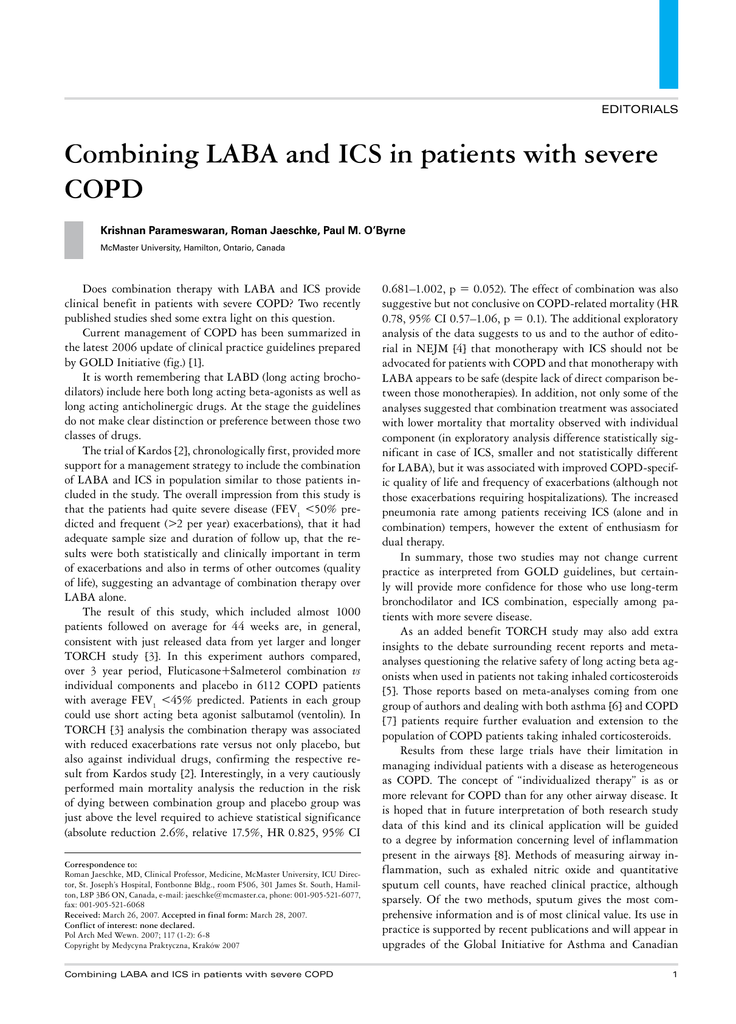 EDITORIALS Combining LABA and ICS in patients with severe COPD Krishnan Parameswaran, Roman Jaeschke, Paul M. O’Byrne McMaster University, Hamilton, Ontario, Canada Does combination therapy with LABA and ICS provide clinical benefit in patients with severe COPD? Two recently published studies shed some extra light on this question. Current management of COPD has been summarized in the latest 2006 update of clinical practice guidelines prepared by GOLD Initiative (fig.) [1]. It is worth remembering that LABD (long acting brochodilators) include here both long acting beta-agonists as well as long acting anticholinergic drugs. At the stage the guidelines do not make clear distinction or preference between those two classes of drugs. The trial of Kardos [2], chronologically first, provided more support for a management strategy to include the combination of LABA and ICS in population similar to those patients included in the study. The overall impression from this study is that the patients had quite severe disease (FEV1 <50% predicted and frequent (>2 per year) exacerbations), that it had adequate sample size and duration of follow up, that the results were both statistically and clinically important in term of exacerbations and also in terms of other outcomes (quality of life), suggesting an advantage of combination therapy over LABA alone. The result of this study, which included almost 1000 patients followed on average for 44 weeks are, in general, consistent with just released data from yet larger and longer TORCH study [3]. In this experiment authors compared, over 3 year period, Fluticasone+Salmeterol combination vs individual components and placebo in 6112 COPD patients with average FEV1 <45% predicted. Patients in each group could use short acting beta agonist salbutamol (ventolin). In TORCH [3] analysis the combination therapy was associated with reduced exacerbations rate versus not only placebo, but also against individual drugs, confirming the respective result from Kardos study [2]. Interestingly, in a very cautiously performed main mortality analysis the reduction in the risk of dying between combination group and placebo group was just above the level required to achieve statistical significance (absolute reduction 2.6%, relative 17.5%, HR 0.825, 95% CI Correspondence to: Roman Jaeschke, MD, Clinical Professor, Medicine, McMaster University, ICU Director, St. Joseph’s Hospital, Fontbonne Bldg., room F506, 301 James St. South, Hamilton, L8P 3B6 ON, Canada, e-mail: [email protected], phone: 001-905-521-6077, fax: 001-905-521-6068 Received: March 26, 2007. Accepted in final form: March 28, 2007. Conflict of interest: none declared. Pol Arch Med Wewn. 2007; 117 (1-2): 6-8 Copyright by Medycyna Praktyczna, Kraków 2007 Combining LABA and ICS in patients with severe COPD 0.681–1.002, p = 0.052). The effect of combination was also suggestive but not conclusive on COPD-related mortality (HR 0.78, 95% CI 0.57–1.06, p = 0.1). The additional exploratory analysis of the data suggests to us and to the author of editorial in NEJM [4] that monotherapy with ICS should not be advocated for patients with COPD and that monotherapy with LABA appears to be safe (despite lack of direct comparison between those monotherapies). In addition, not only some of the analyses suggested that combination treatment was associated with lower mortality that mortality observed with individual component (in exploratory analysis difference statistically significant in case of ICS, smaller and not statistically different for LABA), but it was associated with improved COPD-specific quality of life and frequency of exacerbations (although not those exacerbations requiring hospitalizations). The increased pneumonia rate among patients receiving ICS (alone and in combination) tempers, however the extent of enthusiasm for dual therapy. In summary, those two studies may not change current practice as interpreted from GOLD guidelines, but certainly will provide more confidence for those who use long-term bronchodilator and ICS combination, especially among patients with more severe disease. As an added benefit TORCH study may also add extra insights to the debate surrounding recent reports and metaanalyses questioning the relative safety of long acting beta agonists when used in patients not taking inhaled corticosteroids [5]. Those reports based on meta-analyses coming from one group of authors and dealing with both asthma [6] and COPD [7] patients require further evaluation and extension to the population of COPD patients taking inhaled corticosteroids. Results from these large trials have their limitation in managing individual patients with a disease as heterogeneous as COPD. The concept of “individualized therapy” is as or more relevant for COPD than for any other airway disease. It is hoped that in future interpretation of both research study data of this kind and its clinical application will be guided to a degree by information concerning level of inflammation present in the airways [8]. Methods of measuring airway inflammation, such as exhaled nitric oxide and quantitative sputum cell counts, have reached clinical practice, although sparsely. Of the two methods, sputum gives the most comprehensive information and is of most clinical value. Its use in practice is supported by recent publications and will appear in upgrades of the Global Initiative for Asthma and Canadian EDITORIALS I: mild III: severe II: moderate IV: very severe FEV1/FVC <0,70 FEV1/FVC <0,70 FEV1/FVC <0,70 FEV1/FVC <0,70 30% ≤FEV1<50% predicted 50% ≤FEV1<80% predicted FEV1<30% predicted or FEV1 <50% predicted plus chronic respiratory failure FEV1 ≥80% predicted active reduction of risk factor(s); influenza vaccination add short-acting bronchodilator (when needed) add regular treatment with one or more long-acting bronchodilators (when needed); add rehabilitation add inhaled glucocorticosteroids if repeated exacerbations add lon
