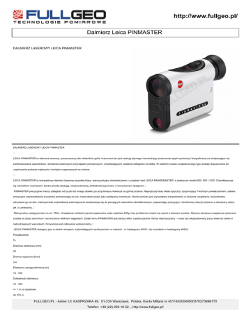 http://www.fullgeo.pl/ Dalmierz Leica PINMASTER DALMIERZ LASEROWY LEICA PINMASTER DALMIERZ LASEROWY LEICA PINMASTER LEICA PINMASTER to dalmierz laserowy, przeznaczony dla miłośników golfa. Instrument ten jest reakcją słynnego niemieckiego producenta optyki sportowej i fotograficznej na zwiększające się zainteresowanie zawodników i amatorów laserowymi przyrządami pomiarowymi, umożliwiającymi ustalenie odległości od dołka. W ostatnim czasie urządzenia tego typu zostały dopuszczone do użytkowania podczas większości turniejów rozgrywanych na świecie. LEICA PINMASTER to kompaktowy dalmierz laserowy wysokiej klasy, wykorzystujący doświadczenia z urządzeń serii LEICA RANGEMASTER, a zwłaszcza modeli 800, 900 i 1200. Charakteryzuje się niewielkimi rozmiarami, bardzo prostą obsługą, niezawodnością, dokładnością pomiaru i nowoczesnym designem. PINMASTER precyzyjnie mierzy odległość od tyczki lub innego obiektu po przyciśnięciu klawisza na górnej ściance. Najwyższej klasy układ optyczny, dysponujący 7-krotnym powiększeniem, ułatwia precyzyjne naprowadzenie znacznika pomiarowego na cel, może także służyć jako podręczny monokular. Wynik pomiaru jest wyświetlany bezpośrednio w okularze urządzenia, bez potrzeby odrywania go od oka. Intensywność wyświetlania automatycznie dostosowuje się do panujących warunków oświetleniowych, zapewniając precyzyjny i komfortowy odczyt zarówno w słoneczny dzień, jak i o zmierzchu. Maksymalny zasięg pomiaru to ok. 750m. Urządzenie wielkości paczki papierosów waży zaledwie 220g i bez problemów mieści się nawet w kieszeni szortów. Stylowa obudowa urządzenia wykonana została ze stopu aluminium i wzmocniona włóknem węglowym. Dzięki temu PINMASTER jest bardzo lekki, a jednocześnie niemal niezniszczalny – może być eksploatowany przez wiele lat nawet w najtrudniejszych warunkach. Oczywiście jest całkowicie wodoszczelny. LEICA PINMASTER dostępny jest w dwóch wersjach, wyświetlających wynik pomiaru w metrach - nr katalogowy 40531, lub w jardach nr katalogowy 40532. Powiększenie 7x Średnica obiektywu [mm] 24 Żrenica wyjściowa [mm] 3.4 Efektywny zasięg dalmierza [m] 10 - 750 Dokładność dalmierza 10 - 750 +/- 1 m na dystansie do 375 m FULLGEO.PL - Adres: Ul. KASPRZAKA 49, 01-234 Warszawa, Polska, Konto MBank nr 45114020040000370273896170 Telefon: +48 (22) 250 16 52 ,, http://www.fullgeo.pl/ +/- 2 m na dystansie http://www.fullgeo.pl/ do 750 m +/- 0.5% na dystansie od 750 m Odstęp źrenicy [mm] 15 Sprawność zmierzchowa 13 Pole widzenia na dystansie 1000m 115 Kąt widzenia [°] 6.6 Korekcja dioptryczna +/- 3.5 dioptrii Pryzmat dachowy, P40 z powłokami z korekcją fazową Wodoszczelność IP65 - do głębokości 1 m Zasilanie bateria litowa CR2 (3V) Wydajność baterii ok 2000 pomiarów Waga [g] 220 Wymiary (długość x wysokość x szerokość) [mm] 113 x 75 x 34 W zestawie futerał z cordury, pasek na rękę, bateria Gwarancja 2 lata Zestaw zawiera : Lornetka Leica PINMASTER osłona okularów i obiektywów futerał cordura neoprenowy pasek na rękę bateria instrukcja karta gwarancyjna ogólnoświatowa gwarancja Leica Camera okres trwania gwarancji - 2 lata FULLGEO.PL - Adres: Ul. KASPRZAKA 49, 01-234 Warszawa, Polska, Konto MBank nr 45114020040000370273896170 Telefon: +48 (22) 250 16 52 ,, http://www.fullgeo.pl/ http://www.fullgeo.pl/ FULLGEO.PL - Adres: Ul. KASPRZAKA 49, 01-234 Warszawa, Polska, Konto MBank nr 45114020040000370273896170 Telefon: +48 (22) 250 16 52 ,, http://www.fullgeo.pl/