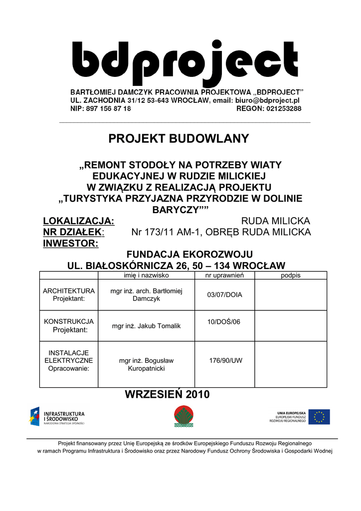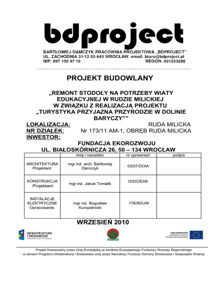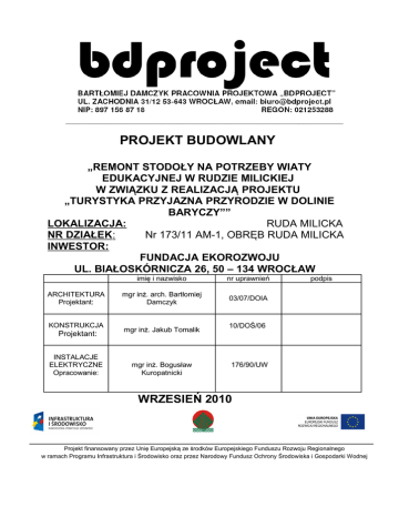 _____________________________________________________________________ PROJEKT BUDOWLANY „REMONT STODOŁY NA POTRZEBY WIATY EDUKACYJNEJ W RUDZIE MILICKIEJ W ZWIĄZKU Z REALIZACJĄ PROJEKTU „TURYSTYKA PRZYJAZNA PRZYRODZIE W DOLINIE BARYCZY”” LOKALIZACJA: RUDA MILICKA Nr 173/11 AM-1, OBRĘB RUDA MILICKA NR DZIAŁEK: INWESTOR: FUNDACJA EKOROZWOJU UL. BIAŁOSKÓRNICZA 26, 50 – 134 WROCŁAW ARCHITEKTURA Projektant: KONSTRUKCJA Projektant: INSTALACJE ELEKTRYCZNE Opracowanie: imię i nazwisko nr uprawnień mgr inż. arch. Bartłomiej Damczyk 03/07/DOIA mgr inż. Jakub Tomalik mgr inż. Bogusław Kuropatnicki podpis 10/DOŚ/06 176/90/UW WRZESIEŃ 2010 Projekt finansowany przez Unię Europejską ze środków Europejskiego Funduszu Rozwoju Regionalnego w ramach Programu Infrastruktura i Środowisko oraz przez Narodowy Fundusz Ochrony Środowiska i Gospodarki Wodnej Spis treści: 1 . Załączniki – dokumenty formalno - prawne 1.1. Oświadczenia projektantów o wykonaniu projektu zgodnie z obowiązującymi przepisami oraz zasadami wiedzy technicznej . 1.2. Uprawnienia zawodowe oraz przynależności do izb zawodowych. 1.3. Kopie decyzji, warunków technicznych i uzgodnień: 1.3.1 Zaświadczenie organu odpowiedzialnego za monitoring obszarów NATURA 2000 1.3.2 Opinia Wojewódzkiego Urzędu Ochrony zabytków we Wrocławiu 2. Opis techniczny- projekt zagospodarowania terenu Podstawa opracowania 2.2 Przedmiot inwestycji oraz kolejność realizacji 2.3 Istniejący stan zagospodarowania działek 2.4 Opis projektowanego zagospodarowania terenu 2.5 Opis projektowanych sieci uzbrojenia terenu. 2.6 Bilans terenu 2.7 Informacja i dane dotyczące przewidywanych zagrożeń dla środowiska oraz higieny i zdrowia użytkowników 2.8 Informacja o zgodności inwestycji z planem miejscowym 2.9 Ochrona terenu inwestycji 2.10 Wpływ eksploatacji górniczej 2.11 Oddziaływanie na środowisko 2.12 Warunki bhp, wykonastwo robót 2.1 3. Opis techniczny- projekt architektoniczno - budowlany 3.1 Przeznaczenie i program użytkowy obiektu. 3.2 Forma architektoniczna obiektu. Funkcja obiektu budowlanego 3.3 Opis techniczny konstrukcji 3.3.1 Normy 3.3.2 Użyte materiały konstrukcyjne i izolacyjne 3.3.3 Przyjęte obciążenia zmienne od wiatru 3.3.4 przyjęte obciążenia zmienne od śniegu 3.3.5 Warunki gruntowo – wodne 3.3.6 Konstrukcja obiektu 3.3.7 Ocena stanu technicznego konstrukcji 3.3.8 Planowane prace budowlane 3.4 Dostępność obiektu dla osób niepełnosprawnych 3.5 Główne elementy budowlane 3.6 Instalacje: 3.6.1 Instalacja oświetlenia i gniazd wtykowych 3.6.2 Instalacja odgromowa 3.6.3 Instalacja przeciwporażeniowa i połączenia wyrównawcze 3.6.4 Ochrona przeciwprzepięciowa 3.7 Wpływ obiektu budowlanego na środowisko, zdrowie ludzi i obiekty sąsiednie: 3.7.1 Bilans wody i ścieków 3.7.2 Emisja zanieczyszczeń gazowych, pyłów etc. 3.7.3 Rodzaj i ilość wytwarzanych odpadów 3.7.4 Emisja hałasu oraz wibracji 3.7.5 Wpływ obiektu budowlanego na istniejący drzewostan, glebę, wody 3.8 Warunki ochrony przeciwpożarowej 3.9 Informacja BIOZ 3.10 Informacja dotycząca odstąpienia od zatwierdzonego projektu budowlanego. 4. Rysunki 1. Plan zagospodarowania terenu skala 1:500 2. Rzut przyziemia skala 1:50 3. Rzut więźby dachowej skala 1:50 4. Rzut dachu skala 1:50 5. Przekrój A -A skala 1:50 6. Przekrój B -B skala 1:50 7. Przekrój C -C skala 1:50 8. Elewacja frontowa, detal bramy skala 1:50 9. Elewacja tylna skala 1:50 10. Elewacje boczne skala 1:50 11. Rzut przyziemia – instalacje elektryczne skala 1:50 12. Rzut dachu – instalacje odgromowa skala 1:50 13. Schemat tablicy elektrycznej skala 1:50 14. Zestawienie stali konstrukcyjnej 2. Opis techniczny- projekt zagospodarowania terenu 2.1 Podstawa opracowania: Podstawą opracowania są: • Zlecenie inwestora • Obowiązujący Miejscowy Plan Zagospodarowania przestrzennego • Charakterystyka całego przedsięwzięcia • Podkład sytuacyjno-wysokościowy w skali 1:500 do celów projektowych; • Wizja lokalna • Obowiązujące normy i przepisy • Uzgodnienia z Inwestorem • Uzgodnienia z zarządcą gruntu 2.2 Przedmiot inwestycji oraz kolejność realizacji : Przedmiotem inwestycji jest remont istniejącego zabytkowego budynku stodoły na potrzeby adaptacji na wiatę edukacyjną służącą do celów edukacji ekologicznej położonej w miejscowości Ruda Milicka. Teren leży w obrębie Parku Krajobrazowego „Dolina Baryczy” oraz w granicach obszaru specjalnej ochrony ptaków „Dolina Baryczy” ( kod obszaru PLB 20001) objętego ochroną jako część Europejskiej Sieci Ekologicznej Natura 2000. Niedaleko znajduje się granica rezerwatu przyrody „Stawy Milickie” Kompleks Stawno. Planowane zamierzenie będzie uzupełnieniem infrastruktury turystycznej na obszarze Parku Krajobrazowego Doliny Baryczy, stanowić będzie dodatkową atrakcję turystyczną i jest nawiązaniem do istniejącej i projektowanej infrastruktury turystycznej. Realizacja wiaty edukacyjnej stanowi element projektu „Turystyka przyjazna przyrodzie w Parku Krajobrazowym Dolina Baryczy”. Będzie powiązana funkcjonalnie z położonym na tej samej działce zabytkowym budyniem gajówki. Cały kompleks w przyszłości będzie pełnił funkcję turystyczną w kontekście edukacji ekologicznej i przyrodniczej. Remont gajówki objęty będzie odrębnym opracowaniem w przyszłości. Nie przewiduje się etapowania budowy samej wiaty, lecz w przyszłości planuje się także adaptację budynku gajówki, jak wspomniano powyżej. Wszystkie te planowane w przyszłości przedsięwzięcia objęte będą odrębnym opracowaniem. W obiekcie przyjmowane będą osoby indywidualne oraz niewielkie grupy korzystające z infrastruktury turystycznej i edukacyjnej w kompleksie Stawno. Jest to obiekt stanowiący uzupełnienie oferty turystycznej i edukacyjnej związanej z gęstą siecią szlaków pieszych i rowerowych oraz z infrastrukturą do obserwacji ptaków w okolicach Rudy Milickie