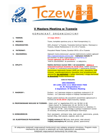 V Masters Meeting w Tczewie KOMUNIKAT ORGANIZACYJNY 1. TERMIN: 14 maja 2016 r. 2. MIEJSCE: Tczew, kompleks sportowy przy ul. Marii Konopnickiej 11; 3. ORGANIZATOR: UKS „Krawiec” w Tczewie, Tczewskie Centrum Sportu i Rekreacji w Tczewie, Szkoła Podstawowa nr 10 z OI w Tczewie. 4. PATRONAT: Prezydent Miasta Tczewa, Dyrektor SP10 z OI w Tczewie 5. ZGŁOSZENIA: Zgłoszeń można dokonywać: poprzez elektroniczny system zgłoszeń http://zgloszeniatczew.ominis.net/ - najlepsza metoda !!! lub emailem na adres organizatora ([email protected]) Termin zgłoszeń: do 03.05.2016 r. "KARTA ZGŁOSZENIA" do powielenia - w załączeniu; 6. OPŁATY: Opłata startowa wynosi 20zł / od zawodnika – płatne w nieprzekraczalnym terminie do 10.05.2016. Opłata upoważnia do udziału w 4 wybranych konkurencjach + ewentualnie kamień. Indywidualni Rekordziści Świata (WMA lub LSW), zawodnicy UKS Krawiec, współorganizatorzy zawodów oraz przedstawiciele sponsorów są zwolnieni z opłaty startowej i mogą startować w dowolnej liczbie konkurencji. DANE DO PRZELEWU: UKS KRAWIEC 09 1240 1242 1111 0010 0443 7555 Ul. M. Konopnickiej 11 Z dopiskiem: IV Masters Meeting 7. NAGRODY : Puchary - za 3 pierwsze miejsca w czwórboju rzutowym K i M Puchary - za 3 pierwsze miejsca w trójboju oszczepniczym M Bogaty pakiet startowy dla wszystkich zawodników zgłoszonych w terminie do 03.05.2016r (fajna koszulka, napoje) 8. PROPONOWANE NOCLEGI W TCZEWIE: - Hotel „Link” ul. Jagiellońska 55 E, tel: 58 562 14 48 - Hotel „Carina” Al. Solidarności 19, tel: 58 531 51 88 - Pokoje Gościnne Zespołu Szkół Ekonomicznych ul. Gdańska 17, tel: (58) 531-47-98 - cena noclegu w pokoju 4 osobowym wynosi 25 zł/osobę. Konieczna jest wcześniejsza rezerwacja. 9. KONKURENCJE: Rzut oszczepem, pchnięcie kulą, dysk grecki, speerorama, granat, kamień 25kg, młot szkocki, ciężarek, skok w dal 10. KLASYFIKACJE PUCHAROWE: Trójbój rzutowy K i M (kula, dysk grecki, młot szkocki) Trójbój oszczepnicy M (oszczep, granat, speerorama) W załączeniu kolejność rozgrywanych konkurencji oraz wstępny program minutowy. Program może nieznacznie się zmienić w zależności od liczby zgłoszonych zawodników. Kolejność rozgrywanych konkurencji nie zmieni się. REGULAMIN TECHNICZNY 1. Klasyfikacja końcowa zawodów będzie prowadzona „OPEN” z uwzględnieniem kategorii wiekowej startujących. 2. W każdej konkurencji zawodnikom przysługuje sześć prób. 3. Podanie niewłaściwej kategorii wiekowej powoduje dyskwalifikację zawodnika. 4. Organizatorzy zapewniają opiekę medyczną podczas zawodów. 5. Za rzeczy zaginione podczas zawodów organizator nie ponosi odpowiedzialności. 6. Zawody odbędą się zgodnie z regulaminem i przepisami zawodów w lekkiej atletyce stosowanymi przez IAAF. 7. Organizatorzy przyznają puchary dla trzech najlepszych zawodników w trójboju rzutowym K i M, oraz trójboju oszczepniczym M, W skład trójboju rzutowego wchodzą następujące konkurencje: - dysk grecki, - pchniecie kulą, - młot szkocki, W skład trójboju oszczepniczego wchodzą następujące konkurencje: -rzut oszczepem, -rzut granatem, -speerorama, 8. Klasyfikacja w trójboju rzutowego zostanie przeprowadzona na podstawie sumy punktów zgromadzonych przez każdego zawodnika wg zajmowanych miejsc w poszczególnych konkurencjach pucharowych. 9. Punktacja: punktowane są miejsca od 1-12, za ustanowienie Rekordu Polski Weteranów zawodnik otrzyma 6 pkt extra. Miejsce Punkty: 1 12 pkt 2 11 pkt 3 10 pkt 4 9 pkt 5 8 pkt 6 7 pkt Ustanowienie lub wyrównanie Rekordu Polski Weteranów Miejsce Punkty: 7 8 9 10 11 12 6 pkt 5 pkt 4 pkt 3 pkt 2 pkt 1 pkt dodatkowe 6 pkt do punktacji 10. W przypadku remisu w klasyfikacji konkurencji indywidualnych i trójboju zdecyduje wiek zawodnika – na korzyść zawodnika starszego. 11. W ramach konkurencji: rzut oszczepem, rzut granatem i speerorama (wielobój kulowy sposobem oszczepniczym) zostanie przeprowadzony konkurs pucharowy. O klasyfikacji zdecyduje suma odległości w tych konkurencjach – wg wyników przeliczonych na wynik seniorski. 12. Zawodnicy mogą zgłaszać się w max 4 wybranych konkurencjach + kamień 25kg 13. Indywidualni Rekordziści Świata (WMA lub LSW), zawodnicy UKS Krawiec, współorganizatorzy zawodów oraz przedstawiciele sponsorów są zwolnieni z opłaty startowej i mogą startować w dowolnej liczbie konkurencji. 14. Klasyfikacja zawodników w poszczególnych konkurencjach zostanie przeprowadzona na podstawie tabel przeliczeniowych jednorocznych WMA (konkurencje klasyczne). W przypadku konkurencji nieolimpijskich klasyfikacja zostanie przeprowadzona na podstawie tabel przeliczeniowych jednorocznych opracowanych na podstawie tabel pięcioletnich (projekt własny przy współpracy z Kolegami – organizatorami innych zawodów weterańskich) Dodatkowych informacji w sprawach organizacyjnych udziela Grzegorz Tyrolski pod numerem telefonu: 601 459 708 Strona zawodów na Facebook: https://www.facebook.com/pages/Zawody-Masters-Meeting-w-Tczewie/646000945455979 Specyfikacja sprzętu rzutowego: Dysk antyczny K30 - K45 K50 -K55 K60+ M35 - M45 M50 - M55 M60 - M65 M70+ Młot szkocki waga [kg] Ciężarek 2,5 2 1,5 5 3,75 3 2,5 waga [kg] Granat 5 13 8 5 K M35 - M45 M50 - M65 M70+ Speerorama K30-K45 K50 M35-M45 M50-M65 M70+ Rzut oszczepem K30-K45 K50-K55 K60-K70 K75+ M35-M45 M50-M55 M60-M65 M70-M75 M80+ kamień wszyscy K30-K45 K50-K55 K60+ M45-M45 M50-M55 M60-M65 M70+ kula 1 K M35-M55 M60+ kula 2 1,5 1 2 1,5 1 waga [g] 600 500 400 400 800 700 600 500 400 2 1,5 2,5 2 1,5 waga [kg] 9,08 7,26 5,45 15,88 11,34 9,08 7,26 waga [g] 250g 500g 250g kula 3 2,5 2 3 2,5 2 Pchnięcie kulą K30-K45 K50-K55 K60-K70 K75+ M35-M45 M50-M55 M60-M65 M70-M75 M80+ 4 3 3 2 7,26 6 5 4 3 waga [kg] 25 Wstępny program zawodów: rzutnia oszczep lub druga szkola rzutnia kula lub dysk rzutnia kula (nowa) skocznie 09:00 granat 09:30 oszczep 10:00 speerorama skok w dal K i M 10:50 otwarcie zawodów i dekoracja trójboj