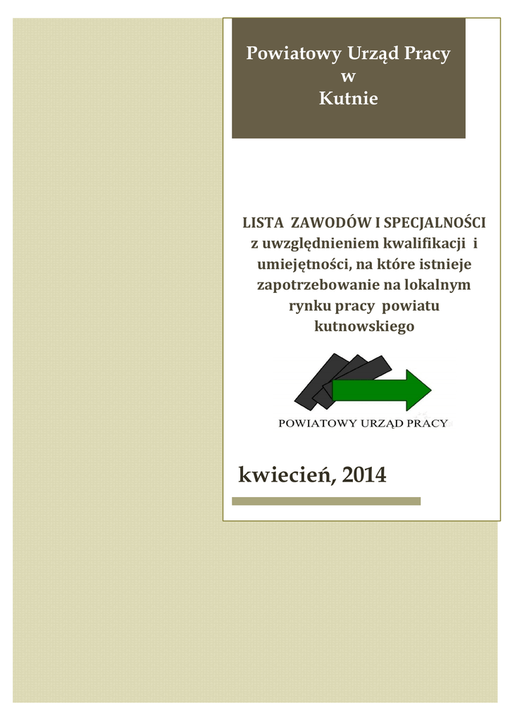 Powiatowy Urząd Pracy w Kutnie LISTA ZAWODÓW I SPECJALNOŚCI z uwzględnieniem kwalifikacji i umiejętności, na które istnieje zapotrzebowanie na lokalnym rynku pracy powiatu kutnowskiego kwiecień, 2014 rok LISTA ZAWODÓW I SPECJALNOŚCI z uwzględnieniem kwalifikacji i umiejętności, na które istnieje zapotrzebowanie na lokalnym rynku pracy powiatu kutnowskiego 2014 rok Spis treści Wprowadzenie………………………………………………………………..……………….....str.2 Analiza popytu na zawody i specjalności na podstawie zebranych informacji……................str.3 Strategia rozwoju regionalnego w zakresie zatrudnienia…………………………………….….str.5 Wyniki badań popytu na kwalifikacje i umiejętności zawodowe……………………………..str.9 Analiza ofert pracy i informacji o wolnych miejscach pracy zgłaszanych przez pracodawców oraz zamieszczanych w prasie i Internecie........................................................................................str.11 Wyniki analiz i prognoz rynku pracy…………………………………………………….…….......str.24 Analiza zawodów deficytowych i nadwyżkowych w województwie łódzkim…….............................................................................................................................................str.25 Analiza zawodów deficytowych i nadwyżkowych w powiecie kutnowskim…………....…...str.26 Analiza efektywności i skuteczności organizowanych szkoleń……………………………..…..str.35 Wskaźnik skuteczności i efektywności szkoleń…………………………………….......................str.37 Wykaz potrzeb szkoleniowych osób uprawnionych do szkolenia zarejestrowanych w Powiatowym Urzędzie Pracy w Kutnie………………………………………………………....str.53 Zgłoszenia osób uprawnionych…………………………………………………...............................str.54 Wyniki badań potrzeb szkoleniowych osób uprawnionych………………………..……...……str.55 Zgłoszenia pracowników Powiatowego Urzędu Pracy w Kutnie………………….………....…str.62 Zgłoszenia jednostek organizacyjnych pomocy społecznej oraz centów integracji społecznej.................................................................................................................................................str.66 Inne dokumenty, badania lub informacje mogące mieć istotne znaczenie przy sporządzaniu wykazu potrzeb szkoleniowych..........................................................................................................str.68 Wnioski……………………………………………………………..................................……...………str.71 1 LISTA ZAWODÓW I SPECJALNOŚCI z uwzględnieniem kwalifikacji i umiejętności, na które istnieje zapotrzebowanie na lokalnym rynku pracy powiatu kutnowskiego 2014 rok Wprowadzenie Elementarną podstawą utrzymania społeczeństwa i determinantem rozwoju jego dobrobytu jest praca zarobkowa. W stosunku do skali rozwoju społeczno gospodarczego danego kraju może ona nie zawsze zagwarantować miejsca pracy jednostkom w wieku produkcyjnym. Odsetek tych osób, które z różnych przyczyn nie podjęły zatrudnienia lub innej pracy zarobkowej w konsekwencji formuje grupę bezrobotnych. Biorąc pod uwagę źródło utrzymania społeczeństwa demografowie rozróżniają ludność na aktywną (czynną) zawodowo, która wykonuję pracę zawodową oraz grupę bierną zawodowo, która posiada inne źródła utrzymania (w tym i niezarobkowe). Aktualne a przy tym i zmieniające się wymagania lokalnego rynku pracy generują konieczność nieustannej adaptacji rodzaju zawodów i specjalności do dynamicznie zmieniającej się gospodarki. Niektóre z zawodów i specjalności są bardziej pożądane z powodu dużego zapotrzebowania na nie w określonym czasie na lokalnym rynku pracy podczas gdy inne nie są w danej chwili niezbędne. Wzrost innowacyjności firm i przedsiębiorstw dodatkowo wpływa na rozwój zapotrzebowania na nowe zawody oraz specjalności, natomiast inne ulegają modyfikacji pod kątem użyteczności lub też w ogóle przestają być potrzebne. Mając na uwadze progres technologiczny oraz bezustanną ewolucję potrzeb rynku pracy ważnym, a co za tym idzie koniecznym jest ustawiczne doskonalenie zawodowe, przekwalifikowanie lub też nabywanie nowej wiedzy i umiejętności, na które istnieje popyt na lokalnym rynku pracy. Niewystarczającym wydaje się przyuczenie do jednego zawodu, na które dodatkowo de facto nie istnieje duże zapotrzebowanie. Ważnym jest, by jednostka chcąca podjąć pracę była elastyczna kompetencyjnie, otwarta na nowe doświadczenia, rozwój zawodowy a ponadto 2 LISTA ZAWODÓW I SPECJALNOŚCI z uwzględnieniem kwalifikacji i umiejętności, na które istnieje zapotrzebowanie na lokalnym rynku pracy powiatu kutnowskiego 2014 rok mobilna, gdyż taka postawa zwiększa szansę na stałe zatrudnienie. Adaptacyjna do wymogów rynku pracy postawa nie tylko potęguje możliwości na znalezienie stałej pracy, ale także buduje poczucie mocnej pozycji jako kandydata na lokalnym rynku pracy. Fachowa wiedza na temat zapotrzebowań lokalnego rynku pracy na zawody i specjalności pozwala ocenić swoje możliwości oraz dokonać zmian w życiu zawodowym, aby utrzymać pracę, znaleźć nową lub też przygotować się na nieprzewidziane zmiany jakie może postawić ewoluujący lokalny rynek pracy. Niniejsze opracowanie ma za zadanie stanowić źródło wiedzy na temat zawodów i specjalności, na jakie aktualnie istnieje zapotrzebowanie na lokalnym rynku pracy, które będzie przydatne w opracowywaniu kierunków szkoleń, z kolei trafne ustalenie potrzeb szkoleniowych pozwoli na skuteczne przyuczenie do zawodu, przekwalifikowanie, podwyższenie kwalifikacji zawodowych lub naukę u