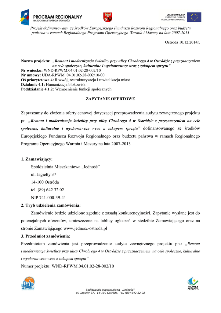 Projekt dofinansowany ze środków Europejskiego Funduszu Rozwoju Regionalnego oraz budżetu państwa w ramach Regionalnego Programu Operacyjnego Warmia i Mazury na lata 2007-2013 Ostróda 10.12.2014r. Nazwa projektu:. „Remont i modernizacja świetlicy przy ulicy Chrobrego 4 w Ostródzie z przeznaczeniem na cele społeczne, kulturalne i wychowawcze wraz z zakupem sprzętu” Nr wniosku: WND-RPWM.04.01.02-28-002/10 Nr umowy: UDA-RPWM. 04.01.02-28-002/10-00 Oś priorytetowa 4: Rozwój, restrukturyzacja i rewitalizacja miast Działanie 4.1: Humanizacja blokowisk Poddziałanie 4.1.2: Wzmocnienie funkcji społecznych ZAPYTANIE OFERTOWE Zapraszamy do złożenia oferty cenowej dotyczącej przeprowadzenia audytu zewnętrznego projektu pn. „Remont i modernizacja świetlicy przy ulicy Chrobrego 4 w Ostródzie z przeznaczeniem na cele społeczne, kulturalne i wychowawcze wraz z zakupem sprzętu” dofinansowanego ze środków Europejskiego Funduszu Rozwoju Regionalnego oraz budżetu państwa w ramach Regionalnego Programu Operacyjnego Warmia i Mazury na lata 2007-2013 1. Zamawiający: Spółdzielnia Mieszkaniowa „Jedność” ul. Jagiełły 37 14-100 Ostróda tel. (89) 642 32 02 NIP 741-000-39-41 2. Tryb udzielenia zamówienia: Zamówienie będzie udzielone zgodnie z zasadą konkurencyjności. Zapytanie wysłane jest do potencjalnych oferentów, umieszczone na tablicy ogłoszeń w siedzibie Zamawiającego oraz na stronie Zamawiającego www.jednosc-ostroda.pl 3. Przedmiot zamówienia: Przedmiotem zamówienia jest przeprowadzenie audytu zewnętrznego projektu pn.: „Remont i modernizacja świetlicy przy ulicy Chrobrego 4 w Ostródzie z przeznaczeniem na cele społeczne, kulturalne i wychowawcze wraz z zakupem sprzętu” Numer projektu: WND-RPWM.04.01.02-28-002/10 Spółdzielnia Mieszkaniowa „Jedność” ul. Jagiełły 37, 14-100 Ostróda, Tel. (89) 642 32 02 Całkowita wartość projektu: 1.112.076,22 zł Kwota wydatków kwalifikowanych: 1.112.076,22 zł Kwota dofinansowania z Europejskiego Funduszu Rozwoju Regionalnego: 945.264,78 zł Okres realizacji projektu: 02-08-2010 r. – 13-01-2012 r. Zakres planowanego audytu zewnętrznego obejmować ma prawidłowość realizacji projektu w zakresie wydatkowania i rozliczenia otrzymanego dofinansowania oraz przygotowania i wdrożenia projektu „Remont i modernizacja świetlicy przy ulicy Chrobrego 4 w Ostródzie z przeznaczeniem na cele społeczne, kulturalne i wychowawcze wraz z zakupem sprzętu” zgodnie z wytycznymi i założeniami oferty złożonej przez Wykonawcę zadania. Audyt powinien obejmować następujące obszary: 1) Gotowość organizacyjna Beneficjenta 2) Audyt zgodności projektu w zakresie finansowym 3) Audyt zgodności realizacji projektu 4) Wizyta na miejscu realizacji projektu 5) Audyt zgodności prowadzenia i archiwizowania dokumentacji 6) Audyt zgodności projektu z politykami wspólnotowymi 7) Audyt w zakresie zasad informacji i promocji Audyt zostanie przeprowadzony zgodnie z aktualnymi Wytycznymi dotyczącymi standardów audytu zewnętrznego projektów realizowanych w ramach Regionalnego Programu Operacyjnego Warmii i Mazur na lata 2007-2013, wydanymi przez Instytucję Zarządzającą, w zakresie wyboru audytora oraz prowadzenia i dokumentowania audytu zewnętrznego projektu dofinansowanego ze środków Europejskiego Funduszu Rozwoju Regionalnego w ramach Osi Priorytetowej 4, Działania 4.1, Poddziałanie 4.1.2. Szczegółowe wytyczne do przeprowadzenia audytu zewnętrznego projektu dostępne są pod adresem: http://www.rpo.warmia.mazury.pl/?page=dzial&dzial_id=376 Ponadto audyt powinien być zgodny z następującymi zapisami umowy o dofinansowanie: 1) Audyt powinien obejmować m.in. analizę dokumentacji oraz stosowanych procedur kontroli wewnętrznej w odniesieniu do przekazania i rozliczania otrzymanych środków, procedur akceptacji wydatków kwalifikowalnych w zakresie ich zasadności i odpowiedniego udokumentowania oraz sprawozdania z realizacji projektu ze szczególnym uwzględnieniem realizacji przyjętych celów projektu i realizacji postanowień Umowy o dofinansowanie. Spółdzielnia Mieszkaniowa „Jedność” ul. Jagiełły 37, 14-100 Ostróda, Tel. (89) 642 32 02 2) Beneficjent zobowiązuje się do przeprowadzenia audytu zewnętrznego w sytuacji uznania podatku VAT za koszt kwalifikowalny, niezależnie od całkowitej wartości projektu Beneficjent przeprowadza audyt zewnętrzny po poniesieniu 50% wydatków całkowitej wartości projektu. Beneficjent ma obowiązek złożenia sprawozdania z przeprowadzenia ww. audytu przed zakończeniem realizacji projektu (tj. przed złożeniem wniosku o płatność końcową). Ponadto Beneficjent ma obowiązek przeprowadzenia dodatkowego audytu przed zakończeniem okresu trwałości projektu. 3) Wyniki audytu zewnętrznego Beneficjent przekazuje do Instytucji Zarządzającej RPO WiM w terminie do 7 dni, po jego zakończeniu. 4) Audyt zewnętrzny projektu prowadzony będzie u Beneficjenta przez podmiot uprawniony do dokonywania tego rodzaju działań. Struktura raportu: Na podstawie przeprowadzonego audytu Wykonawca sporządzi raport udzielający wyczerpującej odpowiedzi na postawione pytania ewaluacyjne. Wykonawca dostarczy raport w wersji elektronicznej (CD ROM) oraz papierowej w 2 egz. Raport powinien być opracowany w języku polskim i zawierać następujący zakres: 1) podstawowe informacje o Beneficjencie i realizowanym przez niego projekcie (nazwa, adres, NIP Beneficjenta, numer i tytuł projektu, numer i tytuł umowy o dofinansowanie projektu oraz ewentualnych aneksów, całkowitą wartość projektu w tym całkowitą wartość wydatków kwalifikowalnych, poziom procentowy i kwotę dofinansowania, 2) imiona i nazwiska audytorów uczestniczących w zadaniu audytowym, 3) termin, w którym prowadzono audyt, 4) okres objęty audytem, 5) cele oraz zakres podmiotowy i przedmiotowy audytu, 6) podjęte czynności i zastosowane techniki przeprowadzania audytu, 7) informacja 