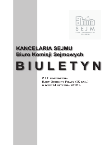 KANCELARIA SEJMU Biuro Komisji Sejmowych BIULETYN Z 17. POSIEDZENIA RADY OCHRONY PRACY (IX KAD.) W DNIU 24 STYCZNIA 2012 R. Rada Ochrony Pracy (nr 17/IX kad.) 24 stycznia 2012 r. Rada Ochrony Pracy, obradująca pod przewodnictwem poseł Izabeli Katarzyny Mrzygłockiej (PO), przewodniczącej Rady, zrealizowała następujący porządek dzienny: – przyjęcie stanowiska Rady Ochrony Pracy w sprawie realizacji zadań służby bhp oraz analizy i oceny funkcjonowania ustawy z dnia 24 czerwca 1983 r. o społecznej inspekcji pracy, – wyrażenie opinii na temat wniosku głównego inspektora pracy pani Anny Tomczyk dotyczącego odwołania pana Lesława Mandraka ze stanowiska okręgowego inspektora pracy w Opolu, – sprawozdanie z działalności Rady Ochrony Pracy w 2011 r. – materiał przygotowany przez prezydium Rady Ochrony Pracy, – plan pracy Rady Ochrony Pracy w 2012 r. – materiał przygotowany przez prezydium Rady Ochrony Pracy, – analiza i ocena kontroli związanych z problematyką prac wykonywanych w szczególnych warunkach i o szczególnym charakterze (ustawa o emeryturach pomostowych) – materiał przygotowany przez Państwową Inspekcję Pracy oraz Zakład Ubezpieczeń Społecznych, – sprawy bieżące. W posiedzeniu udział wzięli: Anna Tomczyk główny inspektor pracy wraz ze współpracownikami, Hanna Markowska wicedyrektor Departamentu Statystyki i Prognoz Aktuarialnych Zakładu Ubezpieczeń Społecznych, Wiesława Taranowska wiceprzewodnicząca OPZZ. W posiedzeniu udział wzięli pracownicy Kancelarii Sejmu: Ewa Mierosławska, Joanna Mazurkiewicz-Kulka – z sekretariatu Rady w Biurze Prawnym i Spraw Pracowniczych. Przewodnicząca Rady Ochrony Pracy Izabela Katarzyna Mrzygłocka: Otwieram posiedzenie Rady Ochrony Pracy. Witam panią minister Annę Tomczyk wraz ze współpracownikami. Witam przedstawicieli Ministerstwa Pracy i Polityki Społecznej, Ministerstwa Gospodarki oraz Zakładu Ubezpieczeń Społecznych. Witam wszystkich państwa. Jest to pierwsze posiedzenie w nowym roku. Składam wszystkim życzenia wszelkiej pomyślności, bardzo dobrego roku i wszystkiego najlepszego. Porządek dzienny posiedzenia przewiduje: pkt 1 – przyjęcie stanowiska Rady Ochrony Pracy w sprawie realizacji zadań służby bhp oraz analizy i oceny funkcjonowania ustawy z dnia 24 czerwca 1983 r. o społecznej inspekcji pracy, pkt 2 – wyrażenie opinii na temat wniosku głównego inspektora pracy pani Anny Tomczyk dotyczącego odwołania pana Lesława Mandraka ze stanowiska okręgowego inspektora pracy w Opolu, pkt 3 – sprawozdanie z działalności Rady Ochrony Pracy w 2011 r. – materiał przygotowany przez prezydium Rady Ochrony Pracy, pkt 4 – plan pracy Rady Ochrony Pracy w 2012 r. – materiał przygotowany przez prezydium Rady Ochrony Pracy, pkt 5 – analiza i ocena kontroli związanych z problematyką prac wykonywanych w szczególnych warunkach i o szczególnym charakterze (ustawa o emeryturach pomostowych) – materiał przygotowany przez Państwową Inspekcję Pracy oraz Zakład Ubezpieczeń Społecznych, pkt 6 m.k. 3 RADA OCHRONY PRACY (NR 17) – sprawy bieżące, chciałabym w tym punkcie wprowadzić zmiany do regulaminu, ale o tym będziemy rozmawiać, gdy przejdziemy do pkt 6. Kto jest za przyjęciem porządku dziennego posiedzenia? Kto jest przeciw? Kto wstrzymał się od głosu? Stwierdzam, że Rada jednogłośnie przyjęła porządek dzienny. Przechodzimy do punktu pierwszego – przyjęcie stanowiska Rady Ochrony Pracy w sprawie realizacji zadań służby bhp oraz analizy i oceny funkcjonowania ustawy z dnia 24 czerwca 1983 r. o społecznej inspekcji pracy. Proszę pana przewodniczącego Zbigniewa Żurka o przedstawienie projektu stanowiska. Zastępca przewodniczącej Rady Ochrony Pracy Zbigniew Żurek: Projekt stanowiska został opracowany metodą tradycyjną. Był konsultowany z członkami Rady. Dziękuję wszystkim państwu, którzy wzięli udział w pracowaniu projektu. Przedstawię treść projektu: „Stanowisko Rady Ochrony Pracy w sprawie realizacji zadań służby bhp oraz analizy i oceny funkcjonowania ustawy z dnia 24 czerwca 1983 r. o społecznej inspekcji pracy. Rada Ochrony Pracy przy Sejmie RP na posiedzeniu 6 grudnia 2011 r. zapoznała się z materiałami przygotowanymi przez Państwową Inspekcję Pracy oraz Ministerstwo Pracy i Polityki Społecznej na temat realizacji zadań służby bhp oraz analizy i oceny funkcjonowania ustawy z dnia 24 czerwca 1983 r. o społecznej inspekcji pracy. W 2010 r. Państwowa Inspekcja Pracy skontrolowała wykonywanie zadań służby bhp w 1280 zakładach pracy, a w okresie od stycznia do września 2011 r. – w 1042 zakładach. Podczas przeprowadzonych kontroli inspektorzy pracy stwierdzili, że najczęściej spotykaną formą wykonywania zadań służby bhp było powierzenie wykonywania tych zadań specjalistom spoza zakładu pracy. W 2010 r. co drugi, a w okresie styczeń – wrzesień 2011 r. – 58% pracodawców powierzyło wykonywanie zadań służby bhp specjalistom spoza zakładu pracy. Natomiast najrzadziej można było spotkać pracodawcę, który samodzielnie wykonuje zadania służby bhp. W 2010 r. stanowili oni zaledwie 2%, a w okresie styczeń – wrzesień 2011 r. – 1,8% pracodawców samodzielnie wykonywało zadania służby bhp. Należy podkreślić, że w okresie trzech pierwszych kwartałów 2011 r. stwierdzono 72 przypadki utworzenia służby bhp przez pracodawców, którzy nie mieli takiego obowiązku ze względu na zatrudnianie poniżej 100 pracowników. Występowały jednak przypadki nieutworzenia służby bhp pomimo zatrudniania powyżej 100 pracowników. W 2010 r. stwierdzono takie przypadki u 63 pracodawców, a w okresie styczeń – wrzesień 2011 r. – u 56 pracodawców. W trakcie kontroli inspektorzy pracy stwierdzili nieprawidłowości związane z realizacją jednego z podstawowych zadań służby bhp, jakim jest kontrola przestrzegania przepisów i zasad bhp na stanowisku pracy. Pa