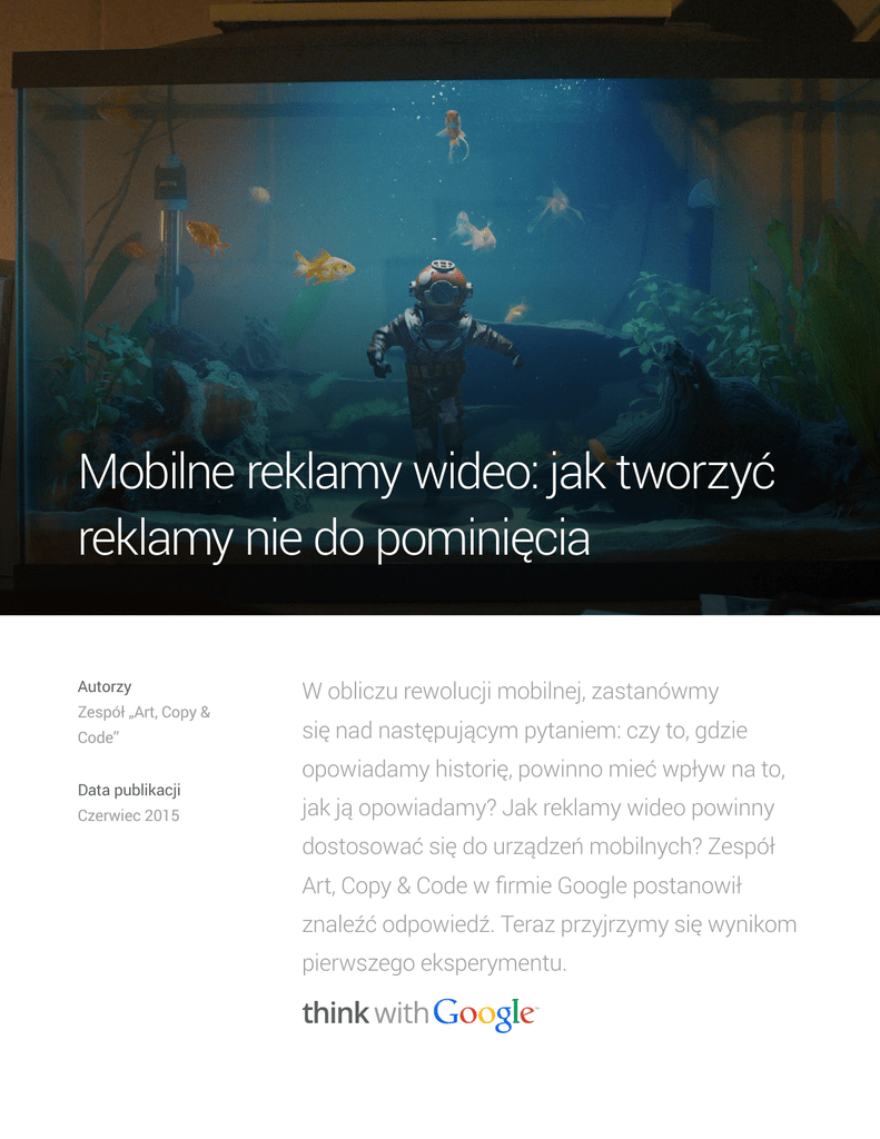 Mobilne reklamy wideo: jak tworzyć reklamy nie do pominięcia Autorzy Zespół „Art, Copy & Code” Data publikacji Czerwiec 2015 W obliczu rewolucji mobilnej, zastanówmy się nad następującym pytaniem: czy to, gdzie opowiadamy historię, powinno mieć wpływ na to, jak ją opowiadamy? Jak reklamy wideo powinny dostosować się do urządzeń mobilnych? Zespół Art, Copy & Code w firmie Google postanowił znaleźć odpowiedź. Teraz przyjrzymy się wynikom pierwszego eksperymentu. U rządzenia mobilne stały się naszymi nieodzownymi towarzyszami. Mamy je w rękach, w kieszeniach, na stolikach nocnych – gdziekolwiek jesteśmy. Często to pierwsza rzecz, na którą patrzymy rano, i jedna z ostatnich, jakie sprawdzamy przed pójściem spać. Co oznacza ta silna więź dla twórców i historii, które opowiadamy? Jak mały ekran wpływa na sposób odbierania tych historii? Twórcy reklam od dawna użalają się nad urządzeniami mobilnymi. Mały ekran to płótno, na którym opowiedzenie dużej historii jest wyzwaniem. Wiemy jednak, że marki mogą na urządzeniu mobilnym nawiązać z odbiorcą więź, która będzie głębsza i bardziej osobista niż na komputerze czy w telewizji. Gdy świat mobilny coraz bardziej skupia się na treściach wideo, marki muszą wymyślić sposób na opowiadanie nowych, lepszych historii na urządzeniach mobilnych. Przedstawiamy Laboratorium reklam nie do pominięcia Co trafia do odbiorców w mobilnych reklamach wideo? Czym różni się to od efektywnych reklam w telewizji? Tego nie wie nikt. Najlepszym sposobem na zrozumienie rozwijającego się, mobilnego świata jest eksperymentowanie: tworzenie kreacji i sprawdzanie, co naprawdę trafia do odbiorców. Za pomocą formatu reklam YouTube TrueView, który pozwala użytkownikom wybrać obejrzenie lub pominięcie reklamy, przetestowaliśmy trzy alternatywne wersje tej samej historii, aby zrozumieć, co sprawia, że reklama jest warta obejrzenia. Skorzystaliśmy też z rozwiązania „Wyniki marki” firmy Google, by monitorować takie dane jak rozpoznawalność reklamy i świadomość marki, co pozwoliło nam oceniać efektywność poszczególnych wersji. Kluczowe pytanie, na które miał odpowiedzieć eksperyment, było proste: co sprawia, że reklama jest nie do pominięcia? thinkwithgoogle.com 2 Eksperyment z reklamami wideo: „Mobilne montowanie” W ramach pierwszego eksperymentu Laboratorium reklam nie do pominięcia, zespół Google Art, Copy & Code nawiązał współpracę z Mountain Dew oraz nowojorskim oddziałem agencji BBDO i globalnym oddziałem agencji OMD, aby sprawdzić, jakie mobilne reklamy wideo odbiorcy są najbardziej skłonni obejrzeć oraz jak ich obejrzenia wpływają na wskaźniki dotyczące marki. Czy można zacząć od świetnej reklamy, dostosować ją i sprawić, że przyniesie jeszcze lepsze efekty na urządzeniach mobilnych? Na początek wzięliśmy spot Mountain Dew® Kickstart™ zatytułowany „Come Alive” – popularną reklamę, która pojawiała się w telewizji i w formacie TrueView od dwóch miesięcy i zebrała łącznie prawie dziewięć milionów obejrzeń w YouTube. Chcieliśmy sprawić, by reklama była bardziej „nie do pominięcia”, zwłaszcza na urządzeniach mobilnych. Co z tego wyszło? Aby się dowiedzieć, spójrzmy na trzy wersje mobilnej reklamy wideo, jakie przetestowaliśmy: Reklama Mountain Dew Kickstart, wersja 1: „Oryginał” Wersja: „Oryginał” posłużył nam jako wersja kontrolna w eksperymencie. To 30-sekundowy spot z trzema facetami, którzy wypijają Mountain Dew Kickstart i zaczynają tańczyć, a wszystko w piwnicy – od pluszowego thinkwithgoogle.com 3 fotela po psa – do nich dołącza. Potem wychodzą na spotkanie z nieznanym. Teoria: Stary sposób to najlepszy sposób. Reklama ma klasyczny układ z wyraźnym początkiem, środkiem i końcem. Świetna historia, świetna akcja, świetny montaż i świetna piosenka to idealne połączenie. Reklama Mountain Dew Kickstart, wersja 2: „Mocny strzał” Wersja: Ta 31-sekundowa reklama mobilna zaczyna się od uderzającego, wyrazistego zbliżenia na produkt i odliczania, co sygnalizuje, że zaraz stanie się coś fajnego. Następnie widzowie przenoszą się w sam środek akcji, a historia rozwija się od tego momentu. Teoria: Pomysł jest taki, żeby dotrzeć z marką do odbiorców, zanim pominą reklamę. Od tego momentu historia nie jest tak przejrzysta jak w „Oryginale”, ale zawiera sporo tej samej akcji. Możliwe, że reklama nie uzyska takiej samej oglądalności, ale powinna być najlepsza pod względem poprawiania wyników marki. thinkwithgoogle.com 4 Reklama Mountain Dew Kickstart, wersja 3: „Czysta zabawa” Wersja: W wersji „Czysta zabawa” widzowie trafiają w sam środek akcji, ale bez muzyki i nie wiedząc tak naprawdę, co się dzieje. Potem pojawia się muzyka i różne elementy taneczne. Ta wersja jest znacznie dłuższa niż pierwsze dwie – trwa jedną minutę i 33 sekundy. Teoria: Co się dzieje, gdy widzowie nie wiedzą, co się dzieje? Żadnej muzyki, żadnych wskazówek, żadnej fabuły. Jeśli im się spodoba, niech pojawiają się kolejne niespodziewane elementy – trofea hokejowe, tańczące psy czy slow jam ze stołem. Reklama nie ma zbyt solidnej fabuły, a marka i produkt pojawiają się po jakimś czasie, ale mniej bezpośrednio niż w pierwszych dwóch reklamach. Wnioski z eksperymentu „Mobilne montowanie” Co się okazało? Chociaż żadna z reklam nie wygrała pod względem wszystkich badanych wskaźników, doszliśmy do wniosku, że urządzenia mobilne zachęcają do nowego rodzaju kreatywności, porzucenia standardów i większego skupienia się na zabawie. To, co niespodziewane, może mieć dużą moc. Współczynniki oglądalności wszystkich trzech reklam były mniej więcej podobne, jeśli chodzi o obejrzenia na komputerach. Jednak na thinkwithgoogle.com 5 urządzeniach mobilnych zaobserwowaliśmy interesujące zjawisko. Wer