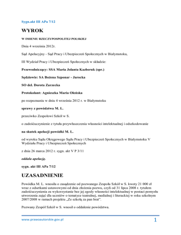 Sygn.akt III APa 7/12 WYROK W IMIENIU RZECZYPOSPOLITEJ POLSKIEJ Dnia 4 września 2012r. Sąd Apelacyjny - Sąd Pracy i Ubezpieczeń Społecznych w Białymstoku, III Wydział Pracy i Ubezpieczeń Społecznych w składzie: Przewodniczący: SSA Maria Jolanta Kazberuk (spr.) Sędziowie: SA Bożena Szponar - Jarocka SO del. Dorota Zarzecka Protokolant: Agnieszka Maria Oleńska po rozpoznaniu w dniu 4 września 2012 r. w Białymstoku sprawy z powództwa M. L. przeciwko Zespołowi Szkół w S. o zadośćuczynienie z tytułu przywłaszczenia własności intelektualnej i odszkodowanie na skutek apelacji powódki M. L. od wyroku Sądu Okręgowego Sądu Pracy i Ubezpieczeń Społecznych w Białymstoku V Wydziału Pracy i Ubezpieczeń Społecznych z dnia 26 marca 2012 r. sygn. akt V P 3/11 oddala apelację. sygn. akt III APa 7/12 UZASADNIENIE Powódka M. L. wnosiła o zasądzenie od pozwanego Zespołu Szkół w S. kwoty 21 000 zł wraz z odsetkami ustawowymi od dnia złożenia pozwu, czyli od 31 lipca 2008 r. tytułem zadośćuczynienia za wykorzystanie bez jej zgody własności intelektualnej w postaci pomysłu utworzenia zajęć dla uczniów o tematyce teatralnej, medialnej i literackiej w roku szkolnym 2007/2008 w ramach projektu „Ze szkołą za pan brat”. Pozwany Zespół Szkół w S. wnosił o oddalenie powództwa. www.prawoautorskie.gov.pl 1 Twierdził, że pracy powódki nie można traktować w kategorii własności intelektualnej, ale jako pracę na rzecz edukacji w szkole, dla dobra wspólnego. Wyrokiem z dnia 26 marca 2012 r., sygn. V P 3/11, Sąd Okręgowy w Białymstoku oddalił powództwo. Powyższy wyrok zapadł w oparciu o następujące ustalenia faktyczne i ocenę prawną: Umową o pracę z dnia 1 października 1992 r. A. L. została zatrudniona w Liceum Ogólnokształcącym im. (...). J. P. w S. (obecnie: Zespół Szkół w S.) na czas określony do 30 czerwca 1992 r. na stanowisku nauczyciela bibliotekarza. Następnie z powódką zawarto dwie następujące po sobie umowy o pracę na czas określony. Umową o pracę z 25 czerwca 1994 r. powódka została zatrudniona na czas nieokreślony. W dniu 29 maja 2007 r. powódka przedłożyła Dyrektorowi Zespołu Szkół w S. M. M. propozycję utworzenia zajęć o tematyce teatralnej, medialnej i literackiej jako element projektu „Ze szkołą za pan brat”. Na forum Rady Pedagogicznej Zespołu Szkół w S. w dniu 29 sierpnia 2007 r. dyrektor poinformował, że M. L. będzie prowadziła K. T.-M.-Literackie. Na początku września 2007 r. Dyrektor Zespołu Szkół w S. zwrócił się do nauczycieli realizujących projekt „Ze szkołą za pan brat” o wypełnienie formularzy umów zleceń, na podstawie których nauczyciele mieli prowadzić zajęcia w ramach projektu. Zawarcie tych umów potrzebne było również do rozliczenia wykonanych zadań w ramach projektu. Powódka nie wypełniła w całości druku umowy zlecenia, na podstawie której miała prowadzić zajęcia w ramach koła teatralnego. Nie wpisała numeru NIP i PESEL, które były niezbędne do skutecznego zawarcia umowy. W dniu 11 września 2007 r. Dyrektor Zespołu Szkół w S. poprosił powódkę o uzupełnienie brakujących danych. Gdy powódka ponownie nie uzupełniła wymaganych danych, dyrektor opiekę nad realizacją zajęć o tematyce teatralnej, medialnej i literackiej (koła teatralnego) powierzył A. B., która przygotowała program zajęć. Sąd Okręgowy podniósł, iż okolicznością sporną było to, czy nastąpiło bezprawne wykorzystanie własności intelektualnej M. L. w postaci pomysłu utworzenia i prowadzenia w roku szkolnym 2007/2008 w Zespole Szkół w S., zajęć o tematyce teatralnej, medialnej i literackiej w ramach programu „Ze szkołą za pan brat”. Wskazał, że regulacja dotycząca własności intelektualnej została zawarta w ustawie z dnia 4 lutego 1994 r. o prawie autorskim i prawach pokrewnych. Przedmiotem prawa autorskiego jest każdy przejaw działalności twórczej o indywidualnym charakterze, ustalony w jakiejkolwiek postaci, niezależnie od wartości, przeznaczenia i sposobu wyrażenia (utwór). Ochronie podlega każdy przejaw twórczości, również skonkretyzowana, ujawniona w dziele idea (pomysł). Zgodnie z art.8 ust.1 w/w ustawy prawo autorskie przysługuje twórcy. Twórcy przysługuje wyłączne prawo do korzystania z utworu i rozporządzania nim na wszystkich polach eksploatacji oraz do wynagrodzenia za korzystanie z utworu (art.17). Jednak pracodawca, którego pracownik stworzył utwór w wyniku wykonywania obowiązków ze stosunku pracy, nabywa z chwilą przyjęcia utworu autorskie prawa majątkowe w granicach wynikających z celu umowy o pracę i zgodnego zamiaru stron (art. 12 ust. 1). Sąd podkreślił, że art. 12 jest przepisem o charakterze względnie obowiązującym, a zatem jego dyspozycja znajduje zastosowanie tylko wówczas, jeżeli strony nie ukształtują w umowie w inny sposób autorskoprawnych aspektów dotyczących korzystania z „utworów pracowniczych”. www.prawoautorskie.gov.pl 2 Zdaniem Sądu Okręgowego, propozycja powódki zajęć o tematyce teatralnej, medialnej i literackiej jako element projektu „Ze szkołą za pan brat” została przez nią złożona w zakresie wykonywania obowiązków ze stosunku pracy. Stworzenie pomysłu w ramach zajęć o tematyce teatralnej, medialnej i literackiej należało do zakresu zadań (obowiązków) pracowniczych powódki. Obowiązki powódki zatrudnionej na stanowisku bibliotekarza szkolnego były określone w art. 6 ustawy z dnia 26 stycznia 1982 r. Karta Nauczyciela, z którego wynika, że nauczyciel obowiązany jest rzetelnie realizować zadania związane z powierzonym mu stanowiskiem oraz podstawowymi funkcjami szkoły: dydaktyczną, wychowawczą i opiekuńczą. Sąd wskazał, że strony nie zawierały żadnych umów o ochronę praw autorskich. Potwierdzili to świadkowie B. Ł. oraz M. M.. Nie można również przyjąć, że pomysł utworzenia zajęć dl