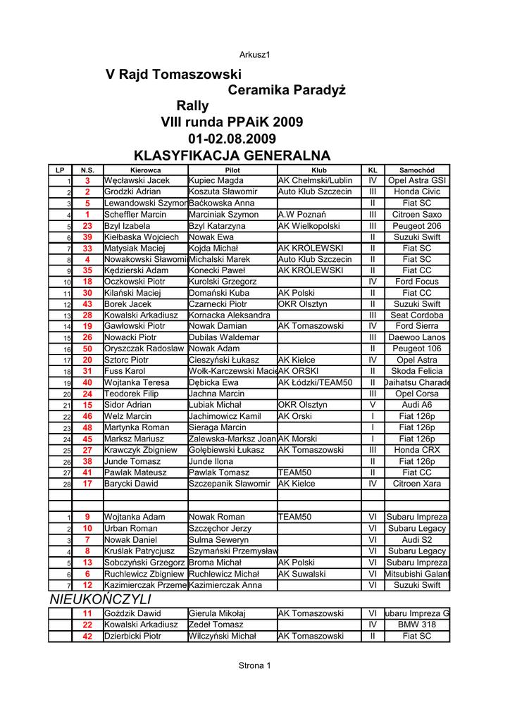 Arkusz1 V Rajd Tomaszowski Ceramika Paradyż Rally VIII runda PPAiK 2009 01-02.08.2009 KLASYFIKACJA GENERALNA LP N.S. 1 2 3 4 5 6 7 8 9 10 11 12 13 14 15 16 17 18 19 20 21 22 23 24 25 26 27 28 1 2 3 4 5 6 7 Kierowca Pilot Klub KL Samochód 3 2 5 1 23 39 33 4 35 18 30 43 28 19 26 50 20 31 40 24 15 46 48 45 27 38 41 17 Węcławski Jacek Kupiec Magda AK Chełmski/Lublin Grodzki Adrian Koszuta Sławomir Auto Klub Szczecin Lewandowski SzymonBaćkowska Anna Scheffler Marcin Marciniak Szymon A.W Poznań Bzyl Izabela Bzyl Katarzyna AK Wielkopolski Kiełbaska Wojciech Nowak Ewa Matysiak Maciej Kojda Michał AK KRÓLEWSKI Nowakowski SławomirMichalski Marek Auto Klub Szczecin Kędzierski Adam Konecki Paweł AK KRÓLEWSKI Oczkowski Piotr Kurolski Grzegorz Kilański Maciej Domański Kuba AK Polski Borek Jacek Czarnecki Piotr OKR Olsztyn Kowalski Arkadiusz Kornacka Aleksandra Gawłowski Piotr Nowak Damian AK Tomaszowski Nowacki Piotr Dubilas Waldemar Oryszczak Radoslaw Nowak Adam Sztorc Piotr Cieszyński Łukasz AK Kielce Fuss Karol Wołk-Karczewski MaciejAK ORSKI Wojtanka Teresa Dębicka Ewa AK Łódzki/TEAM50 Teodorek Filip Jachna Marcin Sidor Adrian Lubiak Michał OKR Olsztyn Welz Marcin Jachimowicz Kamil AK Orski Martynka Roman Sieraga Marcin Marksz Mariusz Zalewska-Marksz Joanna AK Morski Krawczyk Zbigniew Gołębiewski Łukasz AK Tomaszowski Junde Tomasz Junde Ilona Pawlak Mateusz Pawlak Tomasz TEAM50 Barycki Dawid Szczepanik Sławomir AK Kielce IV Opel Astra GSI III Honda Civic II Fiat SC III Citroen Saxo III Peugeot 206 II Suzuki Swift II Fiat SC II Fiat SC II Fiat CC IV Ford Focus II Fiat CC II Suzuki Swift III Seat Cordoba IV Ford Sierra III Daewoo Lanos II Peugeot 106 IV Opel Astra II Skoda Felicia II Daihatsu Charade III Opel Corsa V Audi A6 I Fiat 126p I Fiat 126p I Fiat 126p III Honda CRX II Fiat 126p II Fiat CC IV Citroen Xara 9 10 7 8 13 6 12 Wojtanka Adam Nowak Roman TEAM50 Urban Roman Szczęchor Jerzy Nowak Daniel Sulma Seweryn Kruślak Patrycjusz Szymański Przemysław Sobczyński Grzegorz Broma Michał AK Polski Ruchlewicz Zbigniew Ruchlewicz Michał AK Suwalski Kazimierczak PrzemekKazimierczak Anna VI Subaru Impreza VI Subaru Legacy VI Audi S2 VI Subaru Legacy VI Subaru Impreza VI Mitsubishi Galant VI Suzuki Swift NIEUKOŃCZYLI 11 22 42 Gożdzik Dawid Kowalski Arkadiusz Dzierbicki Piotr Gierula Mikołaj Zedeł Tomasz Wilczyński Michał Strona 1 AK Tomaszowski AK Tomaszowski VI Subaru Impreza GT IV BMW 318 II Fiat SC Arkusz1 21 36 44 25 29 47 16 32 14 34 Żelechowski Tomasz Nivette Jakub Szpociński Marcin Wielopolski Zygmunt Latos Paweł Knapiński Maciej Siwka Rafał Kłosowski Krzysztof Dembski Jan Luberadzka Monika Kutrowska Magdalena Haber Michał Wrona Patryk Pofic Maciej Janduła Mirosław Marciniak Wojciech Mazurkiewicz Anna Siemczuk Daniel Strona 2 AK Orski AK Radom AK Wielkoposki AK Szczecin AK Polski XYZ Daewoo Lanos XYZ Fiat SC II Fiat CC III Skoda Felicia III Honda Civic I Fiat 126p IV Peugeot 306 II Suzuki Swift VI Subaru Impreza II Fiat SC Arkusz1 atsu Charade ubishi Galant ru Impreza GT Strona 3 Arkusz1 Strona 4