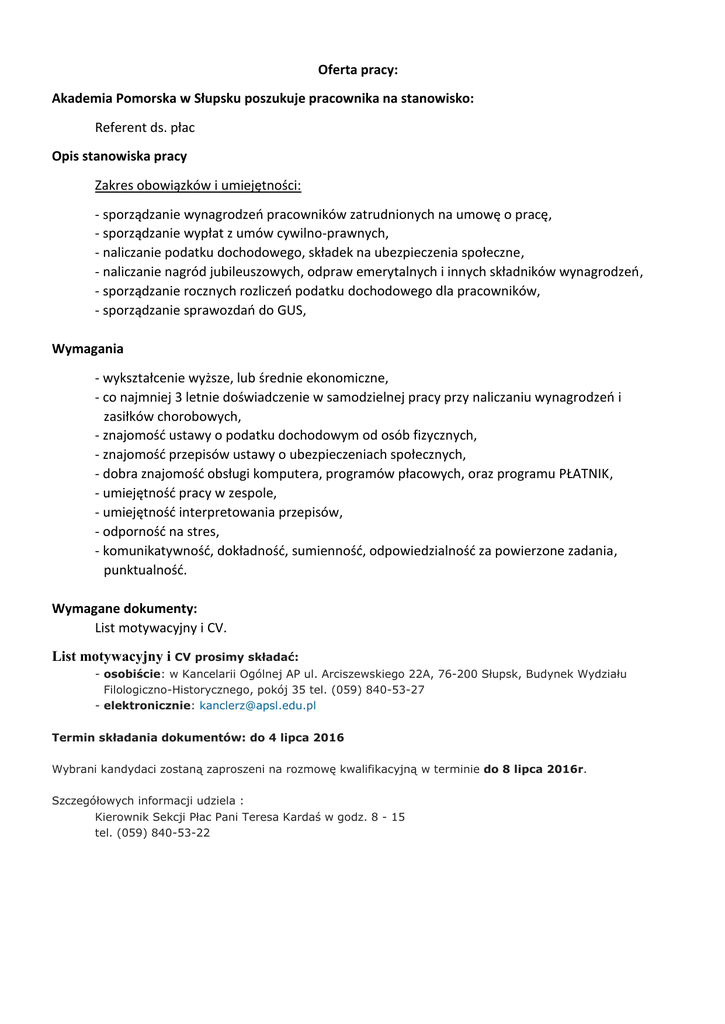 Oferta pracy: Akademia Pomorska w Słupsku poszukuje pracownika na stanowisko: Referent ds. płac Opis stanowiska pracy Zakres obowiązków i umiejętności: - sporządzanie wynagrodzeń pracowników zatrudnionych na umowę o pracę, - sporządzanie wypłat z umów cywilno-prawnych, - naliczanie podatku dochodowego, składek na ubezpieczenia społeczne, - naliczanie nagród jubileuszowych, odpraw emerytalnych i innych składników wynagrodzeń, - sporządzanie rocznych rozliczeń podatku dochodowego dla pracowników, - sporządzanie sprawozdań do GUS, Wymagania - wykształcenie wyższe, lub średnie ekonomiczne, - co najmniej 3 letnie doświadczenie w samodzielnej pracy przy naliczaniu wynagrodzeń i zasiłków chorobowych, - znajomość ustawy o podatku dochodowym od osób fizycznych, - znajomość przepisów ustawy o ubezpieczeniach społecznych, - dobra znajomość obsługi komputera, programów płacowych, oraz programu PŁATNIK, - umiejętność pracy w zespole, - umiejętność interpretowania przepisów, - odporność na stres, - komunikatywność, dokładność, sumienność, odpowiedzialność za powierzone zadania, punktualność. Wymagane dokumenty: List motywacyjny i CV. List motywacyjny i CV prosimy składać: - osobiście: w Kancelarii Ogólnej AP ul. Arciszewskiego 22A, 76-200 Słupsk, Budynek Wydziału Filologiczno-Historycznego, pokój 35 tel. (059) 840-53-27 - elektronicznie: [email protected] Termin składania dokumentów: do 4 lipca 2016 Wybrani kandydaci zostaną zaproszeni na rozmowę kwalifikacyjną w terminie do 8 lipca 2016r. Szczegółowych informacji udziela : Kierownik Sekcji Płac Pani Teresa Kardaś w godz. 8 - 15 tel. (059) 840-53-22