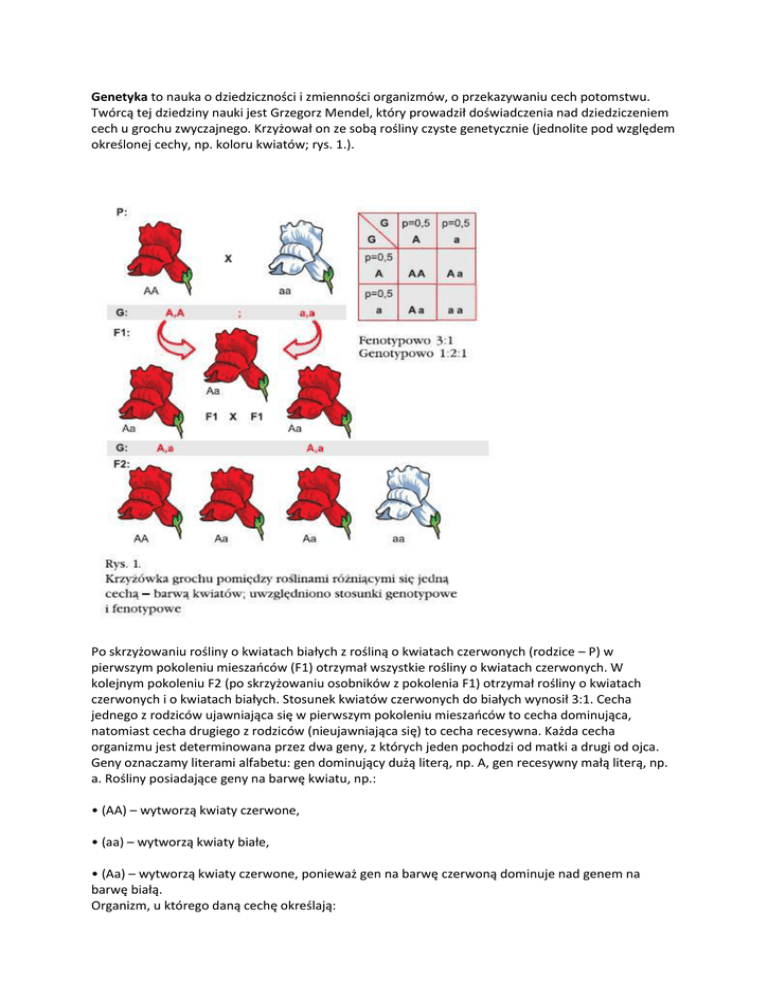Genetyka to nauka o dziedziczności i zmienności organizmów, o przekazywaniu cech potomstwu. Twórcą tej dziedziny nauki jest Grzegorz Mendel, który prowadził doświadczenia nad dziedziczeniem cech u grochu zwyczajnego. Krzyżował on ze sobą rośliny czyste genetycznie (jednolite pod względem określonej cechy, np. koloru kwiatów; rys. 1.). Po skrzyżowaniu rośliny o kwiatach białych z rośliną o kwiatach czerwonych (rodzice – P) w pierwszym pokoleniu mieszańców (F1) otrzymał wszystkie rośliny o kwiatach czerwonych. W kolejnym pokoleniu F2 (po skrzyżowaniu osobników z pokolenia F1) otrzymał rośliny o kwiatach czerwonych i o kwiatach białych. Stosunek kwiatów czerwonych do białych wynosił 3:1. Cecha jednego z rodziców ujawniająca się w pierwszym pokoleniu mieszańców to cecha dominująca, natomiast cecha drugiego z rodziców (nieujawniająca się) to cecha recesywna. Każda cecha organizmu jest determinowana przez dwa geny, z których jeden pochodzi od matki a drugi od ojca. Geny oznaczamy literami alfabetu: gen dominujący dużą literą, np. A, gen recesywny małą literą, np. a. Rośliny posiadające geny na barwę kwiatu, np.: • (AA) – wytworzą kwiaty czerwone, • (aa) – wytworzą kwiaty białe, • (Aa) – wytworzą kwiaty czerwone, ponieważ gen na barwę czerwoną dominuje nad genem na barwę białą. Organizm, u którego daną cechę określają: » dwa geny dominujące to homozygota dominująca, » dwa geny recesywne to homozygota recesywna » jeden gen dominujący, a drugi gen recesywny, to heterozygota. Genotyp to wszystkie geny organizmu. Fenotyp to wygląd zewnętrzny organizmu. W komórkach rozrodczych (gametach) występuje zawsze tylko jeden gen z pary genów określających daną cechę (I prawo Mendla). Mendel krzyżował również rośliny różniące się dwiema cechami. Wyniki jego doświadczenia przedstawia rys. 2. Geny znajdują się w chromosomach w jądrze komórkowym. Budowę chromosomu przedstawia rys.3. Liczba chromosomów jest charakterystyczna dla każdego organizmu, np. człowiek posiada w komórkach ciała 46 chromosomów (23 pary), muszka owocowa – 8 chromosomów. Geny znajdujące się w tym samym chromosomie to tzw. geny sprzężone. U człowieka 22 pary z 23 par są identyczne, czyli homologiczne. Ostatnia para to chromosomy płci, które u kobiety są takie same (XX), a u mężczyzny różne (XY). Podczas procesu wytwarzania gamet (mejozy) do komórek rozrodczych przechodzi zawsze jeden z chromosomów homologicznych i jeden z chromosomów płci. W związku z tym, u mężczyzny 50% gamet będzie posiadała chromosom X i 50% chromosom Y, a u kobiety wszystkie gamety będą zawierały chromosom X. Jeżeli komórka jajowa (zawierająca zawsze chromosom X) połączy się z plemnikiem zawierającym chromosom X – urodzi się dziewczynka, jeżeli z plemnikiem zawierającym chromosom Y – urodzi się chłopiec. Z chromosomem X związane są geny odpowiedzialne za powstawanie chorób, np.: hemofilii (słaba krzepliwość krwi) i daltonizmu (upośledzenie rozróżniania barw). Jeżeli mężczyzna otrzyma od matki gen recesywny, znajdujący się na chromosomie X, warunkujący powstanie choroby – zachoruje. Kobieta, jeżeli otrzyma od jednego z rodziców gen recesywny, będzie nosicielką, a jeśli otrzyma od obojga rodziców geny recesywne, będzie chora. Gen pod względem budowy chemicznej jest fragmentem kwasu DNA (dezoksyrybonukleinowego). Zbudowany jest z on milionów podjednostek zwanych nukleotydami. W skład nukleotydu wchodzi: reszta kwasu fosforowego, cukier deoksyryboza i jedna z czterech zasad azotowych (adenina, tymina, guanina lub cytozyna). DNA zwierząt i roślin wyższych jest dwuniciowy. Nici łączą się ze sobą zasadami azotowymi według reguły: adenina z tyminą, guanina z cytozyną (rys. 4.). Organizmy żywe wytwarzają specyficzne dla siebie białka charakteryzujące się określoną kolejnością aminokwasów. Kolejność ta jest zapisana w tzw. kodzie genetycznym. Kod genetyczny jest trójkowy, ponieważ trzy kolejno występujące nukleotydy w DNA (kodon) kodują jeden aminokwas. Zmiany np. w kodzie genetycznym, liczbie lub budowie chromosomów nazywamy mutacjami. Mutacje zachodzące w komórkach rozrodczych są dziedziczone przez kolejne pokolenia. Chorobami powstającymi w wyniku mutacji są m.in.: anemia sierpowata, fenyloketonuria, zespół Downa. W komórkach zachodzą podziały komórkowe zwane mitozą i mejozą. Mitoza to podział komórkowy, w wyniku którego komórki potomne otrzymują taka samą liczbę chromosomów jak komórki macierzyste. Mejoza to podział komórkowy zachodzący w komórkach rozrodczych (gametach). W wyniku tego podziału komórki potomne otrzymują o połowę mniej chromosomów niż komórki macierzyste. Przed podziałem komórki zarówno w mitozie, jak i w mejozie dochodzi do replikacji DNA. Replikacja DNA to podwojenie ilości kwasu dezoksyrybonukleinowego w jądrze komórkowym. Anatomia CHARAKTERYSTYKA SSAKÓW / CZŁOWIEK Układ kostny: - składa się ze szkieletu osiowego i szkieletu kończyn • szkielet osiowy czaszka: - mózgoczaszka składa się z 8 kości - trzewioczaszka składa się z 14 kości - kości połączone są szwami, które wraz z upływem wieku zanikają - szwy nie występują w czaszce stekowców i nietoperzy, bo ich kości ściśle zrastają się we wczesnej fazie rozwoju - kości potyliczne zrastają się tworząc jedną kość ( z wyjątkiem torbaczy) - w kości potylicznej jest otwór, przez który biegnie rdzeń przedłużony - dwa kłykcie potyliczne łączą się z atlasem - szczęka górna i żuchwa służą między innymi do przeżuwania pokarmu - zęby ułożone są w zębodołach, u dorosłego człowieka są 32 zęby stałe /w mlecznych brak przedtrzonowców 2)kręgosłup: - stanowi rusztowanie całego organizmu - budują go kręgi płaskie, oddzielone od siebie chrzęstnymi wstawkami o kształcie deskowatym - niektóre kopytne 