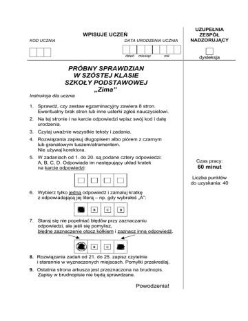 WPISUJE UCZEŃ KOD UCZNIA DATA URODZENIA UCZNIA dzień miesiąc rok UZUPEŁNIA ZESPÓŁ NADZORUJĄCY dysleksja PRÓBNY SPRAWDZIAN W SZÓSTEJ KLASIE SZKOŁY PODSTAWOWEJ „Zima” Instrukcja dla ucznia 1. Sprawdź, czy zestaw egzaminacyjny zawiera 8 stron. Ewentualny brak stron lub inne usterki zgłoś nauczycielowi. 2. Na tej stronie i na karcie odpowiedzi wpisz swój kod i datę urodzenia. 3. Czytaj uważnie wszystkie teksty i zadania. 4. Rozwiązania zapisuj długopisem albo piórem z czarnym lub granatowym tuszem/atramentem. Nie używaj korektora. 5. W zadaniach od 1. do 20. są podane cztery odpowiedzi: A, B, C, D. Odpowiada im następujący układ kratek na karcie odpowiedzi: A B C Czas pracy: 60 minut Liczba punktów do uzyskania: 40 D 6. Wybierz tylko jedną odpowiedź i zamaluj kratkę z odpowiadającą jej literą – np. gdy wybrałeś „A”: 7. Staraj się nie popełniać błędów przy zaznaczaniu odpowiedzi, ale jeśli się pomylisz, błędne zaznaczenie otocz kółkiem i zaznacz inną odpowiedź. 8. Rozwiązania zadań od 21. do 25. zapisz czytelnie i starannie w wyznaczonych miejscach. Pomyłki przekreślaj. 9. Ostatnia strona arkusza jest przeznaczona na brudnopis. Zapisy w brudnopisie nie będą sprawdzane. Powodzenia! Przeczytaj uważnie tekst. (...) Na placu najśmielsi chłopcy przywiązywali często swoje saneczki do chłopskiego wozu i jechali w ten sposób spory kawał drogi. Było to bardzo wesołe. Kiedy się w najlepsze bawili, nadjechały jakieś wielkie sanie; były pomalowane całe na biało, a w środku siedział ktoś otulony w białe futro i w białej futrzanej czapce; sanie objechały plac dwa razy dookoła. Kay przywiązał do nich szybko swoje saneczki i jechał za dużymi saniami; jechali coraz prędzej i prędzej, prosto przed siebie w najbliższą ulicę; osoba, która siedziała w saniach, odwróciła się, kiwnęła przyjaźnie do Kaya głową, zupełnie tak, jakby się znali od dawna; za każdym razem, kiedy Kay chciał odwiązać swoje saneczki, osoba znowu do niego kiwała Kay zostawał; wyjechali za bramę miasta, wtedy śnieg zaczął tak sypać, że chłopiec, jadąc dalej, nie widział nawet ręki, którą trzymał przed oczami; puścił prędko sznur od saneczek, by uwolnić się od wielkich sań, ale to nie pomogło, jego małe saneczki przywiązane były mocno i jak wiatr pędziły naprzód.(...) Płatki śniegu stawały się coraz większe i większe i w końcu wyglądały jak duże, białe kury; nagle odskoczyły na bok, wielkie sanie zatrzymały się i osoba, która w nich jechała, wyprostowała się, jej futro i czapka były całe ze śniegu; a ona sama była damą smukłą i wysoką, jaśniejącą bielą – Królową Śniegu.(...) Ściany pałacu zrobione były ze śnieżnej zawiei, a okna i drzwi z ostrych wiatrów; było tam przeszło sto sal, zależnie od tego, jak zawiał śnieg; największa sala rozciągała się wiele mil, wszystkie oświetlało silne światło zorzy polarnej; były wielkie, puste, lodowato zimne i błyszczące! Nie panowała tu nigdy radość (...). Pośrodku pustej, nieskończonej, śnieżnej sali leżało zamarznięte jezioro, które popękało na tysiąc kawałków, ale jeden kawałek był podobny do drugiego, było to prawdziwe dzieło sztuki.(...) Mały Kay był zupełnie siny z mrozu, prawie czarny, ale nie spostrzegał tego wcale, gdyż Królowa Śniegu odjęła mu swym pocałunkiem wrażliwość na zimno, a jego serce stało się kawałkiem lodu. (...) Fragment baśni H. Ch. Andersena pt. Królowa Śniegu, Warszawa 1956. Zadania od 1. do 5. odnoszą się do przedstawionego tekstu. 1. Powyższy tekst jest fragmentem baśni. W baśni A. miejsce akcji jest dokładnie określone. B. czas akcji jest dokładnie określony. C. występują postacie fantastyczne. D. występują postacie historyczne. 2. Ubiór Królowej Śniegu wykonany był A. z lodu. B. ze szronu. C. ze śniegu. D. z futra. 3. Kay A. znał Królową Śniegu i dlatego przywiązał do jej sań swoje saneczki. B. nie znał Królowej Śniegu, ale przywiązał do jej sań swoje saneczki. C. znał Królową Śniegu i dlatego zaprosił ją do wspólnej, zimowej zabawy. D. nie znał Królowej Śniegu, ale zaprosił ją do wspólnej, zimowej zabawy. 2 0 4. Które ze zdań nie jest prawdziwe? A. Kay był śmiałym chłopcem. B. Kay był otulony w białe futro. C. Kay był zupełnie siny z mrozu. D. Kay był zachwycony zabawą na placu. 5. Podkreślony w tekście na stronie 2. fragment jest A. opisem pałacu. B. opisem Królowej Śniegu. C. sprawozdaniem z wizyty w pałacu. D. opowiadaniem o mieszkańcach pałacu. 6. Gdy temperatura powietrza spada poniżej 0°C, rano na trawie zamiast rosy osadza się A. śnieg. B. grad. C. mżawka. D. szron. 7. W styczniu na półkuli południowej jest A. wiosna. B. lato. C. jesień. D. zima. Przeczytaj uważnie nuty i fragment tekstu piosenki. Sanna Soprano 1. Zima, zima, zima, pada, pada śnieg! Jadę, jadę w świat sankami, sanki dzwonią dzwoneczkami: dzyń, dzyń, dzyń, dzyń, dzyń, dzyń, dzyń, dzyń, dzyń. 2. Jaka pyszna sanna, parska raźno koń. Śnieg rozbija kopytami, sanki dzwonią dzwoneczkami: dzyń, dzyń, dzyń, dzyń, dzyń, dzyń, dzyń, dzyń, dzyń. Zadania: 8. i 9. odnoszą się do przedstawionych nut i tekstu piosenki. 8. W refrenie piosenki występują A. epitety. B. przenośnie. C. porównania. D. wyrazy dźwiękonaśladowcze. 3 9. W zapisie nutowym piosenki Sanna przeważają A. ósemki. B. ćwierćnuty. C. półnuty. D. całe nuty. 10. Który z instrumentów nie pasuje do pozostałych? A. Tamburyn. B. Dzwonki. C. Trójkąt. D. Flet. Przeczytaj ofertę księgarni. Oferta księgarni Baśnie Autor: H.Ch. Andersen Baśnie nad baśniami Autor: H. Ch. Andersen Baśnie Autor: H. Ch. Andersen Baśnie Autor: H. Ch. Andersen Wydawnictwo: Elipsa Rok wydania: 1997 Format: 215 mm x 300 mm Ilość stron: 320 Cena: 41,00 zł Wydawnictwo: Zielona Sowa Rok wydania: 2003 Format: 1,40 dm x 2 dm Ilość 