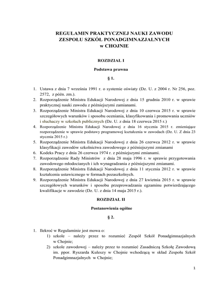 REGULAMIN PRAKTYCZNEJ NAUKI ZAWODU ZESPOŁU SZKÓŁ PONADGIMNAZJALNYCH w CHOJNIE ROZDZIAŁ I Podstawa prawna § 1. 1. Ustawa z dnia 7 września 1991 r. o systemie oświaty (Dz. U. z 2004 r. Nr 256, poz. 2572, z późn. zm.). 2. Rozporządzenie Ministra Edukacji Narodowej z dnia 15 grudnia 2010 r. w sprawie praktycznej nauki zawodu z późniejszymi zamianami. 3. Rozporządzenie Ministra Edukacji Narodowej z dnia 10 czerwca 2015 r. w sprawie szczegółowych warunków i sposobu oceniania, klasyfikowania i promowania uczniów i słuchaczy w szkołach publicznych (Dz. U. z dnia 18 czerwca 2015 r.) 4. Rozporządzenie Ministra Edukacji Narodowej z dnia 16 stycznia 2015 r. zmieniające rozporządzenie w sprawie podstawy programowej kształcenia w zawodach (Dz. U. Z dnia 23 stycznia 2015 r.) 5. Rozporządzenie Ministra Edukacji Narodowej z dnia 26 czerwca 2012 r. w sprawie klasyfikacji zawodów szkolnictwa zawodowego z późniejszymi zmianami 6. Kodeks Pracy z dnia 26 czerwca 1974 r. z późniejszymi zmianami. 7. Rozporządzenie Rady Ministrów z dnia 28 maja 1996 r. w sprawie przygotowania zawodowego młodocianych i ich wynagradzania z późniejszymi zmianami. 8. Rozporządzenie Ministra Edukacji Narodowej z dnia 11 stycznia 2012 r. w sprawie kształcenia ustawicznego w formach pozaszkolnych. 9. Rozporządzenie Ministra Edukacji Narodowej z dnia 27 kwietnia 2015 r. w sprawie szczegółowych warunków i sposobu przeprowadzania egzaminu potwierdzającego kwalifikacje w zawodzie (Dz. U. z dnia 14 maja 2015 r.). ROZDZIAŁ II Postanowienia ogólne § 2. 1. Ilekroć w Regulaminie jest mowa o: 1) szkole – należy przez to rozumieć Zespół Szkół Ponadgimnazjalnych w Chojnie; 2) szkole zawodowej – należy przez to rozumieć Zasadniczą Szkołę Zawodową im. ppor. Ryszarda Kuleszy w Chojnie wchodzącą w skład Zespołu Szkół Ponadgimnazjalnych w Chojnie; 1 3) zakładach pracy – rozumie się przez to przedsiębiorstwa, zakłady pracy instytucje państwowe oraz jednostki organizacyjne osób prawnych i fizycznych; 4) egzaminie - rozumie się przez to egzamin potwierdzający kwalifikacje w zawodzie; 5) egzaminie czeladniczym - rozumie się przez to egzamin przeprowadzany przez komisje egzaminacyjne izb rzemieślniczych; 6) Dyrektorze – rozumie się przez to Dyrektora Zespołu Szkół Ponadgimnazjalnych w Chojnie; 7) turnusy zawodowe - turnusy dokształcania i doskonalenia zawodowego dla młodocianych pracowników; 8) młodocianych pracownikach – należy przez to rozumieć uczniów szkoły; 9) uczniach i rodzicach – należy przez to rozumieć uczniów szkoły oraz ich rodziców lub prawnych opiekunów; 10) umowa o pracę – należy przez to rozumieć umowę o pracę w celu przygotowania zawodowego w formie nauki zawodu; 11) umowa – należy przez to rozumieć umowę o praktycznej nauce zawodu; 12) regulaminie – rozumie się przez to niniejszy dokument. ROZDZIAŁ III Wiadomości wstępne § 3. 1. Szkoła organizuje uczniom praktyczną naukę zawodu w formie zajęć praktycznych, a w technikum także w formie praktyk zawodowych. 2. Praktyczna nauka zawodu w formie zajęć praktycznych jest organizowana w pracowniach szkolnych lub w zakładach pracy. 3. Praktyczna nauka zawodu w formie praktyk zawodowych jest organizowana w zakładach pracy. 4. Zajęcia praktyczne mogą odbywać się u pracodawców, na zasadach dualnego systemu kształcenia, na podstawie: 1) umowy o pracę w celu przygotowania zawodowego, zawartej pomiędzy młodocianym a pracodawcą; 2) umowy o praktyczną naukę zawodu, zawartej pomiędzy Dyrektorem szkoły a pracodawcą przyjmującym uczniów na praktyczną naukę zawodu. 5. Zakres wiadomości i umiejętności nabywanych przez uczniów na zajęciach praktycznych i praktykach zawodowych oraz wymiar godzin tych zajęć i praktyk określa program nauczania dla danego zawodu dopuszczony do użytku przez Dyrektora. 6. Zajęcia praktyczne organizuje się dla uczniów i młodocianych pracowników w celu opanowania przez nich umiejętności zawodowych niezbędnych do podjęcia pracy w danym zawodzie, a w przypadku zajęć praktycznych odbywanych u pracodawców na zasadach dualnego systemu kształcenia – również w celu zastosowania 2 i pogłębienia zdobytej wiedzy i umiejętności zawodowych w rzeczywistych warunkach pracy. ROZDZIAŁ IV Praktyki zawodowe § 4. 1. Praktyki zawodowe uczniów organizowane są w zakładach pracy i prowadzone pod kierunkiem opiekunów praktyk zawodowych, którymi mogą być pracodawcy lub osoby przez nich wyznaczeni. 2. Praktykę zawodową organizuje się dla uczniów w celu zastosowania i pogłębienia zdobytej wiedzy i umiejętności zawodowych w rzeczywistych warunkach pracy. 3. Praktyki zawodowe uczniów mogą być organizowane w czasie całego roku szkolnego, w tym również w czasie ferii letnich. 4. W przypadku organizowania praktyk zawodowych w okresie ferii letnich odpowiednio skróceniu ulega czas zajęć dydaktyczno - wychowawczych dla uczniów odbywających te praktyki. 5. Harmonogram praktyk zawodowych ustala kierownik szkolenia praktycznego do 15 września każdego roku szkolnego. 6. Kierownik szkolenia praktycznego przygotowuje umowy między zakładami pracy, a szkołą. 7. Umowę zawiera się w terminie umożliwiającym realizację programu nauczania dopuszczonego do użytku w szkole uwzględniającego podstawę programową kształcenia w zawodach określonych w klasyfikacji zawodów. 8. Umowę sporządza się w 3 jednobrzmiących egzemplarzach, z których jedna pozostaje w szkole. ROZDZIAŁ V Zajęcia praktyczne § 5. 1. Zajęcia praktyczne uczniów organizuje się w czasie trwania zajęć dydaktyczno wychowawczych. 2. Odbywają się w pracowniach szkolnych utworzonych na terenie szkoły, pod kierunkiem nauczycieli praktycznej nauki zawodu oraz zakładach pracy na podstawie umowy o pracę. 3. Uczeń po nawiązaniu umowy o pracę uzyskuje podwójny status prawny, tj. ucznia i młodocianego pracownika. 4. Umowę o pracę zawiera s