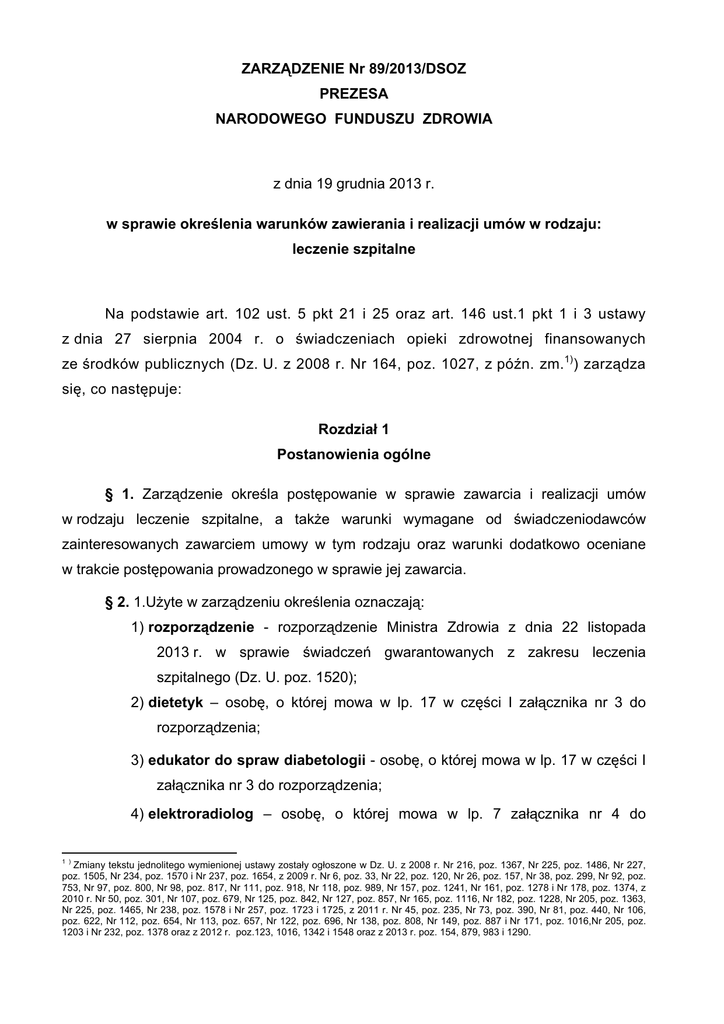 ZARZĄDZENIE Nr 89/2013/DSOZ PREZESA NARODOWEGO FUNDUSZU ZDROWIA z dnia 19 grudnia 2013 r. w sprawie określenia warunków zawierania i realizacji umów w rodzaju: leczenie szpitalne Na podstawie art. 102 ust. 5 pkt 21 i 25 oraz art. 146 ust.1 pkt 1 i 3 ustawy z dnia 27 sierpnia 2004 r. o świadczeniach opieki zdrowotnej finansowanych ze środków publicznych (Dz. U. z 2008 r. Nr 164, poz. 1027, z późn. zm.1)) zarządza się, co następuje: Rozdział 1 Postanowienia ogólne § 1. Zarządzenie określa postępowanie w sprawie zawarcia i realizacji umów w rodzaju leczenie szpitalne, a także warunki wymagane od świadczeniodawców zainteresowanych zawarciem umowy w tym rodzaju oraz warunki dodatkowo oceniane w trakcie postępowania prowadzonego w sprawie jej zawarcia. § 2. 1.Użyte w zarządzeniu określenia oznaczają: 1) rozporządzenie - rozporządzenie Ministra Zdrowia z dnia 22 listopada 2013 r. w sprawie świadczeń gwarantowanych z zakresu leczenia szpitalnego (Dz. U. poz. 1520); 2) dietetyk – osobę, o której mowa w lp. 17 w części I załącznika nr 3 do rozporządzenia; 3) edukator do spraw diabetologii - osobę, o której mowa w lp. 17 w części I załącznika nr 3 do rozporządzenia; 4) elektroradiolog – osobę, o której mowa w lp. 7 załącznika nr 4 do 1 ) Zmiany tekstu jednolitego wymienionej ustawy zostały ogłoszone w Dz. U. z 2008 r. Nr 216, poz. 1367, Nr 225, poz. 1486, Nr 227, poz. 1505, Nr 234, poz. 1570 i Nr 237, poz. 1654, z 2009 r. Nr 6, poz. 33, Nr 22, poz. 120, Nr 26, poz. 157, Nr 38, poz. 299, Nr 92, poz. 753, Nr 97, poz. 800, Nr 98, poz. 817, Nr 111, poz. 918, Nr 118, poz. 989, Nr 157, poz. 1241, Nr 161, poz. 1278 i Nr 178, poz. 1374, z 2010 r. Nr 50, poz. 301, Nr 107, poz. 679, Nr 125, poz. 842, Nr 127, poz. 857, Nr 165, poz. 1116, Nr 182, poz. 1228, Nr 205, poz. 1363, Nr 225, poz. 1465, Nr 238, poz. 1578 i Nr 257, poz. 1723 i 1725, z 2011 r. Nr 45, poz. 235, Nr 73, poz. 390, Nr 81, poz. 440, Nr 106, poz. 622, Nr 112, poz. 654, Nr 113, poz. 657, Nr 122, poz. 696, Nr 138, poz. 808, Nr 149, poz. 887 i Nr 171, poz. 1016,Nr 205, poz. 1203 i Nr 232, poz. 1378 oraz z 2012 r. poz.123, 1016, 1342 i 1548 oraz z 2013 r. poz. 154, 879, 983 i 1290. rozporządzenia; 5) Fundusz – Narodowy Fundusz Zdrowia; 6) logopeda – osobę, o której mowa w lp. 2 załącznika nr 4 do rozporządzenia; 7) obrażenia ciała – obrażenia, z których każde stanowi wskazanie do leczenia szpitalnego i kwalifikuje do rozliczenia określoną grupą JGP; 8) Oddział Funduszu – oddział wojewódzki Narodowego Funduszu Zdrowia; 9) osoba prowadząca fizjoterapię - osobę, o której mowa w lp. 20 załącznika nr 3 do rozporządzenia; 10) psycholog- osobę, o której mowa w lp. 17 w części I załącznika nr 3 do rozporządzenia; 11) psycholog kliniczny – osoba, która posiada tytuł specjalisty w dziedzinie psychologii klinicznej; 12) punkt transformowany (punkt TISS+) - jednostka rozliczeniowa służąca do rozliczania świadczeń opieki zdrowotnej w zakresach anestezjologii i intensywnej terapii, stanowiąca transformację punktu TISS-28 lub TISS-28 dla dzieci; 13) rejestr – rejestr podmiotów wykonujących działalność leczniczą, o którym mowa w ustawie z dnia 15 kwietnia 2011 r. o działalności leczniczej (Dz. U. z 2013 r. poz. 217); 14) rodzaj świadczeń – rodzaj, o którym mowa w załączniku do rozporządzenia Ministra Zdrowia z dnia 6 maja 2008 r. w sprawie ogólnych warunków umów o udzielanie świadczeń opieki zdrowotnej (Dz. U. Nr 81, poz. 484); 15) system jednorodnych grup pacjentów (JGP) – kwalifikowanie zakończonej hospitalizacji do jednej z grup, wyodrębnionych według kryterium spójności postępowania medycznego, porównywalnego stopnia zużycia zasobów, standaryzowanego czasu pobytu i innych uznanych parametrów. System obejmuje następujące elementy: a) charakterystyka JGP – zbiór parametrów służących do wyznaczenia grupy, w tym w szczególności: – rozpoznania według Międzynarodowej Statystycznej Klasyfikacji Chorób i Problemów Zdrowotnych – Rewizja Dziesiąta zwanej dalej „ICD-10”, – procedury medyczne według wskazanej przez Fundusz wersji Międzynarodowej Klasyfikacji Procedur Medycznych zwanej dalej „ICD-9”, 2 – wiek pacjenta, – czas pobytu, b) algorytm JGP – określony sposób postępowania prowadzący do prawidłowego zakwalifikowania zakończonej hospitalizacji do właściwej grupy JGP, c) grupa JGP – jedna z wielu kategorii hospitalizacji wyodrębniona zgodnie z zasadami systemu JGP, posiadająca kod, nazwę oraz charakterystykę opisaną określonymi parametrami; 16) świadczenie w szpitalnym oddziale ratunkowym (SOR) – świadczenie opieki zdrowotnej zakończone wypisem, udzielone w trybie nagłym osobie znajdującej się w stanie nagłego zagrożenia zdrowotnego; świadczenia w SOR obejmują również świadczenia, które ze względu na stan zdrowia świadczeniobiorcy wymagają niezwłocznego podjęcia czynności związanych z diagnostyką i leczeniem i nie mogą być zrealizowane w tym czasie przez świadczeniodawców udzielających świadczeń w innych rodzajach; świadczenia obejmują w razie konieczności zapewnienie transportu w celu zachowania ciągłości leczenia; 17) świadczenie w szpitalnej izbie przyjęć (IP) – świadczenie opieki zdrowotnej udzielone w trybie nagłym osobie znajdującej się w stanie nagłego zagrożenia u świadczeniodawcy; zdrowotnego, świadczenia nie w IP zakończone mogą hospitalizacją obejmować również świadczenia, które ze względu na stan zdrowia świadczeniobiorcy wymagają niezwłocznego podjęcia czynności związanych z diagnostyką i leczeniem i nie świadczeniodawców mogą być zrealizowane udzielających świadczeń w w tym czasie innych przez rodzajach; świadczenia obejmują w razie konieczności zapewnienie transportu w celu zachowania ciągłości leczenia; 18) ustawa o świadczeniach – ustawę z dnia 27 sierpnia 2004 r. o świadcze