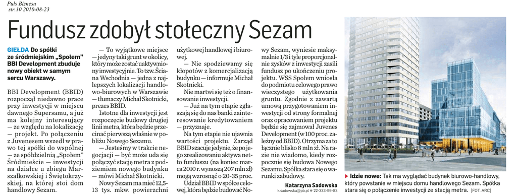 Puls Biznesu str.10 2010-08-23 Fundusz zdobył stołeczny Sezam GIEŁDA Do spółki ze śródmiejskim „Społem” BBI Development zbuduje nowy obiekt w samym sercu Warszawy. BBI Development (BBID) rozpoczął niedawno prace przy inwestycji w miejscu dawnego Supersamu, a już ma kolejny interesujący — ze względu na lokalizację — projekt. Po połączeniu z Juvenesem wszedł w prawo tej spółki do wspólnej — ze spółdzielnią „Społem” Śródmieście — inwestycji na działce u zbiegu Marszałkowskiej i Świętokrzyskiej, na której stoi dom handlowy Sezam. — To wyjątkowe miejsce —jedyny taki grunt wokolicy, który może zostać uaktywniony inwestycyjnie. To tzw. Ściana Wschodnia — jedna z najlepszych lokalizacji handlowo-biurowych w Warszawie —tłumaczy Michał Skotnicki, prezes BBID. Istotne dla inwestycji jest rozpoczęcie budowy drugiej linii metra, która będzie przecinać pierwszą właśnie w pobliżu Nowego Sezamu. — Jesteśmy w trakcie negocjacji — być może uda się połączyć stację metra z podziemiem nowego budynku — mówi Michał Skotnicki. Nowy Sezam ma mieć 12,513 tys. mkw. powierzchni użytkowej handlowej i biurowej. — Nie spodziewamy się kłopotów z komercjalizacją budynku — informuje Michał Skotnicki. Nie martwi się też o finansowanie inwestycji. — Już na tym etapie zgłaszają się do nas banki zainteresowanie kredytowaniem — przyznaje. Na tym etapie nie ujawnia wartości projektu. Zarząd BBID szacuje jedynie, że pojego zrealizowaniu aktywa netto funduszu (na koniec marca2010 r. wynoszą207 mln zł) mogą wzrosnąć o 20-35 proc. Udział BBID współce celowej, która będzie budować No- wy Sezam, wyniesie maksymalnie1/3 ityle proporcjonalnie zysków z inwestycji zasili fundusz po ukończeniu projektu. WSS Społem wniosła dopodmiotu celowego prawo wieczystego użytkowania gruntu. Zgodnie z zawartą umową przygotowaniem inwestycji od strony formalnej oraz opracowaniem projektu będzie się zajmował Juvenes Development (w100 proc. zależny odBBID). Otrzyma zato łącznie blisko 8 mln zł. Na razie nie wiadomo, kiedy rozpocznie się budowa Nowego Sezamu. Spółka stara się owarunki zabudowy. Katarzyna Sadowska [email protected] ☎ 22-333-99-83 Idzie nowe: Tak ma wyglądać budynek biurowo-handlowy, który powstanie w miejscu domu handlowego Sezam. Spółka stara się o połączenie inwestycji ze stacją metra. [FOT. ARC]