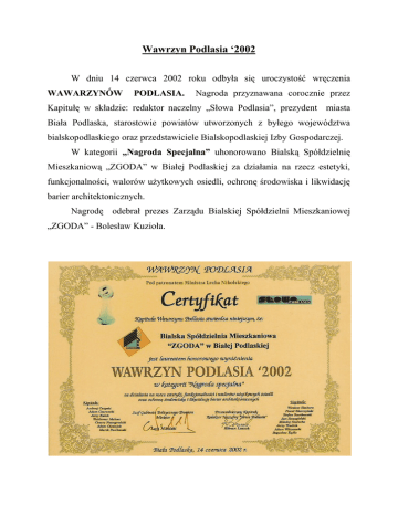 Wawrzyn Podlasia ‘2002 W dniu 14 czerwca 2002 roku odbyła się uroczystość wręczenia WAWARZYNÓW PODLASIA. Nagroda przyznawana corocznie przez Kapitułę w składzie: redaktor naczelny „Słowa Podlasia”, prezydent miasta Biała Podlaska, starostowie powiatów utworzonych z byłego województwa bialskopodlaskiego oraz przedstawiciele Bialskopodlaskiej Izby Gospodarczej. W kategorii „Nagroda Specjalna” uhonorowano Bialską Spółdzielnię Mieszkaniową „ZGODA” w Białej Podlaskiej za działania na rzecz estetyki, funkcjonalności, walorów użytkowych osiedli, ochronę środowiska i likwidację barier architektonicznych. Nagrodę odebrał prezes Zarządu Bialskiej Spółdzielni Mieszkaniowej „ZGODA” - Bolesław Kuzioła.