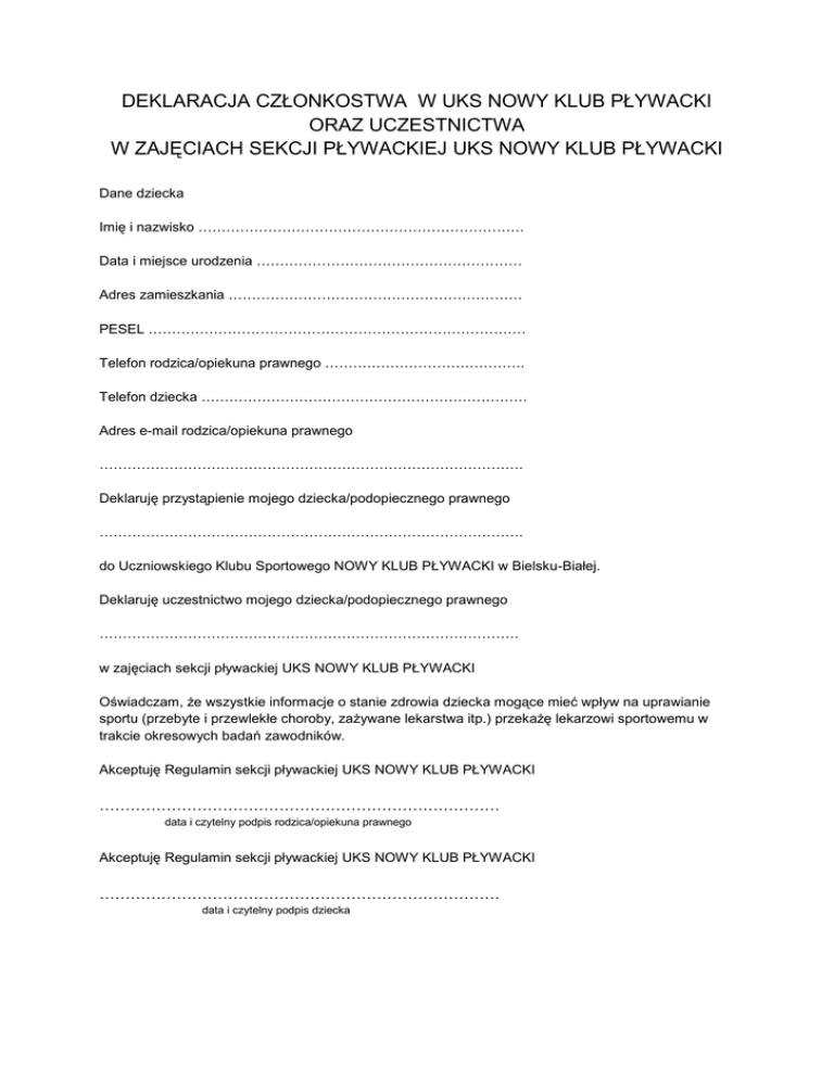 DEKLARACJA CZŁONKOSTWA W UKS NOWY KLUB PŁYWACKI ORAZ UCZESTNICTWA W ZAJĘCIACH SEKCJI PŁYWACKIEJ UKS NOWY KLUB PŁYWACKI Dane dziecka Imię i nazwisko ……………………………………………………………. Data i miejsce urodzenia ………………………………………………… Adres zamieszkania ……………………………………………………… PESEL ……………………………………………………………………… Telefon rodzica/opiekuna prawnego ……………………………………. Telefon dziecka ……………………………………………………………. Adres e-mail rodzica/opiekuna prawnego ………………………………………………………………………………. Deklaruję przystąpienie mojego dziecka/podopiecznego prawnego ………………………………………………………………………………. do Uczniowskiego Klubu Sportowego NOWY KLUB PŁYWACKI w Bielsku-Białej. Deklaruję uczestnictwo mojego dziecka/podopiecznego prawnego ……………………………………………………………………………… w zajęciach sekcji pływackiej UKS NOWY KLUB PŁYWACKI Oświadczam, że wszystkie informacje o stanie zdrowia dziecka mogące mieć wpływ na uprawianie sportu (przebyte i przewlekłe choroby, zażywane lekarstwa itp.) przekażę lekarzowi sportowemu w trakcie okresowych badań zawodników. Akceptuję Regulamin sekcji pływackiej UKS NOWY KLUB PŁYWACKI …………………………………………………………………… data i czytelny podpis rodzica/opiekuna prawnego Akceptuję Regulamin sekcji pływackiej UKS NOWY KLUB PŁYWACKI …………………………………………………………………… data i czytelny podpis dziecka