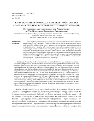 Psychoterapia 2 (169) 2014 Stanisław Radoń str. 61–72 Kwestionariusz Ruminacji-Refleksyjności (polska adaptacja The Rumination-Reflection Questionnaire) Construction and validation of the Polish version of The Rumination-Reflection Questionnaire Katedra Duchowości Mediów i Relacji Społecznych, Instytut Dziennikarstwa i Komunikacji Społecznej, Uniwersytet Papieski Jana Pawła II w Krakowie Kierownik katedry: ks. prof. dr hab. Wojciech Misztal rumination reflection Celem artykułu jest prezentacja i adaptacja narzędzia (The Rumination-Reflection Questionnaire RRQ; Trapnell, Campbell 1999) służącego do pomiaru takich aktywności umysłowych człowieka, które z jednej strony pomagają w jego funkcjonowaniu (refleksyjność), a z drugiej, gdy przybierają emocjonalnie negatywne zabarwienie, utrudniają je (ruminacje) W części teoretycznej zaprezentowano specyfikę, typologie i korelaty tych specyficznych procesów umysłowych, które mogą mieć charakter adaptacyjny albo nieadaptacyjny. Następnie przedstawiono badania tym narzędziem, których rezultaty potwierdziły rzetelność (zgodność wewnętrzną, stabilność) i trafność stosowania KRR w stosunku do osób w wieku od 20 do 50 lat, a także założeń teoretycznych 2-czynnikowego modelu ruminacji. Summary. A growing body of research has examined intrusive and relatively uncontrollable thought processes, and two distinct and relatively independent lines of research have emerged. One research line has focused on the investigation of worry and the thought process implicated in the development, while the other research line has concentrated on the study of rumination and the thought processes associated with increased duration and severity of major depressive disorder. These achievements were the base for constructing The Rumination-Reflection Questionnaire RRQ. In this study the English version of 13-item were used to develop the Polish adaptation. The psychometric properties of the Polish version RRQ were assessed in a sample of 300 adults (20–50 years old). Construct validity was examined with reliability analysis of consistency (Alfa-Cronbach, confirmatory factor analyses, stability) and accuracy (by relating the KRR to others measures of personality disorders, mindfulness and mysticism). The results confirmed validity of KRR (consistency and accuracy) as well as usefulness of considerations based on new theoretical suggestions in psychology (twodimensional model of rumination). „Każdy człowiek myśli” — to stwierdzenie wydaje się truizmem. Ale co to znaczy „myśli”? To jest pytanie zasadnicze, zwłaszcza jeśli wziąć pod uwagę wyniki badań dotyczących procesów ruminacji. Człowiek myśli, tzn. nachodzą go refleksje, które — jak się okazuje — wcale nie są zabarwione pozytywnie, ale negatywnie, dominują w nich bowiem — jak sugeruje wiele wyników badań empirycznych — myśli osądzające i autokrytyczne, które powiązane są z niepodatnymi na zmianę, habitulnie uwarunkowanymi reakcjami emocjonalnymi. Często te reakcje charakteryzują się niskim progiem wrażliwości i podwyższoną reaktywnością (mały, neutralny wydawałoby się bodziec wywołuje wielką 62 Stanisław Radoń reakcję z pełną symptomatologią). Dlaczego tak jest? Czy rzeczywiście tak jest? Czy dotyka to każdej osoby? Jak sobie z tymi autokrytycznymi myślami radzić? Badania przeprowadzone w Polsce ujawniły, że charakteryzuje nas podwyższone nasilenie negatywnych procesów refleksyjnych (ruminacji), ale ich charakter jest specyficzny w porównaniu z innymi populacjami [1]. Jak się okazało, polskie ruminowanie odnosi się głównie do świata społecznego (krytyczne i intruzywne myśli dotyczą bardziej świata otaczającego niż samego podmiotu ruminacji). Z wiekiem jednak ten typ ruminacji istotnie zmienia swój zakres konotacyjny i zaczyna dotykać samego podmiotu. W późniejszym wieku spada nasilenie ruminacji o świecie społecznym, a zaczyna dominować negatywne myślenie o sobie, które w istotnym stopniu wpływa na pogorszenie komfortu życia oraz ogólnego dobrostanu. Niektóre wyniki badań neurologicznych wskazują, że umysł każdego człowieka funkcjonuje zwykle w tzw. trybie standardowym (default mode), który charakteryzuje się tym, że bez chwili przerwy przez pole uwagi przewijają się zmienne wyobrażenia, uczucia i myśli (mind wandering). Zasadniczo umysł nigdy poza bardzo krótkimi chwilami — warto podkreślić, że dotyczy to również osób najbardziej zaawansowanych w medytacji — nie znajduje się w czystym stanie skoncentrowania (relatywnie stabilny etap skoncentrowania trwa tylko 3 sekundy w 18-sekundowym cyklu, który powtarza się nieustannie od nowa — por. wyniki badań neurologicznych [2]). Najczęściej ta aktywność umysłowa charakteryzuje się — jak wykazują badania dotyczące uważności — negatywnym zabarwieniem emocjonalnym (myśli oceniające, osądzające, autokrytyczne połączone z pełnym spektrum symptomów afektywnych stanowiących kompleksowy stan fizjokognitywny [3, 4]). Wyniki wielu badań oraz opracowań teoretycznych dowodzą, że ruminacje to nawracające myśli o zabarwieniu autokrytycznym i samoosądzającym, które nie wiążą się bezpośrednio z aktualnie wykonywanymi przez podmiot działaniami oraz nie przyczyniają się do zrozumienia czy wyjaśnienia sytuacji. Ruminacje ponadto słabo lub wcale nie poddają się wolicjonalnej kontroli i — w związku z tym — trudno je opanować. W konsekwencji często całe życie psychiczne jednostki bywa zdominowane przez ciągle nawracające treści ruminacyjne [5, 6]. W znaczeniu klinicznym fenomen ruminacji przybiera postać syndromu myśli natrętnych, który w natężeniu umiarkowanym dotyka w codziennym życiu niemal wszystkich ludzi, natomiast w przypadku niektórych jednostek stanowi istotny symptom różnych zaburzeń psychicznych. Ruminacje na skutek swoich specyficznych właściw