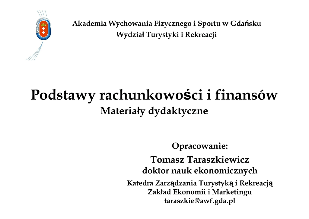 Akademia Wychowania Fizycznego i Sportu w Gdańsku Wydział Turystyki i Rekreacji Podstawy rachunkowości i finansów Materiały dydaktyczne Opracowanie: Tomasz Taraszkiewicz doktor nauk ekonomicznych Katedra Zarządzania Turystyką i Rekreacją Zakład Ekonomii i Marketingu [email protected] Podstawy rachunkowości i finansów Program Materiały dydaktyczne 1. Wprowadzenie do rachunkowości Zastosowanie rachunkowości zarządczej i finansowej Przegląd definicji Funkcje Role UŜytkownicy 2. Wybrane zagadnienia podstaw rachunkowości Podstawowe zasady rachunkowości Podstawowe równanie rachunkowości Metody rachunkowe 3. Wybrane zagadnienia podstaw księgowości Podstawowe zasady księgowania Rodzaje operacji gospodarczych Klasyfikacja kont Zasadność łączenia i podzielności 2 Opracowano w oparciu o materiał źródłowy Podstawy rachunkowości i finansów Program Materiały dydaktyczne 4. Bilans Konstrukcja bilansu Badanie struktury majątku i kapitału Wskaźnik struktury majątku Kapitał obrotowy i aktywa netto 5. Rachunek wyników Zysk i strata jako saldo Budowa rachunku Wynik ze sprzedaŜy Wynik na działalności operacyjnej Wynik na działalności gospodarczej Wynik brutto i netto Stopa zysku 6. Przepływy finansowe Konstrukcja rachunku Przepływy środków pienięŜnych z działalności operacyjnej Przepływy środków pienięŜnych z działalności inwestycyjnej Przepływy środków pienięŜnych z działalności finansowej Stan na początek i na koniec roku obrotowego 3 Opracowano w oparciu o materiał źródłowy Podstawy rachunkowości i finansów Materiały dydaktyczne Definicja rachunkowości Rachunkowość to uniwersalny, elastyczny system informacyjno - kontrolny, który odzwierciedla przebieg i rezultaty działalności gospodarczej jednostek organizacyjnych. W powyŜszej definicji istotną rolę ogrywają określenia systemu: "uniwersalny" i "elastyczny"; wymagają one objaśnienia. System UNIWERSALNY - to znaczy moŜliwy do zastosowania w rozmaitych warunkach. Ten sam system rachunkowy moŜemy stosować w odniesieniu do róŜnych przedmiotów i podmiotów, róŜnego zakresu i rodzaju działalności; wykorzystując przy tym róŜne formy i techniki obliczeniowe). System ELASTYCZNY - to znaczy moŜliwy do stosowania w kaŜdej jednostce. 4 Opracowano w oparciu o materiał źródłowy Podstawy rachunkowości i finansów Materiały dydaktyczne Funkcje i role rachunkowości W literaturze przedmiotu spotykamy (informacyjna, kontrolna i analityczna). określenie trzech funkcji rachunkowości INFORMACYJNA FUNKCJA RACHUNKOWOŚCI. Rachunkowość dostarcza nam informacje, potrzebne do podejmowania decyzji w procesie zarządzania jednostką (zaspokajając tym samym potrzeby wewnętrzne) oraz informacje dla organów zewnętrznych (głównie poprzez sprawozdania finansowe). KONTROLNA FUNKCJA RACHUNKOWOŚCI. Rachunkowość pomaga w ochronie i zabezpieczeniu mienia, pełniąc funkcję kontrolną. Sprawny system umoŜliwia wychwycenie naduŜyć, pozwala na racjonalne wykorzystanie posiadanych zasobów. ANALITYCZNA FUNKCJA RACHUNKOWOŚCI. Rachunkowość interpretację danych liczbowych - stanowi ocenę działalności danej jednostki. poprzez Rachunkowość spełnia teŜ PODWÓJNĄ ROLĘ: z jednej strony dostarcza informacje o działalności danej jednostki w przeszłości (pozwalając tym samym na dokonanie oceny, rozliczenie czy złoŜenie informacji finansowych podmiotom na zewnątrz), z drugiej natomiast rachunkowość dostarcza informacje, niezbędne do podejmowania decyzji odnośnie przyszłości. 5 Opracowano w oparciu o materiał źródłowy Podstawy rachunkowości i finansów Materiały dydaktyczne UŜytkownicy rachunkowości UśYTKOWNICY INFORMACJI FINANSOWYCH UśYTKOWNICY informacji finansowych to: - właściciele (udziałowcy, akcjonariusze), - wierzyciele, - związki zawodowe, - pracownicy, - zarząd firmy (posiada największe uprawnienia do informacji), - klienci firmy (dostawcy, odbiorcy), - władze lokalne, - instytucje centralne (urzędy skarbowe, ZUS, GUS itd.). 6 Opracowano w oparciu o materiał źródłowy Podstawy rachunkowości i finansów Materiały dydaktyczne Podstawowe zasady rachunkowości ZASADA MEMORIAŁOWA Ujęcie w księgach ogółu operacji, wpływających na wynik finansowy roku obrotowego; niezaleŜnie od terminu ich zapłaty czy stopnia uregulowania rozrachunków; przeciwieństwem zasady memoriałowej, stosowanej w polskiej rachunkowości, jest zasada kasowa. ZASADA WSPÓŁMIERNOŚCI Mówi o powiązaniu przychodów i kosztów z okresem, którego dotyczą (tzn. powiązanie przychodów z kosztami ich uzyskania w danym okresie itd.). ZASADA KONTYNUACJI DZIAŁALNOŚCI Jest to domniemanie, Ŝe jednostka będzie kontynuować działalność w nie zmniejszonym istotnie zakresie w przyszłości. ZASADA REALIZACJI Zakłada uznanie powstania zysków dopiero w momencie sprzedaŜy (lub czynności z nią związanej). ZASADA OSTROśNEJ WYCENY Przewiduje bieŜącą wycenę majątku i kapitału, która nie zniekształca wyniku finansowego. Z zasady tej wynika nakaz aktualizacji (to znaczy obniŜenia cen faktycznie zapłaconych lub poniesionych kosztów do ich wartości "moŜliwej do uzyskania"). ZASADA ISTOTNOŚCI Nakazuje takie zorganizowanie ewidencji, aby zapewniała wyodrębnienie operacji, które waŜą przy ocenie sytuacji firmy, wyniku finansowego i rentowności. Oznacza to, Ŝe jeśli wartość operacji jest nieznaczna, wówczas moŜemy 7 stosować ujęcie uproszczone. Opracowano w oparciu o materiał źródłowy Podstawy rachunkowości i finansów Materiały dydaktyczne Podstawowe zasady rachunkowości ZASADA CIĄGŁOŚCI (PORÓWNYWALNOŚCI) Polega na stałym stosowaniu z okresu na okres raz przyjętych zasad i rozwiązań, w celu zapewnienia porównywalności danych. ZASADA INDYWIDUALNEJ WYCENY Dokonuje się oddzielnej wyceny kaŜdego poszczególnego składnika aktywów, pasywów, przychodów i kosztów, zysków i strat. Inaczej rzecz ujmując, zgodnie z t