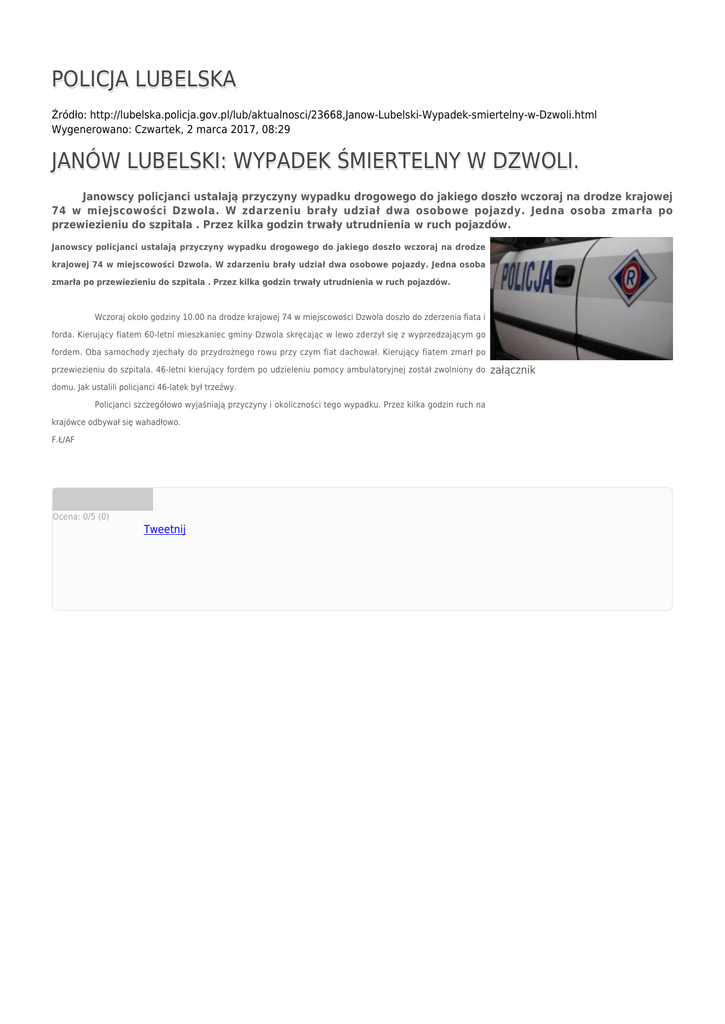 POLICJA LUBELSKA Źródło: http://lubelska.policja.gov.pl/lub/aktualnosci/23668,Janow-Lubelski-Wypadek-smiertelny-w-Dzwoli.html Wygenerowano: Czwartek, 2 marca 2017, 08:29 JANÓW LUBELSKI: WYPADEK ŚMIERTELNY W DZWOLI. Janowscy policjanci ustalają przyczyny wypadku drogowego do jakiego doszło wczoraj na drodze krajowej 74 w miejscowości Dzwola. W zdarzeniu brały udział dwa osobowe pojazdy. Jedna osoba zmarła po przewiezieniu do szpitala . Przez kilka godzin trwały utrudnienia w ruch pojazdów. Janowscy policjanci ustalają przyczyny wypadku drogowego do jakiego doszło wczoraj na drodze krajowej 74 w miejscowości Dzwola. W zdarzeniu brały udział dwa osobowe pojazdy. Jedna osoba zmarła po przewiezieniu do szpitala . Przez kilka godzin trwały utrudnienia w ruch pojazdów. Wczoraj około godziny 10.00 na drodze krajowej 74 w miejscowości Dzwola doszło do zderzenia fiata i forda. Kierujący fiatem 60-letni mieszkaniec gminy Dzwola skręcając w lewo zderzył się z wyprzedzającym go fordem. Oba samochody zjechały do przydrożnego rowu przy czym fiat dachował. Kierujący fiatem zmarł po przewiezieniu do szpitala. 46-letni kierujący fordem po udzieleniu pomocy ambulatoryjnej został zwolniony do domu. Jak ustalili policjanci 46-latek był trzeźwy. Policjanci szczegółowo wyjaśniają przyczyny i okoliczności tego wypadku. Przez kilka godzin ruch na krajówce odbywał się wahadłowo. F.Ł/AF Ocena: 0/5 (0) Tweetnij załącznik