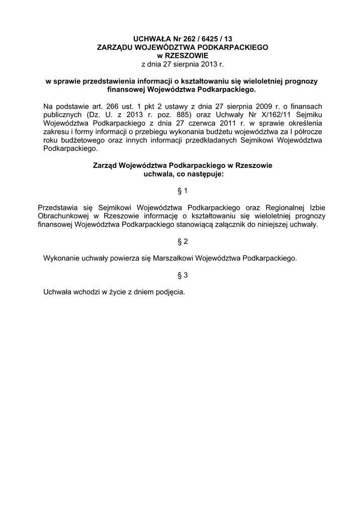 UCHWAŁA Nr 262 / 6425 / 13 ZARZĄDU WOJEWÓDZTWA PODKARPACKIEGO w RZESZOWIE z dnia 27 sierpnia 2013 r. w sprawie przedstawienia informacji o kształtowaniu się wieloletniej prognozy finansowej Województwa Podkarpackiego. Na podstawie art. 266 ust. 1 pkt 2 ustawy z dnia 27 sierpnia 2009 r. o finansach publicznych (Dz. U. z 2013 r. poz. 885) oraz Uchwały Nr X/162/11 Sejmiku Województwa Podkarpackiego z dnia 27 czerwca 2011 r. w sprawie określenia zakresu i formy informacji o przebiegu wykonania budżetu województwa za I półrocze roku budżetowego oraz innych informacji przedkładanych Sejmikowi Województwa Podkarpackiego. Zarząd Województwa Podkarpackiego w Rzeszowie uchwala, co następuje: §1 Przedstawia się Sejmikowi Województwa Podkarpackiego oraz Regionalnej Izbie Obrachunkowej w Rzeszowie informację o kształtowaniu się wieloletniej prognozy finansowej Województwa Podkarpackiego stanowiącą załącznik do niniejszej uchwały. §2 Wykonanie uchwały powierza się Marszałkowi Województwa Podkarpackiego. §3 Uchwała wchodzi w życie z dniem podjęcia. UZASADNIENIE do projektu uchwały Zarządu Województwa Podkarpackiego w sprawie przedstawienia informacji o kształtowaniu się wieloletniej prognozy finansowej Województwa Podkarpackiego Przepisy art. 266 ust. 1 pkt 2 ustawy z dnia 27 sierpnia 2009 r. o finansach publicznych (Dz. U. z 2013 r. poz. 885) zobowiązują Zarząd jednostki samorządu terytorialnego do przedstawienia organowi stanowiącemu jednostki samorządu terytorialnego i regionalnej izbie obrachunkowej, w terminie do 31 sierpnia, informacji o kształtowaniu się wieloletniej prognozy finansowej Województwa Podkarpackiego, w tym o przebiegu realizacji przedsięwzięć za I półrocze 2013 roku. Zakres i forma informacji została określona w Uchwale Nr X/162/11 Sejmiku Województwa Podkarpackiego z dnia 27 czerwca 2011 r. w sprawie określenia zakresu i formy informacji o przebiegu wykonania budżetu województwa za I półrocze roku budżetowego oraz innych informacji przedkładanych Sejmikowi Województwa Podkarpackiego. Załącznik do Uchwały262 / 6425 /13 Zarządu Województwa Podkarpackiego w Rzeszowie z dnia 27 sierpnia 2013 r. INFORMACJA O KSZTAŁTOWANIU SIĘ WIELOLETNIEJ PROGNOZY FINANSOWEJ WOJEWÓDZTWA PODKARPACKIEGO WSTĘP Informacja o kształtowaniu się wieloletniej prognozy finansowej Województwa Podkarpackiego składa się z części tabelarycznej i części opisowej. Część tabelaryczna została sporządzona na podstawie sprawozdań budżetowych z wykonania planu dochodów i wydatków budżetu Województwa i zawiera zestawienie wykonania: dochodów budżetu Województwa wg stanu na dzień 30 czerwca br. w podziale na bieżące i majątkowe, wydatków budżetu Województwa wg stanu na dzień 30 czerwca br. z podziałem na bieżące i majątkowe oraz wyodrębnieniem wydatków związanych z obsługą długu i udzielanych poręczeń, przychodów i rozchodów budżetu, środków do dyspozycji na finansowanie inwestycji, kwoty długu. Część opisowa została sporządzona w oparciu o wielkości przyjęte w WPF wg stanu na dzień 30 czerwca br. oraz materiały złożone przez Departamenty Urzędu Marszałkowskiego i obejmuje: analizę kształtowania kwoty długu do czasu całkowitej realizacji zaplanowanych przedsięwzięć wieloletnich oraz spłaty zaciągniętych i planowanych do zaciągnięcia zobowiązań z tytułu kredytów i pożyczek długoterminowych, emisji obligacji i udzielonych poręczeń, przebieg realizacji przedsięwzięć wg stanu na 30 czerwca br. ANALIZA KSZTAŁTOWANIA SIĘ KWOTY DŁUGU Wieloletnią Prognozę Finansową Województwa Podkarpackiego przyjęto uchwałą Nr XXVIII/499/11 Sejmiku w dniu 21 grudnia 2012 r. W pierwszym półroczu dokonywano zmian prognozy uchwałami Sejmiku Województwa w związku ze zmianami w wykazie przedsięwzięć wieloletnich oraz zmianami w budżecie województwa na 2013 r. Globalne zadłużenie Województwa Podkarpackiego według stanu na dzień 30 czerwca 2013 r. stanowi kwotę 321.507.169,- zł, co stanowi 23,71% planowanych dochodów na 2013 r. Potencjalne zobowiązania Województwa Podkarpackiego z tytułu udzielonych poręczeń i gwarancji na dzień 30 czerwca 2013 r. wynoszą kwotę 55.516.058,- zł. Zgodnie z art. 243 ust. 1 ustawy z dnia 27 sierpnia 2009 r. o finansach publicznych organ stanowiący jednostki samorządu terytorialnego nie może uchwalić budżetu, którego realizacja spowoduje, że w roku budżetowym oraz w każdym roku następującym po roku budżetowym relacja łącznej kwoty przypadających w danym roku budżetowym: spłat rat kredytów i pożyczek, o których mowa w art. 89 ust. 1 pkt 2-4 oraz art. 90, wraz z należnymi w danym roku odsetkami od kredytów i pożyczek, o których mowa w art. 89 ust. 1 i art. 90, wykupów papierów wartościowych emitowanych na cele określone w art. 89 ust. 1 pkt 2-4 oraz art. 90 wraz z należnymi odsetkami i dyskontem od papierów wartościowych emitowanych na cele w art. 89 ust. 1 i art. 90, potencjalnych spłat kwot wynikających z udzielonych poręczeń oraz gwarancji, do planowanych dochodów ogółem budżetu przekroczy średnią arytmetyczną z obliczonych dla ostatnich trzech lat relacji jej dochodów bieżących powiększonych o dochody ze sprzedaży majątku oraz pomniejszonych o wydatki bieżące, do dochodów ogółem budżetu, obliczoną według wzoru. Na rok 2013 objęty wieloletnią prognozą finansową zamiast ww. relacji, o której mowa w art. 243 ustawy z dnia 27 sierpnia 2009 r. o finansach publicznych, Strona 1 z 3 mają zastosowanie zasady określone w art. 169-171 ustawy z dnia 30 czerwca 2005 r. o finansach publicznych (Dz. U. Nr 249, poz. 2104, z późn. zm.), tj.: łączna kwota przypadających w danym roku spłat kredytów i pożyczek długoterminowych, wykupu wyemitowanych papierów wartościowych oraz potencjalnych spłat kwot wynikających z udzielonych poręczeń i gwarancji nie może przekroczy