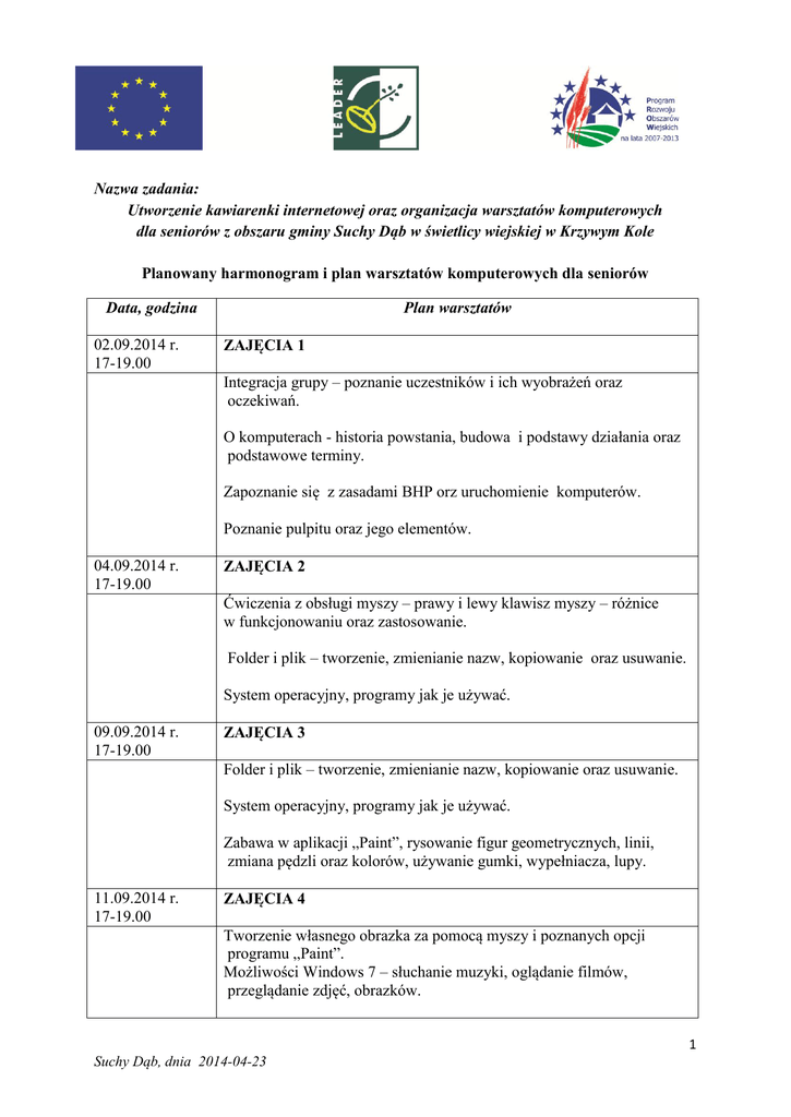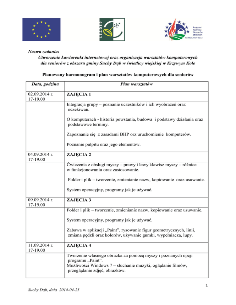 Nazwa zadania: Utworzenie kawiarenki internetowej oraz organizacja warsztatów komputerowych dla seniorów z obszaru gminy Suchy Dąb w świetlicy wiejskiej w Krzywym Kole Planowany harmonogram i plan warsztatów komputerowych dla seniorów Plan warsztatów Data, godzina 02.09.2014 r. 17-19.00 ZAJĘCIA 1 Integracja grupy – poznanie uczestników i ich wyobrażeń oraz oczekiwań. O komputerach - historia powstania, budowa i podstawy działania oraz podstawowe terminy. Zapoznanie się z zasadami BHP orz uruchomienie komputerów. Poznanie pulpitu oraz jego elementów. 04.09.2014 r. 17-19.00 ZAJĘCIA 2 Ćwiczenia z obsługi myszy – prawy i lewy klawisz myszy – różnice w funkcjonowaniu oraz zastosowanie. Folder i plik – tworzenie, zmienianie nazw, kopiowanie oraz usuwanie. System operacyjny, programy jak je używać. 09.09.2014 r. 17-19.00 ZAJĘCIA 3 Folder i plik – tworzenie, zmienianie nazw, kopiowanie oraz usuwanie. System operacyjny, programy jak je używać. Zabawa w aplikacji „Paint”, rysowanie figur geometrycznych, linii, zmiana pędzli oraz kolorów, używanie gumki, wypełniacza, lupy. 11.09.2014 r. 17-19.00 ZAJĘCIA 4 Tworzenie własnego obrazka za pomocą myszy i poznanych opcji programu „Paint”. Możliwości Windows 7 – słuchanie muzyki, oglądanie filmów, przeglądanie zdjęć, obrazków. 1 Suchy Dąb, dnia 2014-04-23 16.09.2014 r. 17-19.00 ZAJĘCIA 5 Tworzenie własnego obrazka za pomocą myszy i poznanych opcji programu „Paint”. Możliwości Windows 7 – słuchanie muzyki, oglądanie filmów, przeglądanie zdjęć, obrazków. Klawiatura – układ klawiszy, cyfry, duże i małe litery, pisanie polskich znaków, klawisze funkcyjne, klawisze F. 18.09.2014 r. 17-19.00 ZAJĘCIA 6 Edycja tekstu na bazie programu „WordPad”. Możliwości i ograniczenia edytora tekstu. Wprowadzanie tekstu w tym skróty klawiszowe, polskie znaki i wielkości liter, interpunkcja oraz kasowanie tekstu. 23.09.2014 r. 17-19.00 ZAJĘCIA 7 Edycja tekstu: zmiana kroju i wielkości czcionki, zmiana koloru, pogrubianie, pochylanie, podkreślenie. Wstawianie obrazka własnego autorstwa do tekstu, dodawanie do dokumentu daty i godziny. Płyta CD, DVD, Pendrive, - nagrywanie folderu. 25.09.2014 r. 17-19.00 ZAJĘCIA 8 Internet – wprowadzenie do zagadnienia sieci, przeglądarek internetowych oraz bezpieczeństwa (zagrożenia, wady zalety). Przeglądarka Firefox – pasek adresu, pasek wyszukiwania, co to jest adres internetowy, skąd się biorą strony i co można na nich znaleźć. 30.09.2014 r. 17-19.00 ZAJĘCIA 9 Przeglądanie możliwości Google: wyszukiwanie informacji. Internet w życiu codziennym, korzystanie efektywne i proste: - sprawdzanie rozkładów jazdy, - wyszukiwanie przepisów kulinarnych, - informacji o lekach itp. 02.10.2014 r. 17-19.00 ZAJĘCIA 10 Komunikacja w Internecie, poczta, komunikator, fora dyskusyjne, chat. Teoretyczny aspekt poczty w sieci, bezpieczeństwo, zasady tworzenia nazw kont, sposoby dostępu do poczty. 2 Suchy Dąb, dnia 2014-04-23 07.10.2014 r. 17-19.00 ZAJĘCIA 11 Zakładanie własnej skrzynki na bazie serwisu Gmail.com. Zakładanie konta na portalu społecznościowym Facebook. 09.10.2014 r. 17-19.00 ZAJĘCIA 12 MS Word 2010 – ćwiczenia z tworzenia własnego dokumentu tekstowego: - pisanie tekstu i jego edycja, podkreślanie, pogrubianie, kursywa, zmiana kroju i wielkości czcionki, - wyrównywanie tekstu do lewej, prawej oraz środkowanie i justowanie, - wcięcia, akapity, punktowanie oraz numerowanie, - zmiana koloru tekstu i jego tła, - sortowanie, autokorekta i skróty klawiszowe. 14.10.2014 r. 17-19.00 ZAJĘCIA 13 MS Word 2010 – rozszerzone zastosowanie edytora tekstów: - wstawianie i prosta edycja obrazów z dysku, umieszczanie w tekście obrazów ClipArt, - dodawanie tabeli i jej edycja, - numerowanie stron i tworzenie stopki oraz nagłówka, - przygotowanie pliku do druku. 16.10.2014 r. 17-19.00 ZAJĘCIA 14 MS PowerPoint 2010 – ćwiczenia z tworzenia prostych prezentacji multimedialnych: - wstawianie różnego typu slajdów, umieszczanie na slajdach zdjęć, - dodawanie opisów ilustracji, zmiana motywów kolorystycznych oraz czcionek dostępnych w prezentacji, - wyświetlanie pokazów na ekranie komputera. 21.10.2014 r. 17-19.00 ZAJĘCIA 15 MS PowerPoint 2010 – rozszerzone zastosowanie i tworzenie prezentacji: - wstawianie filmu oraz muzyki do prezentacji, - utworzenie albumu fotografii zdjęć np. z wakacji, - notatki w trybie prezentera. 23.10.2014 r. 17-19.00 ZAJĘCIA 16 Bankowość internetowa - bank w sieci, wygodny i bezpieczny w granicach rozsądku: - zabezpieczenia oraz logowanie na stronie banku, - sprawdzanie stanu konta oraz historii operacji, - przelewy i sposoby płatności w Internecie. 3 Suchy Dąb, dnia 2014-04-23 28.10.2014 r. 17-19.00 ZAJĘCIA 17 Zakupy w sieci – jak dokonać zakupów nie wychodząc z domu: - księgarnia internetowa na bazie Empik.com, - zakupy spożywcze na bazie D.H.Astra oraz Tesco. 30.10.2014 r. 17-19.00 ZAJĘCIA 18 Komunikacja w sieci – Internet jak telefon. Rozmowy głosowe na bazie komunikatora Skype: - zakładanie konta, - instalacja oprogramowania, - szybka konfiguracja i rozmowy tekstowe w ramach grupy. 04.11.2010 r. 17-19.00 ZAJĘCIA 19 Przeglądanie, dodawanie, edycja oraz usuwanie informacji na dyskach przenośnych Pendrive, CD, DVD. Nagrywanie folderu na nośniki danych. Odtwarzanie danych z nośników. 06.11.2014 r. 17-19.00 ZAJĘCIA 20 Wykorzystanie zdobytych umiejętności – gra „Saper” klikanie w małe i duże elementy – gra „Pasjans” klikanie i przeciąganie. Pisanie tekstu. Tworzenie folderów. 12.11.2014 r. 17-19.00 ZAJĘCIA 21 Obsługa urządzeń typu: - kopiarka + skaner + drukarka, - projektor, - ekran. Wprowadzenie do programu Excel – proste obliczenia. 13.11.2014 r. 17-19.00 ZAJĘCIA 22 Podsumowanie dotychczas zdobytej wiedzy w formie małego testu sprawnościowego : - tworzenie folderu i zmienianie jego nazwy, - tworzenie rysunku w folderze (p
