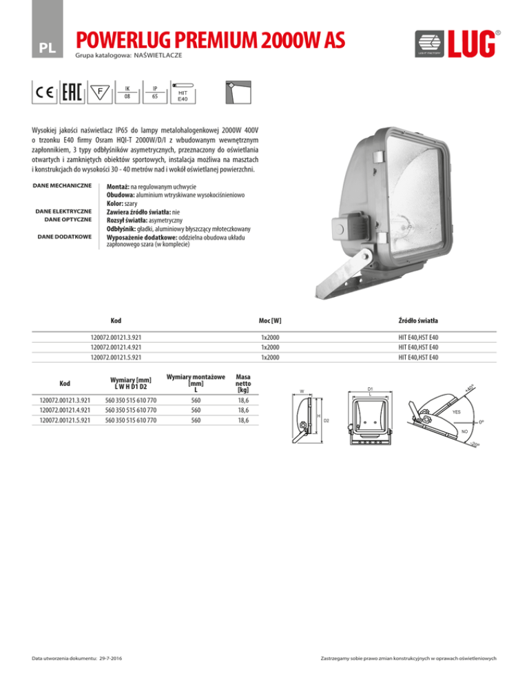 POWERLUG PREMIUM 2000W AS PL Grupa katalogowa: NAŚWIETLACZE Wysokiej jakości naświetlacz IP65 do lampy metalohalogenkowej 2000W 400V o trzonku E40 firmy Osram HQI-T 2000W/D/I z wbudowanym wewnętrznym zapłonnikiem, 3 typy odbłyśników asymetrycznych, przeznaczony do oświetlania otwartych i zamkniętych obiektów sportowych, instalacja możliwa na masztach i konstrukcjach do wysokości 30 - 40 metrów nad i wokół oświetlanej powierzchni. DANE MECHANICZNE DANE ELEKTRYCZNE DANE OPTYCZNE DANE DODATKOWE Kod 120072.00121.3.921 120072.00121.4.921 120072.00121.5.921 Montaż: na regulowanym uchwycie Obudowa: aluminium wtryskiwane wysokociśnieniowo Kolor: szary Zawiera źródło światła: nie Rozsył światła: asymetryczny Odbłyśnik: gładki, aluminiowy błyszczący młoteczkowany Wyposażenie dodatkowe: oddzielna obudowa układu zapłonowego szara (w komplecie) Kod Moc [W] Źródło światła 120072.00121.3.921 120072.00121.4.921 120072.00121.5.921 1x2000 1x2000 1x2000 HIT E40,HST E40 HIT E40,HST E40 HIT E40,HST E40 Wymiary [mm] L W H D1 D2 560 350 515 610 770 560 350 515 610 770 560 350 515 610 770 Wymiary montażowe [mm] L 560 560 560 Masa netto [kg] 18,6 18,6 18,6 0º D1 L W H +4 YES D2 0º NO -20 º Data utworzenia dokumentu: 29-7-2016 Zastrzegamy sobie prawo zmian konstrukcyjnych w oprawach oświetleniowych PL POWERLUG PREMIUM 2000W AS Grupa katalogowa: NAŚWIETLACZE AKCESORIA 150160.00321 Raster ochronny ze stali 150082.00318 Układ zapłonowy 2000W/400V do zabudowy w słupie lub w maszcie 150160.00319 Osłona antyolśnieniowa ze stali ocynkowanej 150082.00317 Układ zapłonowy 2000W/400V w skrzynce 150160.00320 Grill ochronny ze stali ocynkowanej Data utworzenia dokumentu: 29-7-2016 Zastrzegamy sobie prawo zmian konstrukcyjnych w oprawach oświetleniowych
