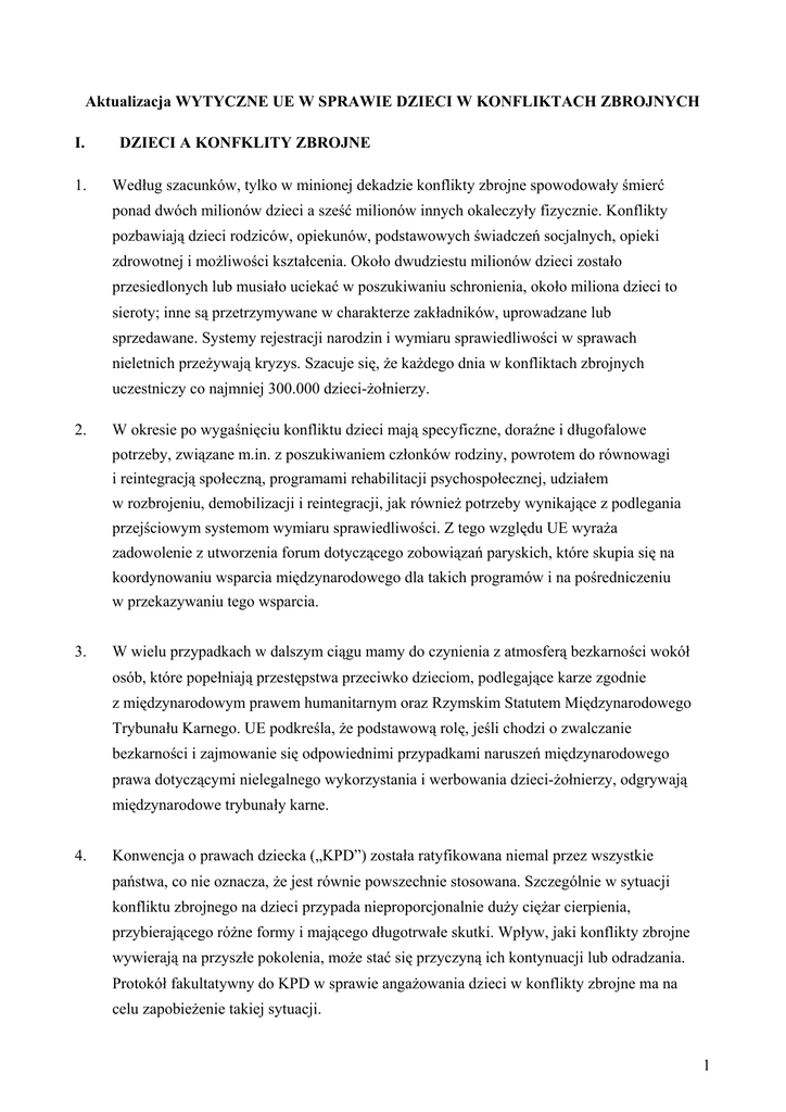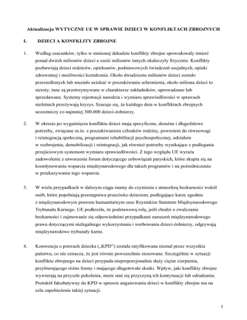 Aktualizacja WYTYCZNE UE W SPRAWIE DZIECI W KONFLIKTACH ZBROJNYCH I. 1. DZIECI A KONFKLITY ZBROJNE Według szacunków, tylko w minionej dekadzie konflikty zbrojne spowodowały śmierć ponad dwóch milionów dzieci a sześć milionów innych okaleczyły fizycznie. Konflikty pozbawiają dzieci rodziców, opiekunów, podstawowych świadczeń socjalnych, opieki zdrowotnej i możliwości kształcenia. Około dwudziestu milionów dzieci zostało przesiedlonych lub musiało uciekać w poszukiwaniu schronienia, około miliona dzieci to sieroty; inne są przetrzymywane w charakterze zakładników, uprowadzane lub sprzedawane. Systemy rejestracji narodzin i wymiaru sprawiedliwości w sprawach nieletnich przeżywają kryzys. Szacuje się, że każdego dnia w konfliktach zbrojnych uczestniczy co najmniej 300.000 dzieci-żołnierzy. 2. W okresie po wygaśnięciu konfliktu dzieci mają specyficzne, doraźne i długofalowe potrzeby, związane m.in. z poszukiwaniem członków rodziny, powrotem do równowagi i reintegracją społeczną, programami rehabilitacji psychospołecznej, udziałem w rozbrojeniu, demobilizacji i reintegracji, jak również potrzeby wynikające z podlegania przejściowym systemom wymiaru sprawiedliwości. Z tego względu UE wyraża zadowolenie z utworzenia forum dotyczącego zobowiązań paryskich, które skupia się na koordynowaniu wsparcia międzynarodowego dla takich programów i na pośredniczeniu w przekazywaniu tego wsparcia. 3. W wielu przypadkach w dalszym ciągu mamy do czynienia z atmosferą bezkarności wokół osób, które popełniają przestępstwa przeciwko dzieciom, podlegające karze zgodnie z międzynarodowym prawem humanitarnym oraz Rzymskim Statutem Międzynarodowego Trybunału Karnego. UE podkreśla, że podstawową rolę, jeśli chodzi o zwalczanie bezkarności i zajmowanie się odpowiednimi przypadkami naruszeń międzynarodowego prawa dotyczącymi nielegalnego wykorzystania i werbowania dzieci-żołnierzy, odgrywają międzynarodowe trybunały karne. 4. Konwencja o prawach dziecka („KPD”) została ratyfikowana niemal przez wszystkie państwa, co nie oznacza, że jest równie powszechnie stosowana. Szczególnie w sytuacji konfliktu zbrojnego na dzieci przypada nieproporcjonalnie duży ciężar cierpienia, przybierającego różne formy i mającego długotrwałe skutki. Wpływ, jaki konflikty zbrojne wywierają na przyszłe pokolenia, może stać się przyczyną ich kontynuacji lub odradzania. Protokół fakultatywny do KPD w sprawie angażowania dzieci w konflikty zbrojne ma na celu zapobieżenie takiej sytuacji. 1 5. UE z zadowoleniem przyjmuje utworzenie ważnych międzynarodowych mechanizmów dotyczących dzieci w konfliktach zbrojnych, zwłaszcza powołanie specjalnego przedstawiciela Sekretarza Generalnego ONZ ds. dzieci w konfliktach zbrojnych oraz grupy roboczej Rady Bezpieczeństwa ds. dzieci w konfliktach zbrojnych. W związku z powyższym UE i jej państwa członkowskie rozważą, a w stosownych przypadkach skoordynują swoje działania z tymi mechanizmami, tak by ich odpowiednie interwencje wywarły jak największy wpływ. II. CEL 6. Wspieranie i ochrona praw dziecka należą do priorytetów polityki UE w dziedzinie praw człowieka. Unia Europejska (UE) uważa rozstrzygnięcie problemu dzieci w konfliktach zbrojnych za kwestię nadzwyczajnej wagi, zarówno dlatego, że to dzieci są ich obecnymi ofiarami i to dzieci będą kształtować przyszłość, jak i dlatego, że przysługują im przyrodzone i niezbywalne prawa, określone w KPD i protokołach fakultatywnych do niej oraz w innych międzynarodowych i regionalnych instrumentach poświęconych prawom człowieka. Celem UE jest podniesienie poziomu świadomości powyższego problemu poprzez nadanie większego rozgłosu działaniom podejmowanym przez UE w tej dziedzinie, zarówno w obrębie samej UE, jak i w ramach jej stosunków ze stronami trzecimi. 7. UE zobowiązuje się w skuteczny i kompleksowy sposób zająć się wpływem, jaki w perspektywie krótko-, średnio- i długoterminowej konflikty zbrojne wywierają na dzieci, używając w tym celu szeregu narzędzi będących w jej dyspozycji i opierając się na doświadczeniach zdobytych w toku zakończonych i obecnie realizowanych działań (przegląd działań UE w załączniku I). Celem UE jest nakłonienie państw trzecich i podmiotów pozarządowych do wdrożenia międzynarodowych i regionalnych norm, standardów i instrumentów w dziedzinie praw człowieka, a także norm, standardów i instrumentów międzynarodowego prawa humanitarnego (wymienionych w załączniku II) oraz do podjęcia skutecznych działań na rzecz ochrony dzieci przed skutkami konfliktu zbrojnego, zaprzestania wykorzystywania dzieci do służby w armii i grupach zbrojnych oraz ukrócenia bezkarności w przypadku przestępstw przeciwko dzieciom. UE uznaje znaczenie, jakie ma zapewnienie koordynacji i ciągłości różnych strategii politycznych i działań, które odnoszą się do sytuacji dzieci dotkniętych konfliktami zbrojnymi, w różnych dziedzinach polityki, w tym w ramach WPZiB/EPBiO, pomocy zewnętrznej i pomocy humanitarnej. 2 III. ZASADY 8. Unia Europejska opiera się na zasadach wolności, demokracji, poszanowania praw człowieka i podstawowych wolności oraz państwa prawnego. Zasady te są wspólne wszystkim państwom członkowskim. Poszanowanie praw człowieka jest jednym z najważniejszych celów wspólnej polityki zagranicznej i bezpieczeństwa UE (WPZiB), w której skład wchodzi europejska polityka bezpieczeństwa i obrony (EPBiO). Poszanowanie praw człowieka stanowi także element polityk wspólnotowych w dziedzinie handlu i współpracy na rzecz rozwoju oraz w dziedzinie pomocy humanitarnej. 9. Promowanie i ochrona praw wszystkich dzieci jest jednym z podstawowych zagadnień, którymi zajmują się UE i jej państwa członkowskie. W swoich działaniach mających zapewnić ochronę dzieciom dotkniętym przez konflikty zbrojne UE stosuje wł
