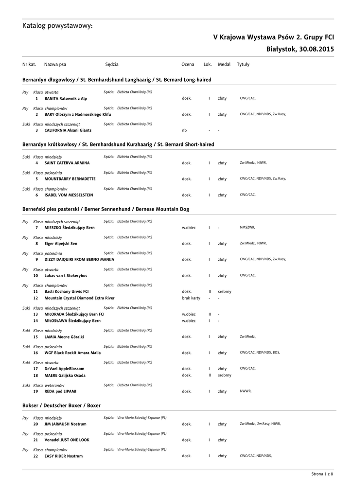 Katalog powystawowy: V Krajowa Wystawa Psów 2. Grupy FCI Białystok, 30.08.2015 Nr kat. Nazwa psa Sędzia Ocena Lok. Medal Tytuły Bernardyn długowłosy / St. Bernhardshund Langhaarig / St. Bernard Long-haired Psy Psy Klasa otwarta 1 BANITA Ratownik z Alp Sędzia: Elżbieta Chwalibóg (PL) Sędzia: Elżbieta Chwalibóg (PL) Klasa championów 2 BARY Olbrzym z Nadmorskiego Klifu Suki Klasa młodszych szczeniąt 3 CALIFORNIA Alsani Giants dosk. I złoty CWC/CAC, dosk. I złoty CWC/CAC, NDP/NDS, Zw.Rasy, nb - - Sędzia: Elżbieta Chwalibóg (PL) Bernardyn krótkowłosy / St. Bernhardshund Kurzhaarig / St. Bernard Short-haired Suki Klasa młodzieży 4 SAINT CATERVA ARMINA Sędzia: Elżbieta Chwalibóg (PL) Suki Klasa pośrednia 5 MOUNTBARRY BERNADETTE Sędzia: Elżbieta Chwalibóg (PL) Suki Klasa championów 6 ISABEL VOM MESSELSTEIN Sędzia: Elżbieta Chwalibóg (PL) dosk. I złoty Zw.Młodz., NJWR, dosk. I złoty CWC/CAC, NDP/NDS, Zw.Rasy, dosk. I złoty CWC/CAC, w.obiec I - NMSZWR, dosk. I złoty Zw.Młodz., NJWR, dosk. I złoty CWC/CAC, NDP/NDS, Zw.Rasy, dosk. I złoty CWC/CAC, Berneński pies pasterski / Berner Sennenhund / Bernese Mountain Dog Psy Psy Psy Psy Psy Klasa młodszych szczeniąt 7 MIESZKO Śledzikujący Bern Sędzia: Elżbieta Chwalibóg (PL) Klasa młodzieży 8 Eiger Alpejski Sen Sędzia: Elżbieta Chwalibóg (PL) Sędzia: Elżbieta Chwalibóg (PL) Klasa pośrednia 9 DIZZY DAIQUIRI FROM BERNO MANIJA Klasa otwarta 10 Lukas van t Stokerybos Sędzia: Elżbieta Chwalibóg (PL) Klasa championów 11 Basti Kochany Urwis FCI Sędzia: Elżbieta Chwalibóg (PL) 12 Mountain Crystal Diamond Extra River Sędzia: Elżbieta Chwalibóg (PL) Suki Klasa młodszych szczeniąt 13 MIŁORADA Śledzikujący Bern FCI 14 MIŁOSŁAWA Śledzikujący Bern Suki Klasa młodzieży 15 LAMIA Mocne Góralki 18 srebrny - w.obiec II - w.obiec I - dosk. I złoty Zw.Młodz., dosk. I złoty CWC/CAC, NDP/NDS, BOS, dosk. I złoty CWC/CAC, dosk. II srebrny dosk. I złoty NWWR, dosk. I złoty Zw.Młodz., Zw.Rasy, NJWR, dosk. I złoty dosk. I złoty Sędzia: Elżbieta Chwalibóg (PL) MAERE Galijska Osada Suki Klasa weteranów 19 REDA pod LIPAMI II - Sędzia: Elżbieta Chwalibóg (PL) Sędzia: Elżbieta Chwalibóg (PL) Suki Klasa pośrednia 16 WGF Black Rockit Amara Malia Suki Klasa otwarta 17 DeVael AppleBlossom dosk. brak karty Sędzia: Elżbieta Chwalibóg (PL) Bokser / Deutscher Boxer / Boxer Psy Psy Psy Klasa młodzieży 20 JIM JARMUSH Nostrum Sędzia: Viva-Maria Soleckyj-Szpunar (PL) Klasa pośrednia 21 Vonadel JUST ONE LOOK Sędzia: Viva-Maria Soleckyj-Szpunar (PL) Klasa championów 22 EASY RIDER Nostrum Sędzia: Viva-Maria Soleckyj-Szpunar (PL) CWC/CAC, NDP/NDS, Strona 1 z 8 Nr kat. Psy Nazwa psa Klasa weteranów 23 JEDNA NA MILION JANTAR Sędzia Ocena Lok. Medal Tytuły Sędzia: Viva-Maria Soleckyj-Szpunar (PL) Suki Klasa szczeniąt 24 MERAVIGLIOSA Sanvita Sędzia: Viva-Maria Soleckyj-Szpunar (PL) Suki Klasa młodzieży 25 NINOCZKA Ferrari Box Sędzia: Viva-Maria Soleckyj-Szpunar (PL) Suki Klasa otwarta 26 Vonadel JUST IN TIME Sędzia: Viva-Maria Soleckyj-Szpunar (PL) dosk. I złoty NWWR, w.obiec I - NSZWR, dosk. I złoty Zw.Młodz., CWC/CAC, dosk. I złoty 27 Jedna na Milion ISADORA dosk. II srebrny 28 MIRABELLA Katharis dosk. I złoty CWC/CAC, NDP/NDS, dosk. I złoty CWC/CAC, NDP/NDS, Zw.Rasy, dosk. I złoty Zw.Młodz., Zw.Rasy, NJWR, nb - - dosk. I złoty Zw.Młodz., BOS, w.obiec I - NSZWR, dosk. I złoty Zw.Młodz., NJWR, Buldog angielski / Bulldog Suki Klasa championów 29 LOREAL WILSON IS KIBUCIU Sędzia: Iwona Magdziarska (PL) Bullmastiff Psy Psy Klasa młodzieży 30 CYMES Amber Dream Sędzia: Iwona Magdziarska (PL) Klasa otwarta 31 VISION OF YOU IS DVARISKIU Sędzia: Iwona Magdziarska (PL) Suki Klasa młodzieży 32 BALBINA Amber Dream Sędzia: Iwona Magdziarska (PL) Cane Corso Italiano / Cane Corso Italiano / Italian Corso Dog Psy Psy Psy Psy Psy Sędzia: Iwona Magdziarska (PL) Klasa szczeniąt 33 DIEGO DRAGO D'ORO Corso Doro Klasa młodzieży 34 Bon Voyage Sędzia: Iwona Magdziarska (PL) Klasa pośrednia 35 Homer Barbero's Crew Sędzia: Iwona Magdziarska (PL) dosk. II srebrny 36 IPAX z Gildii Nieustraszonych (FCI) dosk. I złoty 37 Paparazzi IL MIO Infiniti Cane Corso dosk. III brązowy Klasa otwarta 38 BOLT Don Guard Sędzia: Iwona Magdziarska (PL) dosk. II srebrny 39 MOI LEGIONER OPTIMUS PRIME FOR DEL ORTE dosk. I złoty 40 MORFEUSZ Dio Dano dosk. III brązowy Sędzia: Iwona Magdziarska (PL) Klasa championów 41 OUTSTANDING BOY Del Orte M.L (FCI) dosk. II srebrny 42 dosk. I złoty RATIBOR ZVEZDA SHEDAR Suki Klasa szczeniąt 43 ALEXA z Mazurskiego Edenu CWC/CAC, CWC/CAC, CWC/CAC, NDP/NDS, Zw.Rasy, Sędzia: Iwona Magdziarska (PL) w.obiec II - w.obiec I - dosk. I złoty dosk. II srebrny Sędzia: Iwona Magdziarska (PL) Suki Klasa pośrednia 47 AMBROZJA AMORE MIO Corso Doro (FCI) bdb I - Sędzia: Iwona Magdziarska (PL) Suki Klasa otwarta 48 SPARKLING STAR Your Destiny FCI dosk. I złoty CWC/CAC, NDP/NDS, dosk. I złoty NWWR, I złoty Zw.Młodz., Zw.Rasy, NJWR, 44 DILAJLA DRAGO D'ORO CORSO DORO Sędzia: Iwona Magdziarska (PL) Suki Klasa młodzieży 45 CANTANA IZ DYNASTII CHEMPIONOV 46 DEMETRA GIA INFINITI CUSTODE DEL MIO CORPO Suki Klasa weteranów 49 HAIGA Bastion Gwiazd Zw.Młodz., BOS, Sędzia: Iwona Magdziarska (PL) Ciobanesc Romanesc de Bucovina / Southeastern European Shepherd Suki Klasa młodzieży 50 H-BELA DE HUMOR Sędzia: Elżbieta Chwalibóg (PL) dosk. Strona 2 z 8 Nr kat. Sędzia Nazwa psa Ocena Lok. Medal Tytuły Czarny terier rosyjski / Russkiy Tchiorny Terrier / Russian Black Terrier Psy Klasa młodzieży 51 DIONIS YABLUNEVYI TSVIT 52 Psy Sędzia: Viva-Maria Soleckyj-Szpunar (PL) MOSKVORECHIE NAFANYA Klasa pośrednia 53 ZUNDA DRACULA nb - - dosk. I złoty Zw.Młodz., NJWR, dosk. I złoty CWC/CAC, Sędzia: Viva-Maria Soleckyj-Szpunar (PL) Sędzia: Viva-Maria Soleckyj-Szpunar (PL) Klasa championów 54 MOSKVORECHIE LASKOVY MAY dosk. II srebrny 55 dosk. I złoty CWC/CAC, NDP/NDS, Zw.Rasy, do