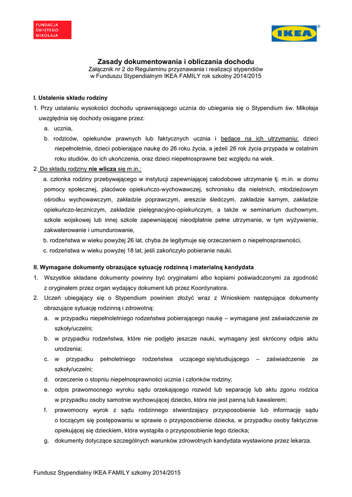 Zasady dokumentowania i obliczania dochodu Załącznik nr 2 do Regulaminu przyznawania i realizacji stypendiów w Funduszu Stypendialnym IKEA FAMILY rok szkolny 2014/2015 I. Ustalenie składu rodziny 1. Przy ustalaniu wysokości dochodu uprawniającego ucznia do ubiegania się o Stypendium św. Mikołaja uwzględnia się dochody osiągane przez: a. ucznia, b. rodziców, opiekunów prawnych lub faktycznych ucznia i będące na ich utrzymaniu: dzieci niepełnoletnie, dzieci pobierające naukę do 26 roku życia, a jeżeli 26 rok życia przypada w ostatnim roku studiów, do ich ukończenia, oraz dzieci niepełnosprawne bez względu na wiek. 2. Do składu rodziny nie wlicza się m.in.: a. członka rodziny przebywającego w instytucji zapewniającej całodobowe utrzymanie tj. m.in. w domu pomocy społecznej, placówce opiekuńczo-wychowawczej, schronisku dla nieletnich, młodzieżowym ośrodku wychowawczym, zakładzie poprawczym, areszcie śledczym, zakładzie karnym, zakładzie opiekuńczo-leczniczym, zakładzie pielęgnacyjno-opiekuńczym, a także w seminarium duchownym, szkole wojskowej lub innej szkole zapewniającej nieodpłatnie pełne utrzymanie, w tym wyżywienie, zakwaterowanie i umundurowanie, b. rodzeństwa w wieku powyżej 26 lat, chyba że legitymuje się orzeczeniem o niepełnosprawności, c. rodzeństwa w wieku powyżej 18 lat, jeśli zakończyło pobieranie nauki. II. Wymagane dokumenty obrazujące sytuację rodzinną i materialną kandydata 1. Wszystkie składane dokumenty powinny być oryginałami albo kopiami poświadczonymi za zgodność z oryginałem przez organ wydający dokument lub przez Koordynatora. 2. Uczeń ubiegający się o Stypendium powinien złożyć wraz z Wnioskiem następujące dokumenty obrazujące sytuację rodzinną i zdrowotną: a. w przypadku niepełnoletniego rodzeństwa pobierającego naukę – wymagane jest zaświadczenie ze szkoły/uczelni; b. w przypadku rodzeństwa, które nie podjęło jeszcze nauki, wymagany jest skrócony odpis aktu urodzenia; c. w przypadku pełnoletniego rodzeństwa uczącego się/studiującego – zaświadczenie ze szkoły/uczelni; d. orzeczenie o stopniu niepełnosprawności ucznia i członków rodziny; e. odpis prawomocnego wyroku sądu orzekającego rozwód lub separację lub aktu zgonu rodzica w przypadku osoby samotnie wychowującej dziecko, która nie jest panną lub kawalerem; f. prawomocny wyrok z sądu rodzinnego stwierdzający przysposobienie lub informację sądu o toczącym się postępowaniu w sprawie o przysposobienie dziecka, w przypadku osoby faktycznie opiekującej się dzieckiem, która wystąpiła o przysposobienie tego dziecka; g. dokumenty dotyczące szczególnych warunków zdrowotnych kandydata wystawione przez lekarza. Fundusz Stypendialny IKEA FAMILY szkolny 2014/2015 3. Uczeń ubiegający się o Stypendium powinien złożyć zaświadczenia lub oświadczenia pełnoletnich członków rodziny stwierdzające wysokość dochodu, w tym odpowiednio: W przypadku osoby, która uzyskiwała jakiekolwiek dochody: oświadczenie ucznia/członka rodziny o wysokości średniego miesięcznego dochodu netto w okresie 01.01.-30.06.2014 r.; W przypadku członków rodziny, którzy pracują na stałe/na zlecenie/sezonowo/dorywczo: zaświadczenie od pracodawcy o dochodach w okresie 01.01.-30.06.2014 r.; W przypadku osób bezrobotnych: - zarejestrowanych w urzędzie pracy jako bezrobotne wymagane jest zaświadczenie o pozostawaniu bez pracy w okresie 01.01.-30.06.2014 r. (z prawem lub bez prawa do zasiłku i określeniem wysokości zasiłku); - niezarejestrowanych w urzędzie pracy jako osoby bezrobotne, a mimo to pozostających bez pracy, wymagane jest oświadczenie o niewykonywaniu pracy zarobkowej w okresie 01.01.-30.06.2014 r. oraz dokumenty obrazujące sytuację bieżącą; W przypadku członków rodziny, którzy prowadzą gospodarstwo rolne, wymagane jest zaświadczenie z gminy o wielkości posiadanych hektarów przeliczeniowych lub nakaz płatniczy; Wysokość dochodu wyznacza się jako iloczyn powierzchni użytków rolnych w hektarach przeliczeniowych i wysokości przeciętnego dochodu z pracy w indywidualnych gospodarstwach rolnych z 1 ha przeliczeniowego w 2012 roku podzielonego na 12 miesięcy (202,58 zł); W przypadku wypłacania lub otrzymywania alimentów wymagane są: – przekazy lub przelewy pieniężne dokumentujące wysokość alimentów, jeżeli członkowie rodziny są zobowiązani wyrokiem sądu lub ugodą sądową do ich płacenia na rzecz osoby spoza rodziny, – kopia odpisu wyroku sądu zasądzającego alimenty na rzecz osób w rodzinie, gdy alimenty uzyskiwane są w kwocie zasądzonej przez sąd, – kopia odpisu wyroku sądu zasądzającego alimenty na rzecz osób w rodzinie oraz zaświadczenie komornika o całkowitej lub częściowej bezskuteczności egzekucji alimentów, a także o wysokości wyegzekwowanych alimentów, w sytuacji, gdy alimenty uzyskiwane są w kwocie niższej niż zasądzone przez sąd – zaświadczenie z urzędu gminy lub ośrodka pomocy społecznej o wysokości zaliczki alimentacyjnej, kopia odpisu wyroku sądu zasądzającego alimenty na rzecz osób w rodzinie oraz zaświadczenie od komornika o całkowitej lub częściowej bezskuteczności egzekucji alimentów, a także o wysokości wyegzekwowanych alimentów, w przypadku uzyskania alimentów niższych niż zasądzone w wyroku, w sytuacji, gdy wypłacana jest zaliczka alimentacyjna, Zaświadczenie lub decyzja z ośrodka pomocy społecznej o otrzymywanych świadczeniach (zasiłek stały, zasiłek okresowy, zasiłek rodzinny, zasiłek pielęgnacyjny, dodatek mieszkaniowy) w okresie 01.01.-30.06.2014 r.; Odcinki renty/emerytury z okresu 01.01.-30.06.2014 r. lub decyzja z ZUS/KRUS ustalająca prawo do emerytury, renty lub innego świadczenia z Funduszu Ubezpieczeń Społecznych; Fundusz Stypendialny IKEA FAMILY szkolny 2014/2015 Oświadczenia o wysokości dochodów uzyskiwanych z prac dorywczych, oświadczenie o uzyskiwaniu 