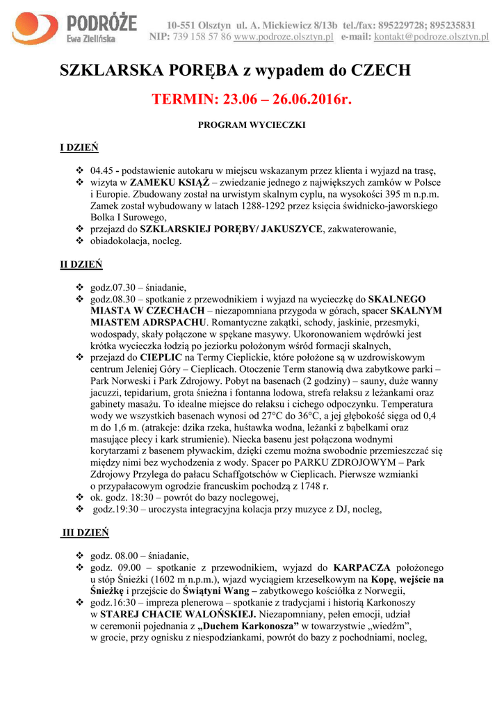 SZKLARSKA PORĘBA z wypadem do CZECH TERMIN: 23.06 – 26.06.2016r. PROGRAM WYCIECZKI I DZIEŃ 04.45 - podstawienie autokaru w miejscu wskazanym przez klienta i wyjazd na trasę, wizyta w ZAMEKU KSIĄŻ – zwiedzanie jednego z największych zamków w Polsce i Europie. Zbudowany został na urwistym skalnym cyplu, na wysokości 395 m n.p.m. Zamek został wybudowany w latach 1288-1292 przez księcia świdnicko-jaworskiego Bolka I Surowego, przejazd do SZKLARSKIEJ PORĘBY/ JAKUSZYCE, zakwaterowanie, obiadokolacja, nocleg. II DZIEŃ godz.07.30 – śniadanie, godz.08.30 – spotkanie z przewodnikiem i wyjazd na wycieczkę do SKALNEGO MIASTA W CZECHACH – niezapomniana przygoda w górach, spacer SKALNYM MIASTEM ADRSPACHU. Romantyczne zakątki, schody, jaskinie, przesmyki, wodospady, skały połączone w spękane masywy. Ukoronowaniem wędrówki jest krótka wycieczka łodzią po jeziorku położonym wśród formacji skalnych, przejazd do CIEPLIC na Termy Cieplickie, które położone są w uzdrowiskowym centrum Jeleniej Góry – Cieplicach. Otoczenie Term stanowią dwa zabytkowe parki – Park Norweski i Park Zdrojowy. Pobyt na basenach (2 godziny) – sauny, duże wanny jacuzzi, tepidarium, grota śnieżna i fontanna lodowa, strefa relaksu z leżankami oraz gabinety masażu. To idealne miejsce do relaksu i cichego odpoczynku. Temperatura wody we wszystkich basenach wynosi od 27°C do 36°C, a jej głębokość sięga od 0,4 m do 1,6 m. (atrakcje: dzika rzeka, huśtawka wodna, leżanki z bąbelkami oraz masujące plecy i kark strumienie). Niecka basenu jest połączona wodnymi korytarzami z basenem pływackim, dzięki czemu można swobodnie przemieszczać się między nimi bez wychodzenia z wody. Spacer po PARKU ZDROJOWYM – Park Zdrojowy Przylega do pałacu Schaffgotschów w Cieplicach. Pierwsze wzmianki o przypałacowym ogrodzie francuskim pochodzą z 1748 r. ok. godz. 18:30 – powrót do bazy noclegowej, godz.19:30 – uroczysta integracyjna kolacja przy muzyce z DJ, nocleg, III DZIEŃ godz. 08.00 – śniadanie, godz. 09.00 – spotkanie z przewodnikiem, wyjazd do KARPACZA położonego u stóp Śnieżki (1602 m n.p.m.), wjazd wyciągiem krzesełkowym na Kopę, wejście na Śnieżkę i przejście do Świątyni Wang – zabytkowego kościółka z Norwegii, godz.16:30 – impreza plenerowa – spotkanie z tradycjami i historią Karkonoszy w STAREJ CHACIE WALOŃSKIEJ. Niezapomniany, pełen emocji, udział w ceremonii pojednania z „Duchem Karkonosza” w towarzystwie „wiedźm”, w grocie, przy ognisku z niespodziankami, powrót do bazy z pochodniami, nocleg, powrót do bazy noclegowej, obiadokolacja, nocleg, IV DZIEŃ godz.7:30 – śniadanie, wykwaterowanie, przejazd do SZKLARSKIEJ PORĘBY – zwiedzanie Huty Szkła „Julia” – miejsca, w którym splata się historia, piękno szklanych arcydzieł i ręczny proces produkcji. Podczas zwiedzania z przewodnikiem obejrzycie Państwo niezwykły proces wytwarzania kryształu w pracującej hucie. Ścieżka turystyczna prowadzi przez wiele działów m.in. miejsca gdzie doświadczeni rzemieślnicy dmuchają i formują gorącą masę szklaną dosłownie wyczarowując kryształowe produkty na oczach turystów – od szlifowania, poprzez nanoszenie przepięknych zdobień i misterne pakowanie kryształu. W sklepie firmowym zakupić można „kryształowe cudeńka”, wyjazd w drogę powrotną, obiad na trasie, powrót w późnych godzinach wieczornych. CENA: 1089 zł dla grupy 40uczestników. CENA OBEJMUJE: transport autokarem klasy turystycznej, 3 noclegi, 3śniadania, 1 obiad, 3obiadokolacje (w tym 1 obiadokolacja integracyjna z DJ), bilety wstępów – Chata Walońska, Skalne Miasto, Huta Julia, pobyt na basenach w Cieplicach (2godziny),wjazd na Kopę, Świątynia WANG, wejście do KPN, pilota na całej trasie, przewodników (Karpacz, Skalne Miasto, Cieplice), ubezpieczenie NNW i KL. UWAGA! Kolejność zwiedzania może ulec zmianie.