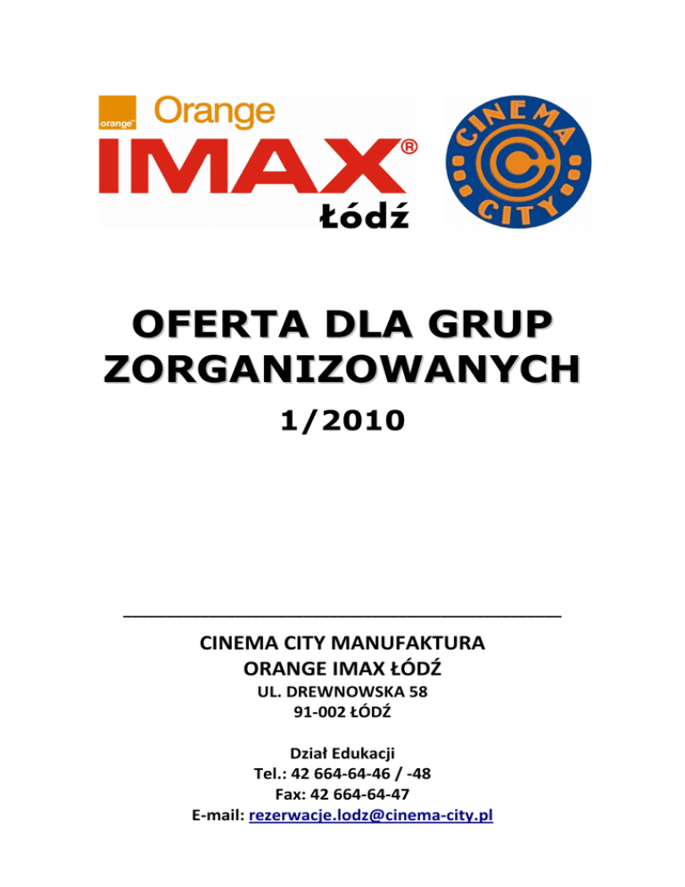OFERTA DLA GRUP ZORGANIZOWANYCH 1/2010 ___________________________________________________ CINEMA CITY MANUFAKTURA ORANGE IMAX ŁÓDŹ UL. DREWNOWSKA 58 91-002 ŁÓDŹ Dział Edukacji Tel.: 42 664-64-46 / -48 Fax: 42 664-64-47 E-mail: [email protected] MAGIA TRÓJWYMIARU Nowoczesna szkoła mieści się w trójwymiarowym kinie Orange IMAX. Przeżyj podróż swojego życia i odkryj magię trójwymiaru! Dzięki nam edukacja staję się niezapomnianą atrakcją. www.kinoimax.pl 2 Szanowni Państwo, W związku z rozpoczęciem Nowego Roku, pragniemy Państwu przedstawić najnowszą ofertę kina Cinema City Manufaktura / Orange IMAX Łódź mieszczącego się w dawnym Imperium Izraela Poznańskiego, a obecnie największym w Polsce Centrum Handlowo Rozrywkowym MANUFAKTURA. Oferta, którą Państwo otrzymali skierowana jest do opiekunów grup zorganizowanych. Znajdą tu Państwo informacje dotyczące repertuaru, aktualnych promocji oraz propozycji wykorzystania filmu jako środka dopełnienia edukacji zdobytej podczas zajęć klasowych. Państwa szczególną uwagę kierujemy do stron poświęconych nadchodzącym premierom oraz oferowanym przez nas zajęciom edukacyjnym. Wiemy jak trudno zainteresować i zachęcić do nauki dzieci i młodzież, dlatego wspólnie z doradcami metodycznymi Wojewódzkiego Ośrodka Doskonalenia Nauczycieli w Łodzi sukcesywnie rozwijamy, cieszący się dużym zainteresowaniem grup, „Program Edukacyjny”. Pierwszymi efektami tej pracy jest „Eko Lekcja” podejmująca jakże ważne w dzisiejszych czasach tematy ekologii, a także „Kosmiczna Lekcja” będąca dopełnieniem i rozwinięciem wiedzy z zakresu dziedzin astronautyki i astronomii. Zajęcia te mają formę interaktywnej lekcji i wykorzystują metody aktywizujące, a więc uczenie się poprzez działanie i przeżywanie pozwalające rozwijać kreatywność, umiejętność wyciągania wniosków, myślenia analitycznego czy komunikatywność. Zaznaczamy, iż dzięki 15 salom kinowym i bogatej ofercie filmowej jesteśmy w stanie pomóc dobrać odpowiedni tytuł filmu, a także ofertę edukacyjną do danej grupy wiekowej. Dzięki ofercie pakietów z partnerami znajdującymi się w obrębie samej Manufaktury pomożemy zaplanować kompleksowy program całej wycieczki. Dla Państwa wygody w każdym kinie Cinema City i Orange IMAX znajduje się Dział Edukacji, gdzie postaramy się odpowiedzieć na każde Państwa pytanie. Liczymy, iż informacje zawarte w niniejszej broszurze spotkają się z Państwa zainteresowaniem, co zaowocuje w niedalekiej przyszłości niejedną wizytą w naszym kinie wraz ze szkolnymi wychowankami. Do zobaczenia w kinie! Dział Rezerwacji Grupowej Cinema City Manufaktura Orange IMAX Łódź 3 KINO EDUKACYJNE W TRÓJWYMIARZE Jedyne w swoim rodzaju filmy wyświetlane w technologii IMAX zdążyły zdobyć nie tylko sympatię widzów, ale zostały także docenione przez Ministra Edukacji oraz Ministerstwo Środowiska obejmując nad naszą ofertą honorowy patronat. Dziś z dumą pragniemy Państwu przedstawić Orange IMAX Digital – najnowocześniejszą technologię kina trójwymiarowego, która po raz pierwszy w naszej części kontynentu znalazła miejsce właśnie w Łodzi. Wraz z nowinką technologiczną będziemy Państwu sukcesywnie proponować nowe tytuły, oczywiście w najwyższej jakości cyfrowej! ________________________________________________________________________ „POD TAFLĄ OCEANU 3D” TYLKO U NAS W ORANGE IMAX DIGITAL! Nowa przygoda przenosi widzów w egzotyczne i odległe wody m.in. Australii Południowej, Wielkiej Rafy Koralowej czy Wysp Trójkąta Koralowego w Papui Nowej Gwinei i Indonezji, pozwalając im przeŜyć bezpośrednie i zapierające dech w piersiach spotkanie z tajemniczymi i fascynującymi mieszkańcami oceanów. Film w wyjątkowo inspirujący i zajmujący sposób odkrywa piękno i niezwykłą przyrodę oceanów oraz pozwala poznać wpływ wywierany przez globalne zmiany klimatyczne na to unikatowe środowisko. niezwykłej technologii IMAX, świat oceanu dosłownie opływa salę kinową, sprawiając, Ŝe widzowie znajdują się w środku filmu. “Częścią zamysłu przy tworzeniu filmów IMAX jest podniesienie poziomu świadomości widzów na temat zwierząt i środowiska naturalnego” przyznaje reŜyser Howard Hall. “Mamy nadzieję, Ŝe kiedy ludzie zobaczą świat tych niezwykłych zwierząt w wyjątkowej jakości obrazu 3D, poznają je i pokochają. Większość ludzi nie słyszało o tych gatunkach. Naszą misją jest zainteresowanie ich zagroŜeniem globalnego ocieplenia i zakwaszenia oceanów.” ________________________________________________________________________ „STACJA KOSMICZNA 3D” NA SPECJALNE śYCZENIE WIDZÓW PO RAZ PIERWSZY W WERSJI CYFROWEJ! „Stacja Kosmiczna 3D” jest opowieścią o największej zdobyczy techniki od czasu pierwszej wyprawy człowieka na KsięŜyc - o budowie Międzynarodowej Stacji Kosmicznej. Światowa misja, zorganizowana przez przedstawicieli szesnastu państw, ma przeprowadzić szereg badań, których wyniki znacznie poszerzą dotychczasowe ludzkie rozumienie praw rządzących kosmosem. Film zabiera widzów 220 mil (około 354 tysięcy metrów) nad powierzchnię Ziemi, by prawie namacalnie doświadczyli Ŝycia w przestrzeni kosmicznej, a trójwymiarowy obraz IMAX, jak Ŝadne inne medium, odzwierciedla ogrom i wielkie emocje towarzyszące realizacji tego niezwykłego objektu powstającego w przestrzeni kosmicznej. „Stacja kosmiczna 3D” będąc pierwszym filmem, dla którego ogromne kamery IMAX poleciały w kosmos, stała się juŜ pozycją wręcz kultową nie tylko w kręgu osób zainteresowanych tematami astronautyki i astronomii. 4 ________________________________________________________________________ „AVATAR 3D” MIĘDZYGALAKTYCZNA PRZYGODA W TRÓJWYMIARZE! Długo oczekiwany film Jamesa Camerona zrealizowany z wielkim rozmachem porównywalnym do „Titanica”. Ludzkość odkrywa planetę o n