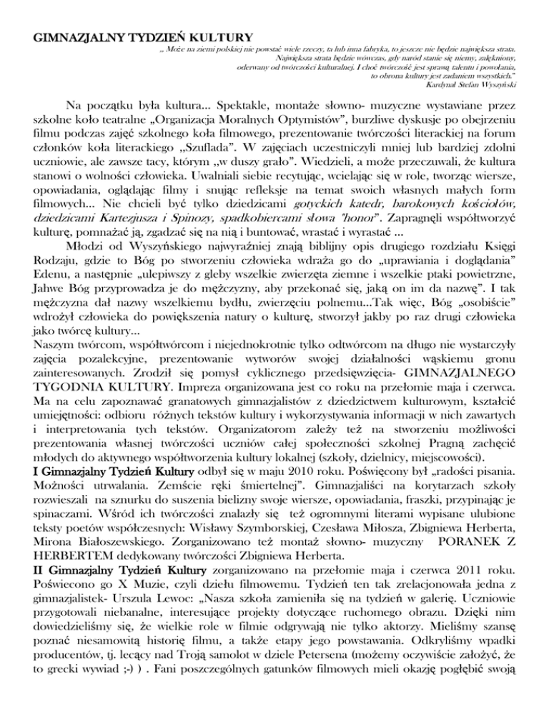 GIMNAZJALNY TYDZIEŃ KULTURY ,, Może na ziemi polskiej nie powstać wiele rzeczy, ta lub inna fabryka, to jeszcze nie będzie największa strata. Największa strata będzie wówczas, gdy naród stanie się niemy, zalękniony, oderwany od twórczości kulturalnej. I choć twórczość jest sprawą talentu i powołania, to obrona kultury jest zadaniem wszystkich.” Kardynał Stefan Wyszyński Na początku była kultura... Spektakle, montaże słowno- muzyczne wystawiane przez szkolne koło teatralne „Organizacja Moralnych Optymistów”, burzliwe dyskusje po obejrzeniu filmu podczas zajęć szkolnego koła filmowego, prezentowanie twórczości literackiej na forum członków koła literackiego ,,Szuflada”. W zajęciach uczestniczyli mniej lub bardziej zdolni uczniowie, ale zawsze tacy, którym ,,w duszy grało”. Wiedzieli, a może przeczuwali, że kultura stanowi o wolności człowieka. Uwalniali siebie recytując, wcielając się w role, tworząc wiersze, opowiadania, oglądając filmy i snując refleksje na temat swoich własnych małych form filmowych… Nie chcieli być tylko dziedzicami gotyckich katedr, barokowych kościołów, dziedzicami Kartezjusza i Spinozy, spadkobiercami słowa "honor”. Zapragnęli współtworzyć kulturę, pomnażać ją, zgadzać się na nią i buntować, wrastać i wyrastać … Młodzi od Wyszyńskiego najwyraźniej znają biblijny opis drugiego rozdziału Księgi Rodzaju, gdzie to Bóg po stworzeniu człowieka wdraża go do „uprawiania i doglądania” Edenu, a następnie „ulepiwszy z gleby wszelkie zwierzęta ziemne i wszelkie ptaki powietrzne, Jahwe Bóg przyprowadza je do mężczyzny, aby przekonać się, jaką on im da nazwę”. I tak mężczyzna dał nazwy wszelkiemu bydłu, zwierzęciu polnemu…Tak więc, Bóg „osobiście” wdrożył człowieka do powiększenia natury o kulturę, stworzył jakby po raz drugi człowieka jako twórcę kultury… Naszym twórcom, współtwórcom i niejednokrotnie tylko odtwórcom na długo nie wystarczyły zajęcia pozalekcyjne, prezentowanie wytworów swojej działalności wąskiemu gronu zainteresowanych. Zrodził się pomysł cyklicznego przedsięwzięcia- GIMNAZJALNEGO TYGODNIA KULTURY. Impreza organizowana jest co roku na przełomie maja i czerwca. Ma na celu zapoznawać granatowych gimnazjalistów z dziedzictwem kulturowym, kształcić umiejętności: odbioru różnych tekstów kultury i wykorzystywania informacji w nich zawartych i interpretowania tych tekstów. Organizatorom zależy też na stworzeniu możliwości prezentowania własnej twórczości uczniów całej społeczności szkolnej Pragną zachęcić młodych do aktywnego współtworzenia kultury lokalnej (szkoły, dzielnicy, miejscowości). I Gimnazjalny Tydzień Kultury odbył się w maju 2010 roku. Poświęcony był „radości pisania. Możności utrwalania. Zemście ręki śmiertelnej”. Gimnazjaliści na korytarzach szkoły rozwieszali na sznurku do suszenia bielizny swoje wiersze, opowiadania, fraszki, przypinając je spinaczami. Wśród ich twórczości znalazły się też ogromnymi literami wypisane ulubione teksty poetów współczesnych: Wisławy Szymborskiej, Czesława Miłosza, Zbigniewa Herberta, Mirona Białoszewskiego. Zorganizowano też montaż słowno- muzyczny PORANEK Z HERBERTEM dedykowany twórczości Zbigniewa Herberta. II Gimnazjalny Tydzień Kultury zorganizowano na przełomie maja i czerwca 2011 roku. Poświecono go X Muzie, czyli dziełu filmowemu. Tydzień ten tak zrelacjonowała jedna z gimnazjalistek- Urszula Lewoc: „Nasza szkoła zamieniła się na tydzień w galerię. Uczniowie przygotowali niebanalne, interesujące projekty dotyczące ruchomego obrazu. Dzięki nim dowiedzieliśmy się, że wielkie role w filmie odgrywają nie tylko aktorzy. Mieliśmy szansę poznać niesamowitą historię filmu, a także etapy jego powstawania. Odkryliśmy wpadki producentów, tj. lecący nad Troją samolot w dziele Petersena (możemy oczywiście założyć, że to grecki wywiad ;-) ) . Fani poszczególnych gatunków filmowych mieli okazję pogłębić swoją wiedzę o nich oraz poznać tytuły produkcji godnych polecenia. Każdy mógł przejść się Aleją Gwiazd (ta, niestety, długo nie wytrzymała…) i dowiedzieć się o prawdziwie wielkich aktorach i reżyserach. Na drzwiach każdej sali pojawiły się plakaty najlepszych produkcji ostatnich lat.” III Gimnazjalny Tydzień Kultury /04-08.06.2012r./ przebiegał pod hasłem „Wilno Litwinów i Polaków”. Efekty pracy gimnazjalistów można było podziwiać na auli i korytarzach szkoły. Znalazły się tu plakaty dotyczące Wilna widzianego oczyma Mickiewicza, Słowackiego, Piłsudskiego, Moniuszki, Gałczyńskiego, Miłosza, Konwickiego czy Rodowicz. Gimnazjaliści podziwiali szkice uliczek wileńskich, wykonane przez ich rówieśników. Poczytali o zabytkach Wilna i języku współczesnych młodych Pulaków z Wilni. I choć na chwilę zasłuchali na koncercie muzyki wileńskiej, zapatrzyli w aktorów grających w spektaklach: „Dziady cz. II”, „Dziadowisko”. IV Gimnazjalny Tydzień Kultury odbył się pod hasłem „Spieszmy się odebrać maile od starożytnych"- w dn.03.-07.06.2013r. Na stronie internetowej Granatowego Gimnazjum znajdziemy taki oto wpis, relacjonujący to wydarzenie: „Istny paradoks-starożytni i maile! A jednak odbieraliśmy! W poniedziałek, korzystając z gry komputerowej zaprojektowanej przez ucz. kl.1b, rywalizowaliśmy o tytuł Mistrza Wiedzy Mitologicznej. We wtorek obejrzeliśmy prezentacje multimedialne przygotowane przez grupy projektowe z kl. 2e, 2b,1f-dotyczące bogów, potworów mitycznych, muz, filozofów starożytnych. Z uśmiechem na twarzy przywitaliśmy środę. Z zainteresowaniem obejrzeliśmy kabaretowe występy 4 zespołów. Każdy z nich zainspirował się historiami mitologicznymi. Czwartkowe przedpołudnie przemaszerowaliśmy w korowodzie postaci mitologicznych. Oczu nie mogliśmy oderwać od Meduzy, w głowi
