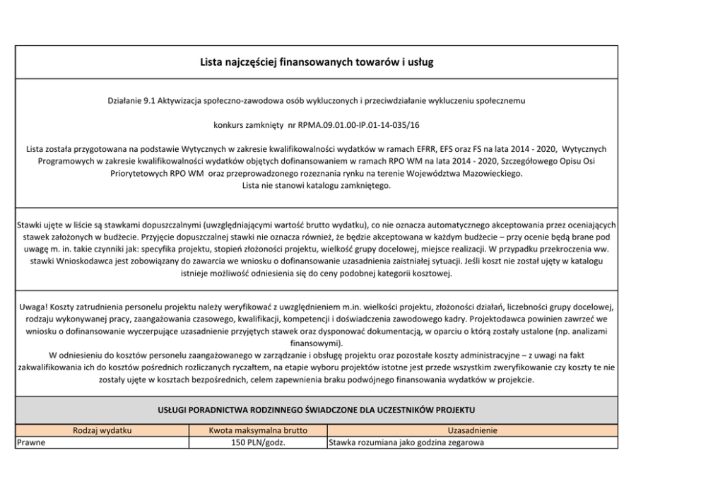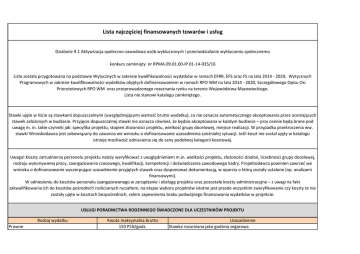 Lista najczęściej finansowanych towarów i usług Działanie 9.1 Aktywizacja społeczno-zawodowa osób wykluczonych i przeciwdziałanie wykluczeniu społecznemu konkurs zamknięty nr RPMA.09.01.00-IP.01-14-035/16 Lista została przygotowana na podstawie Wytycznych w zakresie kwalifikowalności wydatków w ramach EFRR, EFS oraz FS na lata 2014 - 2020, Wytycznych Programowych w zakresie kwalifikowalności wydatków objętych dofinansowaniem w ramach RPO WM na lata 2014 - 2020, Szczegółowego Opisu Osi Priorytetowych RPO WM oraz przeprowadzonego rozeznania rynku na terenie Województwa Mazowieckiego. Lista nie stanowi katalogu zamkniętego. Stawki ujęte w liście są stawkami dopuszczalnymi (uwzględniającymi wartość brutto wydatku), co nie oznacza automatycznego akceptowania przez oceniających stawek założonych w budżecie. Przyjęcie dopuszczalnej stawki nie oznacza również, że będzie akceptowana w każdym budżecie – przy ocenie będą brane pod uwagę m. in. takie czynniki jak: specyfika projektu, stopień złożoności projektu, wielkość grupy docelowej, miejsce realizacji. W przypadku przekroczenia ww. stawki Wnioskodawca jest zobowiązany do zawarcia we wniosku o dofinansowanie uzasadnienia zaistniałej sytuacji. Jeśli koszt nie został ujęty w katalogu istnieje możliwość odniesienia się do ceny podobnej kategorii kosztowej. Uwaga! Koszty zatrudnienia personelu projektu należy weryfikować z uwzględnieniem m.in. wielkości projektu, złożoności działań, liczebności grupy docelowej, rodzaju wykonywanej pracy, zaangażowania czasowego, kwalifikacji, kompetencji i doświadczenia zawodowego kadry. Projektodawca powinien zawrzeć we wniosku o dofinansowanie wyczerpujące uzasadnienie przyjętych stawek oraz dysponować dokumentacją, w oparciu o którą zostały ustalone (np. analizami finansowymi). W odniesieniu do kosztów personelu zaangażowanego w zarządzanie i obsługę projektu oraz pozostałe koszty administracyjne – z uwagi na fakt zakwalifikowania ich do kosztów pośrednich rozliczanych ryczałtem, na etapie wyboru projektów istotne jest przede wszystkim zweryfikowanie czy koszty te nie zostały ujęte w kosztach bezpośrednich, celem zapewnienia braku podwójnego finansowania wydatków w projekcie. USŁUGI PORADNICTWA RODZINNEGO ŚWIADCZONE DLA UCZESTNIKÓW PROJEKTU Rodzaj wydatku Prawne Kwota maksymalna brutto 150 PLN/godz. Uzasadnienie Stawka rozumiana jako godzina zegarowa Pedagogiczne Psychologiczne Socjalne 100 PLN/godz. 100 PLN/godz. 60 PLN/godz. Stawka rozumiana jako godzina zegarowa Stawka rozumiana jako godzina zegarowa Stawka rozumiana jako godzina zegarowa PERSONEL SPECJALISTYCZNY Rodzaj wydatku Trener/coach (umowa zlecenie) Doradca zawodowy (umowa zlecenie) Pośrednik pracy (umowa zlecenie) Psycholog (umowa zlecenie) Streetworker (umowa zlecenie) Terapeuta (terapia grupowa, zajęcia terapeutyczne) (umowa zlecenie) Kwota maksymalna brutto 200 PLN/godz. 100 PLN/godz. 80 PLN/godz. 100 PLN/godz. 50 PLN/godz. Uzasadnienie Stawka rozumiana jako godzina zegarowa Stawka rozumiana jako godzina zegarowa Stawka rozumiana jako godzina zegarowa Stawka rozumiana jako godzina zegarowa Stawka rozumiana jako godzina zegarowa 90 PLN/godz. Stawka rozumiana jako godzina zegarowa Asystent osoby niepełnosprawnej (umowa zlecenie) 30 PLN/godz. Stawka rozumiana jako godzina zegarowa Asystent osobisty osoby niepełnosprawnej (umowa zlecenie) 30 PLN/godz. Stawka rozumiana jako godzina zegarowa Asystent rodziny (umowa o pracę) Wynagrodzenie wynikające z Rozporządzenia Rady Ministrów z dnia 18 listopada 2014 r. w sprawie wynagradzania pracowników samorządowych (Dz. U. 2014 poz. 1786). WSPARCIE KIEROWANE DO UCZESTNIKÓW PROJEKTU SZKOLENIA I WARSZTATY Rodzaj wydatku Sala wykładowa Sala wykładowa komputerowa Kwota maksymalna brutto 90 PLN/godz. 120 PLN/godz. Uzasadnienie Stawka rozumiana jako godzina zegarowa Stawka rozumiana jako godzina zegarowa Kursy i szkolenia Rodzaj wydatku Asystent osoby niepełnosprawnej Kwota maksymalna brutto 800 PLN Uzasadnienie Obsługa magazynu Wózki widłowe (jezdniowe) Kurs obsługi betoniarki Operator koparko - ładowarki Spawanie metodą TIG Kurs prawo jazdy kat.B Kurs prawo jazdy kat.C Kurs prawo jazdy kat C + E Kurs prawo jazdy kat D Projektowanie komputerowe z wykorzystaniem AUTOCAD Grafika komputerowa PHOTOSHOP Grafika komputerowa Corel Tworzenie stron www Kadry i płace Kasjer - sprzedawca Florystyka Instruktor fitness Dietetyczka Pracownik ochrony mienia Kosmetyczka Rachunkowość/księgowość Wizażysta Fryzjer Kelner/Barman Masażysta Rodzaj wydatku 500 PLN 850 PLN 770 PLN 1400 PLN 1950 PLN 1200 PLN 2100 PLN 2000 PLN 3500 PLN 1200 PLN Usługa zawiera wydatki związane z pełną organizacją i przeprowadzeniem szkolenia, m.in. wynagrodzenie wykładowcy; wynajęcie/eksploatacja sal (w tym sali dostosowanej do potrzeb osób z niepełnosprawnościami); materiały szkoleniowe; podręczniki, sprzęt techniczny np. laptop, dojazdy wykonawcy do miejsca świadczenia usługi, noclegi, wyżywienie wykonawcy w miejscu realizacji usługi. Nie należy wykazywać odrębnie tych kosztów w budżecie. 1000 PLN 800 PLN 1200 PLN 1450 PLN 950 PLN 1700 PLN 1000 PLN 700 PLN 1400 PLN 1400 PLN 2800 PLN 1800 PLN 1500 PLN 600 PLN 800 PLN WYDATKI TOWARZYSZĄCE Kwota maksymalna brutto/jednostka miary Uzasadnienie Zwrot kosztów dojazdu Wydatek kwalifikowalny jedynie w przypadku uczestniczenia we wsparciu oferowanym poza miejscem zamieszkania oraz w związku z uzasadnionymi potrzebami grupy docelowej (np. koszty dojazdów dla osób niepełnosprawnych, bezrobotnych). Zaleca się, aby podróż odbywała się publicznymi/zbiorowymi środkami transportu, z wyjątkiem gdy na danym terenie są uzasadnione powody dla innej formy podróży. Cena uzależniona od cenników Wydatek kwalifikowalny do wysokości opłat za środki transportu operatorów komunikacji publicznej publicznego szynowego lub kołowego (w przypadku podróży międzynarodowych 