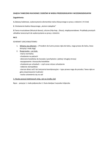 ZAJĘCIA TANECZNO-RUCHOWE Z DZIEĆMI W WIEKU PRZEDSZKOLNYM I WCZESNOSZKOLNYM Zagadnienia: 1.Zabawy baletowe, wykorzystanie elementów tańca klasycznego w pracy z dziećmi ( 4-6 lat) 2. Omówienie baletu klasycznego „Jezioro Łabędzie” 3.Tance musicalowe (Musical dance), uliczne (Hip-hop , Disco), międzynarodowe. Przykłady prostych układów tanecznych do wykorzystania w pracy z dziećmi. Ad.1 SCHEMAT LEKCJI BALETOWEJ 1. Witamy się ukłonem . ( Przodem do lustra prawa ręka do boku, noga prawa do boku, lewa skrzyżuj i mały dyg) 2. Rozgrzewka – po kole. -marsz normalny -chodzenie na palcach -zbieranie kwiatków do koszyka ( pochylanie z jednej i drugiej strony) -wysypywanie z koszyczka kwiatków -chodzenie po schodach – czyli coraz niższe schodzenie -robienie stempelków -starsze dzieci od 5 lat ćwiczenia koordynacyjne – typu prawa noga do przodu / lewa ręka w górę stopniowanie trudności -nauka ustawienia się na sali 3. Nauka pozycji baletowych stóp, rąk na środku Sali Ręce : pozycja 1: mała jedyneczka 2. Duża dwójaa 3.wysoka trójeczka Nogi: pozycja 1: mały kaczorek 2. Duży kaczorek 3. Literka T Zabawy na ćwiczenie pozycji: I. II. Zabawa w bal : Dzieci tańczą do wybranej muzyki, kiedy muzyka się wyciszy tzn ze czarownik rozpoczął swoje czary i zamroził wszystkich w jakiejś pozycji stóp i nóg ( każde dziecko samo wybiera) żeby czary przestały działać każde dziecko musi poprawnie nazwać pozycje stóp i rąk. Zabawa w rzeźbiarzy : Łączymy w pary – jedna osoba rzeźbi drugą ustawiając jej rączki w wybranej pozycji i nogi – Rzeźba musi nazwać poprawnie pozycje wtedy może zostać prawdziwa tancerka a nie kamienna rzeźba. ( Pozycje rąk i nóg wg kolorowanek załącznik nr 1) W przerwie można dzieciom opowiedzieć o stroju baletowym np. Usztywniane buty tancerek to pointy [płenty]. Długa tiulowa spódnica połączona z body to paczka romantyczna Krótka kilkuwarstwowa ,tiulowa spódniczka to paczka klasyczna inaczej tutu 4.Przy drążku baletowym: Ustawiamy dzieci każde trzyma drążek jedną rączka ( prawidłowo prawa) druga rączka trzymana w drugiej pozycji ( Obejmuje drzewko , trzyma sukienkę itp.) - pierwsze ćwiczenie – muzyka wolna Rączka do drążka , wróć Rączka do drążka , wróć Obydwie rączki nad główką ( pozycja 3) I wirujemy dookoła. Całość powtarzamy dowolną ilość razy ( Ćwiczenie można z dziećmi robić jako taniec gałązek-rączek) - drugie ćwiczenie ( muzyka wolna) – stopy ustawione w pozycji 1 ( mały kaczorek) rączka wolna obejmuje drzewko ( pozycja 2) Demie plie ( mały przysiad) Demie plie ( mały przysiad) Grande plie ( duży przysiad) ćwiczenie można robić jako podnoszenie muszelek , piasku itp. - trzecie ćwiczenie ( muzyka szybsza) stopy ustawione w pozycji 1 ( mały kaczorek) rączka wolna obejmuje drzewko ( pozycja 2) Releve zejdź ( wejdź na palce) Releve zejdź (wejdź na palce) Passe stoimy ,stoimy ( noga ugięta w kolanku , palce stopy dotykają kolana) Dla dzieci ćwiczenie można zobrazować tak że nogi robią figury : KRESECZKA KRESECZKA TRÓJKĄCIK Po ćwiczeniach przy drążku można z dziecmi dla rozluźnienie przeprowadzić zabawę np. w POCIĄG – do znanej melodii JEDZIE POCIĄG Z DALEKA Dzieci ustawiają się w pociąg i jadą ( podczas zwrotki) potem zatrzymują się na stacji i wewnętrzną nóżką wybijają rytm samymi paluszkami stopy . Potem druga nóżka. 5. Cwiczenia po przekątnej Sali: - Noszenie baloników – rączki ustawione w pierwszej pozycji ( mala jedyneczka) potem w trzecie ( wysoka trójka) do drugiej ( duża dwója) i znowu w pierwszej . Zwracamy uwagę na to żeby rączki były lekkie a ruchy delikatne. - Malowanie tęczy – dajemy dzieciom po dwie chustki zwiewne do każdej rączki. Dzieci wzdłuż Sali idą i malują nad głowami tęczę chustkami - Hula hop i passe – rozkładamy hula hop wzdłuż Sali – dzieci idą na paluszkach a jak wejdą w hula hop muszą zrobić pozycje passe i rączki w wysokiej trojce . - GRANDE BATTEMES – wymach nogi do przodu , rączki w drugiej pozycji ( duża dwója) zwracamy uwagę przede wszystkim na proste plecy obciągnięte paluszki u stop i proste kolana. 6. Wyciszenie i rozciąganie - siadamy w kole - nóżki do środka koła – i pracujemy stopami wesołe stopy ( flex) , smutne (point) , wesołe , smutne - nogi proste przed sobą i np. bawimy się w robaczki które chodzą po nogach i łaskoczą w stopy , można dawać buziaki w kolanka ( motywujemy dzieci do skłonu do nóg) - nogi w tzw. Motylku – - robimy dużą gwiazdę – nogi w rozkroku na podłodze i łączymy stopy z sąsiadem – i łapiemy raz jednego sąsiada nogę raz drugiego. 7. lekcję kończymy ukłonem ( taki sam jak na początku) Ad.2 BALET – samo słowo pochodzi od nazwy tańców dworskich znanych jako balli albo balletti od włoskiego słowa ballare- tańczyć JEZIORO ŁABĘDZIE Muzyka: Piotr Czajkowski Pierwsza choreografia : M. Petipa, L.Iwanow LIBRETTO: Książę Zygfryd zakochuje się w czarującej królowej łabędzi, Odetcie-pięknej kobiecie zaklętej w łabędzia przez złego czarownika ROTBARTA. Odetta wyjasnia Zygfrydowi, że jedynie dozgonna miłość mężczyzny może ją uratować i przywrócić jej ludzką postać. Oczarowany jej urodą książe ślubuje wieczną miłość. Jednak tego samego dnia na wieczornym balu zły czarownik Rotbart podstępnie rozkochuje go w swojej córce – ODYLII która łudząco przypomina Odettę. Kiedy Zygfryd dostrzega swój błąd, biegnie nad jezioro. Odetta natychmiast mu przebacza-UWAGA!!! W przypadku opowiadania libretta dzieciom najlepiej jest je w tym momencie zakończyć. – Dalsze opowiadanie o walce z Rotbartem oraz samobójstwie Odetty i Zygfryda w przypadku tak młodej publiczności nie ma najmniejszego sensu. SCENY WARTE POKAZANIA DZIECIOM: - Prezentacja Zygfryda ( można wybrać dowolną scenę) -Taniec Zygfryda z kielichem –akt 1 -Prezentacja Odetty