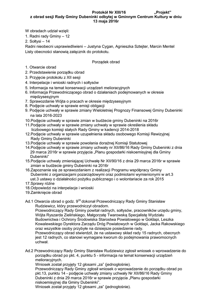 Protokół Nr XIII/16 „Projekt” z obrad sesji Rady Gminy Dubeninki odbytej w Gminnym Centrum Kultury w dniu 13 maja 2016r W obradach udział wzięli: 1. Radni rady Gminy – 12 2. Sołtysi – 14 Radni nieobecni usprawiedliwieni – Justyna Cygan, Agnieszka Sztejter, Marcin Mentel Listy obecności stanowią załącznik do protokołu. Porządek obrad 1. Otwarcie obrad 2. Przedstawienie porządku obrad 3. Przyjęcie protokołu z XII sesji 4. Interpelacje i wnioski radnych i sołtysów 5. Informacja na temat konserwacji urządzeń melioracyjnych 6. Informacja Przewodniczącego obrad o działaniach podejmowanych w okresie międzysesyjnym 7. Sprawozdanie Wójta o pracach w okresie międzysesyjnym 8. Podjęcie uchwały w sprawie emisji obligacji 9. Podjęcie uchwały w sprawie zmiany Wieloletniej Prognozy Finansowej Gminy Dubeninki na lata 2016-2023 10.Podjęcie uchwały w sprawie zmian w budżecie gminy Dubeninki na 2016r 11.Podjęcie uchwały w sprawie zmiany uchwały w sprawie określenia składu liczbowego komisji stałych Rady Gminy w kadencji 2014-2018 12.Podjęcie uchwały w sprawie uzupełnienia składu osobowego Komisji Rewizyjnej Rady Gminy Dubeninki 13.Podjęcie uchwały w sprawie powołania doraźnej Komisji Statutowej 14.Podjęcie uchwały w sprawie zmiany uchwały nr XII/86/16 Rady Gminy Dubeninki z dnia 29 marca 2016r w sprawie przyjęcia „Planu gospodarki niskoemisyjnej dla Gminy Dubeninki” 15.Podjęcie uchwały zmieniającej Uchwałę Nr XII/90/16 z dnia 29 marca 2016r w sprawie zmian w budżecie gminy Dubeninki na 2016r 16.Zapoznanie się ze sprawozdaniem z realizacji Programu współpracy Gminy Dubeninki z organizacjami pozarządowymi oraz podmiotami wymienionymi w art.3 ust.3 ustawy o działalności pożytku publicznego i o wolontariacie za rok 2015 17.Sprawy różne 18.Odpowiedzi na interpelacje i wnioski 19.Zamknięcie obrad Ad.1 Otwarcia obrad o godz. 935 dokonał Przewodniczący Rady Gminy Stanisław Rudziewicz, który przewodniczył obradom. Przewodniczący Rady Gminy powitał radnych, sołtysów, pracowników urzędu gminy, Wójta Ryszarda Zielińskiego, Małgorzatę Twarowską Specjalistę Wydziału Budownictwa i Ochrony Środowiska Starostwa Powiatowego w Gołdapi, Leszka Kowalewskiego Dyrektora Zarządu Dróg Powiatowych w Gołdapi, Jacka Rakowskiego oraz wszystkie osoby przybyłe na dzisiejsze posiedzenie rady. Przewodniczący obrad stwierdził, że na ustawowy skład rady 15 radnych, obecnych jest 12 radnych, co stanowi wymagane kworum do podejmowania prawomocnych uchwał. Ad.2 Przewodniczący Rady Gminy Stanisław Rudziewicz zgłosił wniosek o wprowadzenie do porządku obrad po pkt. 4, punktu 5 - informacja na temat konserwacji urządzeń melioracyjnych. Wniosek został przyjęty 12 głosami „za” (jednogłośnie). Przewodniczący Rady Gminy zgłosił wniosek o wprowadzenie do porządku obrad po pkt.13, punktu 14 - podjęcie uchwały zmiany uchwały Nr XII/86/16 Rady Gminy Dubeninki z dnia 29 marca 2016r w sprawie przyjęcia „Planu gospodarki niskoemisyjnej dla Gminy Dubeninki”. Wniosek został przyjęty 12 głosami „za” (jednogłośnie). 2 Przewodniczący Rady Gminy zgłosił wniosek o wprowadzenie do porządku obrad po pkt.14, punktu 15 - podjęcie uchwały zmieniającej Uchwałę Nr XII/90/16 z dnia 29 marca 2016r w sprawie zmian w budżecie gminy Dubeninki na 2016r. Wniosek został przyjęty 12 głosami „za” (jednogłośnie). Innych zmian do porządku obrad nie zgłoszono. Porządek obrad po zmianach został przyjęty 12 głosami „za” (jednogłośnie). Ad.3 Uwag do protokołu z XII sesji nie wniesiono. Protokół został przyjęty 11 głosami „za”, 0 „przeciw”, 1 „wstrzymującym się”. Ad.4 W interpelacjach i wnioskach głos zabrali: Wiceprzewodnicząca Rady Gminy Anna Stypułkowska korzystając z obecności Jaromira Krajewskiego Dyrektora Parku Krajobrazowego Puszczy Rominckiej poinformowała, że przy budynku mieszkalnym (blok) w msc. Bludzie po raz drugi spadło ze słupa gniazdo bocianów. W msc. Kiepojcie nie było prądu, ponieważ według elektryków, na linii jest gdzieś gniazdo, które robi zwarcie. W związku z tym Wiceprzewodnicząca Rady zapytała czy można byłoby zrobić (dospawać) jakieś kosze. Następną sprawą, jaką poruszyła Anna Stypułkowska dotyczyła podżwirowania drogi gminnej do Bludzi. Wiceprzewodnicząca Rady Gminy zwróciła się do Leszka Kowalewskiego Dyrektora Zarządu Dróg Powiatowych w Gołdapi i poprosiła o przedstawienie w kilku słowach jak będzie przebiegał remont drogi do Bludzi. Zgłosiła też potrzebę poprawienia drogi powiatowej Bludzie – Kiepojcie. Głos zabrał radny Ryszard Gruszka i zwracając się do Wójta zapytał, kiedy będą żwirowane drogi, ponieważ prawdopodobnie na skutek padającego deszczu leżące gromady żwiru są coraz mniejsze, a na drogach żwir się nie pojawia. Radny Ryszard Gruszka zwrócił się również do Leszka Kowalewskiego Dyrektora Zarządu Dróg Powiatowych w Gołdapi w sprawie piwnica w msc. Kramnik. Dyrektor Zarządu Dróg Powiatowych wyjaśnił, że piwnicy została zamurowana. Głos zabrał radny Alojzy Patejko i zapytał czy w związku z remontem ul. Kajki w Dubeninkach przewiduje się przy tej ulicy budowę chodników. Skierował również zapytanie do Dyrektora ZDP dotyczące planów w zakresie naprawy czy remontów, przebudowy dróg powiatowych Błąkały-Stańczyki i Linowo-Przerośl. Głos zabrał sołtys sołectwa Białe Jeziorki Jan Kruszka i zgłosił problem dotyczący zalania przez bobry prywatnych lasów, co spowodowało, że z tych lasów zrobiły się nieużytki. Do zgłoszonego problemu odniosła się Małgorzata Twarowska Specjalista Wydziału Budownictwa i Ochrony Środowiska Starostwa Powiatowego w Gołdapi i poinformowała, że należy zgłosić się do Wydziału Budownictwa i Ochrony Środowiska Starostwa Powiatowego i wypełnić odpowiednie druki, a następnie przesłać do Regionalnej Dyrekcji Ochrony Ś