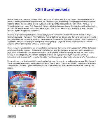 XXII Stawigudiada Gmina Stawiguda zaprasza 11 lipca 2015 r. od godz. 10:00 na XXII Gminny Festyn „Stawigudiada 2015”. Impreza jest organizowana nieprzerwanie od 1994 roku i jest najważniejszą imprezą plenerową w gminie. Przez te lata na stawigudzkiej scenie wystąpiło wiele gwiazd polskiej estrady, wśród nich: Piersi, 2+1, Tercet Egzotyczny, Happy End, Bayer full, Harlem, Wojtek Gąsowski, Iwona Węgrowska, Andrzej Rosiewicz, Jan Pietrzak, Grupa Rafała Kmity, Genowefa Pigwa, Stan Tutaj i wielu innych. W bieżącej edycji festynu gwiazdą będzie Małgorzata Ostrowska. Impreza rozpocznie się około godz. 10:00 tradycyjnym Turniejem Szóstek Piłkarskich o Puchar Wójta Gminy Stawiguda i Turniejem Piłki Plażowej o Puchar Sołtysa wsi Stawiguda. Zarówno turnieje, jak i reszta festynu odbędą się na terenie stadionu sportowego w Stawigudzie. Również o godzinie 10:00 organizatorzy zapraszają wszystkich chętnych na imprezę towarzyszącą – spływ kajakowy, organizowany w ramach projektu GOK w Stawigudzie – „RekreAkcja”. Część rozrywkowa rozpocznie się uroczystością pożegnania dyrygenta chóru „Legenda”. Wiktor Żołnierek od pierwszej próby zespołu , tj listopada 2002 roku był jego dyrygentem, aranżerem, akompaniatorem. Jego praca kształtowała całą działalność chóru. Ze względów osobistych podjął decyzję, że swoją pracę kończy w lipcu tego roku. Na koncert pożegnalny złożą się występy lokalnych zespołów – oczywiście chóru „Legenda” i zespołu „Kosejder” ze Stawigudy, a także chóru „Konsonans” z Tomaszkowa. Po raz pierwszy na stawigudzkiej imprezie pojawi się muzyka country w wykonaniu warszawskiej formacji Trace. Imprezę poprowadzi Maciej Gąsiorek, aktor Teatru „Rampa”, znany też z programu TVP dla dzieci „Budzik”, gdzie wcielał się w rolę krasnala Piksela. Nie zabraknie konkursów i turnieju dla rodzin. Drukuj