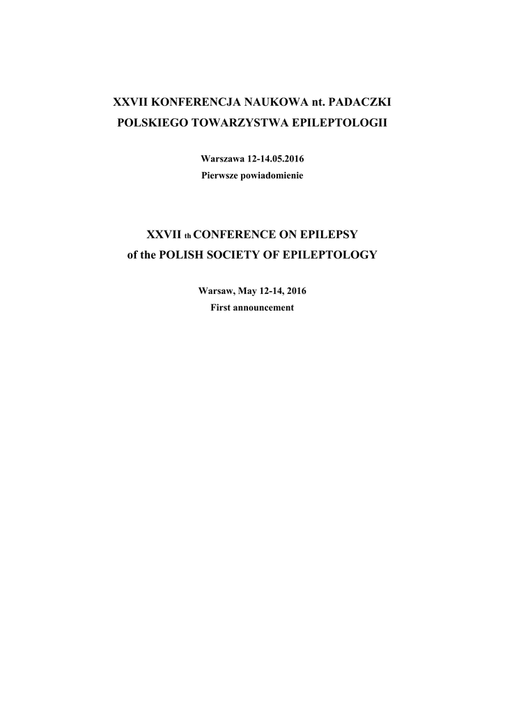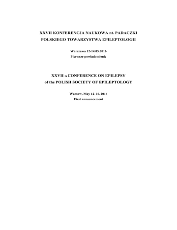 XXVII KONFERENCJA NAUKOWA nt. PADACZKI POLSKIEGO TOWARZYSTWA EPILEPTOLOGII Warszawa 12-14.05.2016 Pierwsze powiadomienie XXVII th CONFERENCE ON EPILEPSY of the POLISH SOCIETY OF EPILEPTOLOGY Warsaw, May 12-14, 2016 First announcement Welcome Dear Colleagues and Friends, On behalf of the Organizing Committee I have a great pleasure and honor to invite you to Warsaw to attend the XXVII Conference of the Polish Society of Epileptology, which will take place in Warsaw on May 12-14, 2016 in Novotel Warszawa Centrum hotel. Similarly to past years, the conference material which has been prepared will cover aspects of everyday life of epileptic patients, as well as will present scientific and clinical updates in epileptology. The Agenda will include in particular: Difficult cases in epileptology. Adults and Children. Video-EEG diagnosis. Difficult questions in epileptology – Differential diagnosis of paroxysmal events from the neurological and the endocrinological point of view Impairment of sexual functions in patients with epilepsy Doctor – epileptic patient – how to communicate Debate of PSE Free topics As usual, the Conference will be preceded by Symposium on Epilepsy and Pregnancy. An important program elements are the sessions organized by Commissions of Polish Society of Epileptology and satellite symposia. We are also offering a series of lectures devoted to the differential diagnosis of movement disorders and epileptic seizures. I sincerely believe that the proposed Agenda will meet your expectations. I also count on your participation in a series of social events that we have planned for you. Looking forward to welcoming you in Warsaw, Prof. Joanna Jędrzejczak, MD, PhD Chairwoman of the Organizing Committee Szanowni Państwo, Koleżanki i Koledzy, Jak co roku w imieniu Komitetu Organizacyjnego mam przyjemność i zaszczyt zaprosić Państwa do wzięcia udziału w XXVII Konferencji Naukowej nt. padaczki Polskiego Towarzystwa Epileptologii, która odbędzie się w Warszawie tradycyjnie w maju w dniach 12-14.05.2016 w hotelu Novotel Warszawa Centrum. Mam nadzieję, że tak jak w poprzednich latach przygotowany przez Komitet Naukowy Konferencji program naukowy i dydaktyczny, obejmie nie tylko zagadnienia istotne w praktyce dnia codziennego, ale również aspekty naukowe i kliniczne odgrywające istotną rolę w postępowaniu z chorymi na padaczkę. Trudne przypadki w Epileptologii. Dzieci i dorośli. Diagnostyka wideo-EEG. Trudne pytania w Epileptologii – Diagnostyka różnicowa incydentów napadowych z punktu widzenia endokrynologa i neurologa. Zaburzenia funkcji seksualnych u chorych z padaczką Komunikacja z pacjentem chorym na padaczkę Forum PTE Tematy wolne Jak zwykle Konferencję poprzedzi Sympozjum Padaczka i Ciąża. Ważnym elementem programu będą sympozja organizowane przez Komisje Polskiego Towarzystwa Epileptologii oraz sesje satelitarne. Utrzymaliśmy również w programie dobrze przez Państwa przyjęty cykl sesji dydaktycznych. W tym roku poświęconych diagnostyce różnicowej zaburzeń ruchowych o różnej etiologii i napadów padaczkowych. Mam nadzieję, że nie tylko program naukowy spełni Państwa oczekiwania, ale również imprezy towarzyszące planowane przez Komitet Organizacyjny. Do zobaczenia w Warszawie, Prof. CMKP dr hab. n.med. Joanna Jędrzejczak Przewodnicząca Komitetu Organizacyjnego Komitet Organizacyjny Prof. dr hab. n.med. Joanna Jędrzejczak – przewodnicząca Dr hab. n.med. Beata Majkowska-Zwolińska – sekretarz Dr hab. n.med. Maria Mazurkiewicz-Bełdzińska – skarbnik Dr n.med. Ałbena Grabowska-Grzyb – członek Dr n.biol. Piotr Walerjan – członek Komitet Naukowy Prof. dr hab. n.med. Joanna Jędrzejczak – przewodnicząca Prof. dr hab. n.med. Janusz Wendorff Prof. dr hab. n.med. Zbigniew Stelmasiak Prof. dr hab. n.med. Danuta Ryglewicz Dr hab. n.med. Ewa Motta Prof. dr hab. n.med. Barbara Steinborn Dr hab. n.med. Maria Mazurkiewicz-Bełdzińska Sekretariat Hanna Wiewióra Izabela Fijałkowska Adres Sekretariatu Komitetu Organizacyjnego: Fundacja Epileptologii ul. Wiertnicza 122, 02-952 Warszawa tel.+(48) 22 858 29 07 lub 842-24-92 fax +(48) 22 642 74 34 e-mail: [email protected] http://www.epilepsy.org.pl Miejsce Obrad NOVOTEL Warszawa Centrum ul. Marszałkowska 94/98 00-510 Warszawa Koszt uczestnictwa uczestnicy - 500 zł + 23% VAT = 615 zł Wpłaty prosimy dokonać na konto Polskiego Towarzystwa Epileptologii: PKO BP XII/O Warszawa 41 1020 1127 0000 1402 0083 7344 Streszczenia Prosimy o nadsyłanie streszczeń w języku polskim i angielskim (1 strona do 250 słów) na adres sekretariatu Konferencji do 15.03.2016 (forma elektroniczna) Forma streszczeń powinna być zgodna z aktualnymi zasadami kwartalnika Journal of Epileptology http://www.journal-epileptology.com/