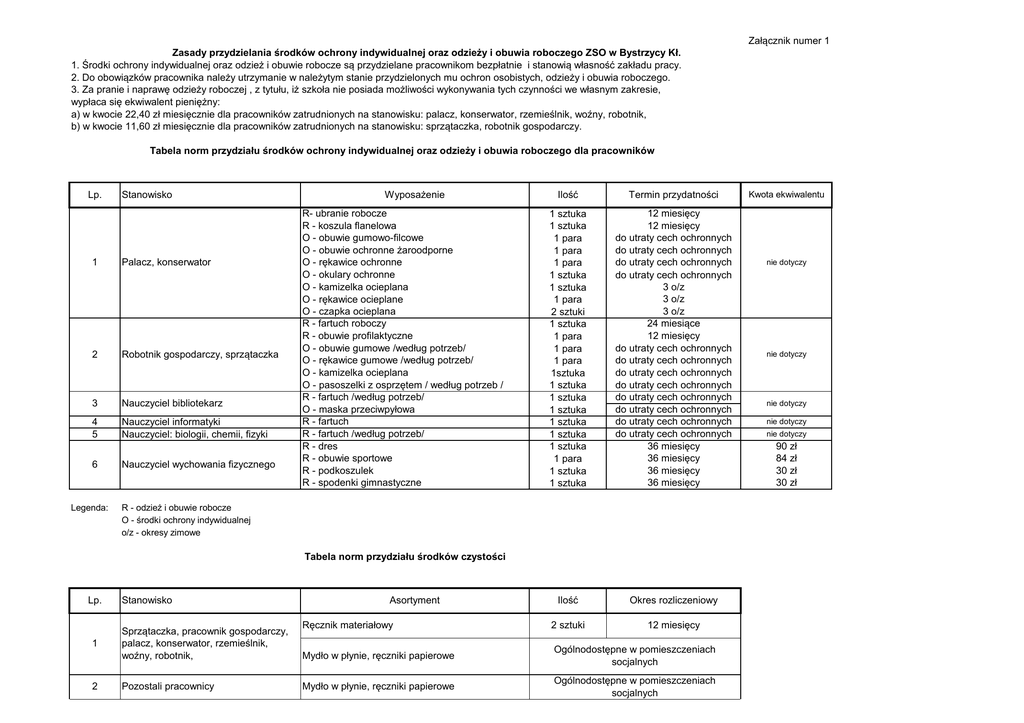 Załącznik numer 1 Zasady przydzielania środków ochrony indywidualnej oraz odzieży i obuwia roboczego ZSO w Bystrzycy Kł. 1. Środki ochrony indywidualnej oraz odzież i obuwie robocze są przydzielane pracownikom bezpłatnie i stanowią własność zakładu pracy. 2. Do obowiązków pracownika należy utrzymanie w należytym stanie przydzielonych mu ochron osobistych, odzieży i obuwia roboczego. 3. Za pranie i naprawę odzieży roboczej , z tytułu, iż szkoła nie posiada możliwości wykonywania tych czynności we własnym zakresie, wypłaca się ekwiwalent pieniężny: a) w kwocie 22,40 zł miesięcznie dla pracowników zatrudnionych na stanowisku: palacz, konserwator, rzemieślnik, woźny, robotnik, b) w kwocie 11,60 zł miesięcznie dla pracowników zatrudnionych na stanowisku: sprzątaczka, robotnik gospodarczy. Tabela norm przydziału środków ochrony indywidualnej oraz odzieży i obuwia roboczego dla pracowników Lp. Stanowisko 1 Palacz, konserwator 2 Robotnik gospodarczy, sprzątaczka 3 Nauczyciel bibliotekarz 4 5 Nauczyciel informatyki Nauczyciel: biologii, chemii, fizyki 6 Legenda: Nauczyciel wychowania fizycznego Wyposażenie Ilość Termin przydatności 1 sztuka 1 sztuka 1 para 1 para 1 para 1 sztuka 1 sztuka 1 para 2 sztuki 1 sztuka 1 para 1 para 1 para 1sztuka 1 sztuka 1 sztuka 1 sztuka 1 sztuka 1 sztuka 1 sztuka 1 para 1 sztuka 1 sztuka 12 miesięcy 12 miesięcy do utraty cech ochronnych do utraty cech ochronnych do utraty cech ochronnych do utraty cech ochronnych 3 o/z 3 o/z 3 o/z 24 miesiące 12 miesięcy do utraty cech ochronnych do utraty cech ochronnych do utraty cech ochronnych do utraty cech ochronnych do utraty cech ochronnych do utraty cech ochronnych do utraty cech ochronnych do utraty cech ochronnych 36 miesięcy 36 miesięcy 36 miesięcy 36 miesięcy Ilość Okres rozliczeniowy Ręcznik materiałowy 2 sztuki 12 miesięcy Mydło w płynie, ręczniki papierowe Ogólnodostępne w pomieszczeniach socjalnych Mydło w płynie, ręczniki papierowe Ogólnodostępne w pomieszczeniach socjalnych R- ubranie robocze R - koszula flanelowa O - obuwie gumowo-filcowe O - obuwie ochronne żaroodporne O - rękawice ochronne O - okulary ochronne O - kamizelka ocieplana O - rękawice ocieplane O - czapka ocieplana R - fartuch roboczy R - obuwie profilaktyczne O - obuwie gumowe /według potrzeb/ O - rękawice gumowe /według potrzeb/ O - kamizelka ocieplana O - pasoszelki z osprzętem / według potrzeb / R - fartuch /według potrzeb/ O - maska przeciwpyłowa R - fartuch R - fartuch /według potrzeb/ R - dres R - obuwie sportowe R - podkoszulek R - spodenki gimnastyczne R - odzież i obuwie robocze O - środki ochrony indywidualnej o/z - okresy zimowe Tabela norm przydziału środków czystości Lp. 1 2 Stanowisko Sprzątaczka, pracownik gospodarczy, palacz, konserwator, rzemieślnik, woźny, robotnik, Pozostali pracownicy Asortyment Kwota ekwiwalentu nie dotyczy nie dotyczy nie dotyczy nie dotyczy nie dotyczy 90 zł 84 zł 30 zł 30 zł