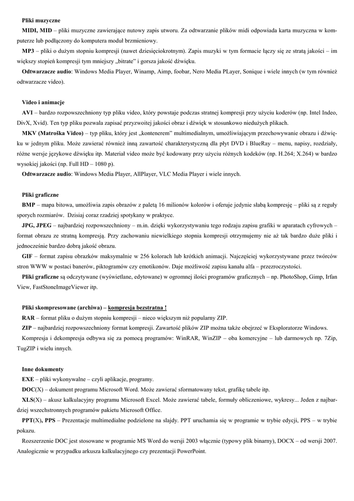 Pliki muzyczne MIDI, MID – pliki muzyczne zawierające nutowy zapis utworu. Za odtwarzanie plików midi odpowiada karta muzyczna w komputerze lub podłączony do komputera moduł brzmieniowy. MP3 – pliki o dużym stopniu kompresji (nawet dziesięciokrotnym). Zapis muzyki w tym formacie łączy się ze stratą jakości – im większy stopień kompresji tym mniejszy „bitrate” i gorsza jakość dźwięku. Odtwarzacze audio: Windows Media Player, Winamp, Aimp, foobar, Nero Media PLayer, Sonique i wiele innych (w tym również odtwarzacze video). Video i animacje AVI – bardzo rozpowszechniony typ pliku video, który powstaje podczas stratnej kompresji przy użyciu koderów (np. Intel Indeo, DivX, Xvid). Ten typ pliku pozwala zapisać przyzwoitej jakości obraz i dźwięk w stosunkowo niedużych plikach. MKV (Matroška Video) – typ pliku, który jest „kontenerem” multimedialnym, umożliwiającym przechowywanie obrazu i dźwięku w jednym pliku. Może zawierać również inną zawartość charakterystyczną dla płyt DVD i BlueRay – menu, napisy, rozdziały, różne wersje językowe dźwięku itp. Materiał video może być kodowany przy użyciu różnych kodeków (np. H.264; X.264) w bardzo wysokiej jakości (np. Full HD – 1080 p). Odtwarzacze audio: Windows Media Player, AllPlayer, VLC Media Player i wiele innych. Pliki graficzne BMP – mapa bitowa, umożliwia zapis obrazów z paletą 16 milionów kolorów i oferuje jedynie słabą kompresję – pliki są z reguły sporych rozmiarów. Dzisiaj coraz rzadziej spotykany w praktyce. JPG, JPEG – najbardziej rozpowszechniony – m.in. dzięki wykorzystywaniu tego rodzaju zapisu grafiki w aparatach cyfrowych – format obrazu ze stratną kompresją. Przy zachowaniu niewielkiego stopnia kompresji otrzymujemy nie aż tak bardzo duże pliki i jednocześnie bardzo dobrą jakość obrazu. GIF – format zapisu obrazków maksymalnie w 256 kolorach lub krótkich animacji. Najczęściej wykorzystywane przez twórców stron WWW w postaci banerów, piktogramów czy emotikonów. Daje możliwość zapisu kanału alfa – przezroczystości. Pliki graficzne są odczytywane (wyświetlane, edytowane) w ogromnej ilości programów graficznych – np. PhotoShop, Gimp, Irfan View, FastStoneImageViewer itp. Pliki skompresowane (archiwa) – kompresja bezstratna ! RAR – format pliku o dużym stopniu kompresji – nieco większym niż popularny ZIP. ZIP – najbardziej rozpowszechniony format kompresji. Zawartość plików ZIP można także obejrzeć w Eksploratorze Windows. Kompresja i dekompresja odbywa się za pomocą programów: WinRAR, WinZIP – oba komercyjne – lub darmowych np. 7Zip, TugZIP i wielu innych. Inne dokumenty EXE – pliki wykonywalne – czyli aplikacje, programy. DOC(X) – dokument programu Microsoft Word. Może zawierać sformatowany tekst, grafikę tabele itp. XLS(X) – akusz kalkulacyjny programu Microsoft Excel. Może zawierać tabele, formuły obliczeniowe, wykresy... Jeden z najbardziej wszechstronnych programów pakietu Microsoft Office. PPT(X), PPS – Prezentacje multimedialne podzielone na slajdy. PPT uruchamia się w programie w trybie edycji, PPS – w trybie pokazu. Rozszerzenie DOC jest stosowane w programie MS Word do wersji 2003 włącznie (typowy plik binarny), DOCX – od wersji 2007. Analogicznie w przypadku arkusza kalkulacyjnego czy prezentacji PowerPoint. HTM, HTML – dokumenty hipertekstowe, które opisują wygląd strony w przeglądarce internetowej. Ponieważ są to pliki tekstowe można je edytować nawet w zwykłym notatniku. Istnieją również specjalistyczne programy – edytory stron www – wspomagające tworzenie kodu HTML i języków programowania. PDF – przenośny format dokumentu – plik jest po prostu „wydrukiem elektronicznym – do pliku”. Taki dokument może zawierać tekst, grafikę, hiperłącza czyli wszystko to co da się „normalnie” wydrukować w każdym programie. Pliki PDF tworzone są najczęściej na wirtualnych drukarkach PDF (darmowych programach) lub w komercyjnym programie Adobe Acrobat. Odczytać je można w darmowym Acrobat Readerze lub innych. TXT – plik tekstowy, zawiera tylko i wyłącznie znaki alfanumeryczne, przestankowe i specjalne oraz podstawowe elementy formatowania, takie jak tabulatory. Nie można umieścić w takim pliku elementów graficznych czy nawet tabelki. Do edycji wystarczy zwykły notatnik. ISO, NRG – obraz płyty CD/DVD/BD, dysku twardego umożliwiający wierne skopiowanie (z zachowaniem struktury danych a nie tylko listy plików i folderów) tego dysku na inny nośnik. ISO jest standardowym typem obrazu dysku (odczytywany przez wszystkie programy do nagrywania płyt); NRG – plik typowy dla Nero, jednego z najbardziej cenionych programów do nagrywania. Zaprezentowane informacje są bardzo często ogromnym uproszczeniem lub jedynie ogólną charakterystyką typów plików. Wszystkich zachęcam do poszerzenia we własnym zakresie tej problematyki.