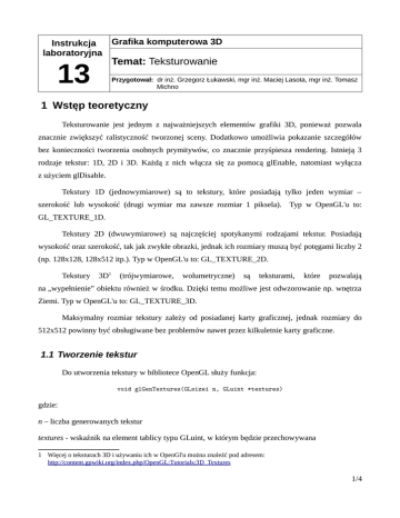 Grafika komputerowa 3D Instrukcja laboratoryjna Temat: Teksturowanie 13 Przygotował: dr inż. Grzegorz Łukawski, mgr inż. Maciej Lasota, mgr inż. Tomasz Michno 1 Wstęp teoretyczny Teksturowanie jest jednym z najważniejszych elementów grafiki 3D, ponieważ pozwala znacznie zwiększyć ralistyczność tworzonej sceny. Dodatkowo umożliwia pokazanie szczegółów bez konieczności tworzenia osobnych prymitywów, co znacznie przyśpiesza rendering. Istnieją 3 rodzaje tekstur: 1D, 2D i 3D. Każdą z nich włącza się za pomocą glEnable, natomiast wyłącza z użyciem glDisable. Tekstury 1D (jednowymiarowe) są to tekstury, które posiadają tylko jeden wymiar – szerokość lub wysokość (drugi wymiar ma zawsze rozmiar 1 piksela). Typ w OpenGL'u to: GL_TEXTURE_1D. Tekstury 2D (dwuwymiarowe) są najczęściej spotykanymi rodzajami tekstur. Posiadają wysokość oraz szerokość, tak jak zwykłe obrazki, jednak ich rozmiary muszą być potęgami liczby 2 (np. 128x128, 128x512 itp.). Typ w OpenGL'u to: GL_TEXTURE_2D. Tekstury 3D1 (trójwymiarowe, wolumetryczne) są teksturami, które pozwalają na „wypełnienie” obiektu również w środku. Dzięki temu możliwe jest odwzorowanie np. wnętrza Ziemi. Typ w OpenGL'u to: GL_TEXTURE_3D. Maksymalny rozmiar tekstury zależy od posiadanej karty graficznej, jednak rozmiary do 512x512 powinny być obsługiwane bez problemów nawet przez kilkuletnie karty graficzne. 1.1 Tworzenie tekstur Do utworzenia tekstury w bibliotece OpenGL służy funkcja: void glGenTextures(GLsizei n, GLuint *textures) gdzie: n – liczba generowanych tekstur textures - wskaźnik na element tablicy typu GLuint, w którym będzie przechowywana 1 Więcej o teksturach 3D i używaniu ich w OpenGl'u można znaleźć pod adresem: http://content.gpwiki.org/index.php/OpenGL:Tutorials:3D_Textures 1/4 wygenerowana tekstura. Następnie należy powiązać teksturę z jej nazwą, za pomocą: void glBindTexture(GLenum target, GLuint texture) Pierwszym parametrem jest rodzaj tekstury (GL_TEXTURE_1D, GL_TEXTURE_2D lub GL_TEXTURE_3D). Drugi parametr jest tablicą typu GLuint, w której przechowywana będzie tekstura. Aby zwolnić obiekty tekstur wykorzystujemy funkcję glDeleteTextures: void glDeleteTextures(GLsizei n, const GLuint *textures) 1.2 Tworzenie obrazów tekstury Gdy mamy już wygenerowaną oraz powiązaną teksturę za pomocą funkcji glGenTextures oraz glBindTexture możemy jej przypisać konkretne dane obrazowe. W OpenGL do tworzenia obrazów tekstur jednowymiarowych służy funkcja glTexImage1D. Funkcja ta wymaga przekazania ośmiu parametrów. void glTexImage1D(GLenum target, GLint level, GLint components, GLsizei width, GLint border, GLenum format, GLenum type, const GLvoid *pixels) Argument target określa, która tekstura powinna zostać zdefiniowana, musi nim być GL_TEXTURE_1D. Argument level wskazuje poziom szczegółów obrazu tekstury i zwykle wynosi 0 (inne wartości używane są przy teksturach typu mipmap). Argument components określa ilość wartości koloru użytych dla każdego piksela. Argument width i border określa rozmiar obrazu tekstury. Wartość border określa ilość pikseli ramki może mieć wartość 0, 1 lub 2. Parametr width określa szerokość głównego obrazu tekstury (bez pikseli ramki) i musi być potęgą liczby 2. Argument format wskazuje rodzaj wartości koloru w teksturze (GL_COLOR_INDEX, GL_LUMINANCE, GL_RGB, GL_RGBA). Parametr type określa typ danych dla wartości pikseli. Natomiast ostatni parametr pixels stanowi dane pikseli (które należy np. wczytać z pliku). W celu zdefiniowania dwuwymiarowej tekstury należy wywołać funkcję glTexImage2D. Funkcja ta przyjmuje identyczne parametry jak funkcji glTexImage1D. Dodatkowo wymaga podania jedynie argumentu height oraz jako target GL_TEXTURE_2D. void glTexImage2D(GLenum target, GLint level, GLint components, GLsizei width, GLsizei height, GLint border, GLenum format, GLenum type, const GLvoid *pixels) 2/4 Parametr pixels wskazuje na dane pikseli w postaci binarnej i jest niezależny od formatu tekstury na dysku (można nawet ręcznie stworzyć ją w kodzie programu). Z tego względu należy napisać własną funkcję do wczytywania i konwersji (przykład został załączony w oddzielnym pliku). 1.3 Nakładanie tekstur Nakładanie tekstur wykonuje się za pomocą rodziny funkcji glTexCoord. W zależności od rodzaju tekstury funkcja ta może przyjmować jeden lub dwa parametry określające punkt tekstury odpowiadający kolejnemu definiowanemu przez polecenie glVertex wierzchołkowi. Przykład: glBegin(GL_TRIANGLES); glTexCoord2f(0.1f, 0.0f); glVertex3f(0.0f,0.0f,0.0f); glTexCoord2f(1.0f, 0.0f); glVertex3f(2.0f,0.0f,0.0f); glTexCoord2f(0.1f, 1.0f); glVertex3f(0.0f,-2.0f,0.0f); glEnd(); 1.4 Filtry tekstur OpenGL pozwala na zwiększanie lub zmniejszanie tekstur. Filtr pomniejszający wykorzystywany jest w przypadku, gdy obraz przypisany do tekstury na ekranie jest mniejszy niż w rzeczywistości. Natomiast filtr powiększający wykorzystywany jest gdy obraz z tekstury na ekranie jest większy niż wczytany z pliku. Funkcją, którą możemy ustawiać parametry tekstur oraz rodzaj filtrowania jest glTexParameter. void glTexParameterf(GLenum target, GLenum pname, GLfloat param) void glTexParameteri(GLenum target, GLenum pname, GLint param) Przyjmuje ona trzy parametry. Pierwszy parametr określa typ tekstury (GL_TEXTURE_1D, GL_TEXTURE_2D). Drugi to nazwa zmienianego parametru. Ostatni parametr to nowa wartość zmienianego parametru tekstury. Parametr pname może posiadać jedną z wartości: GL_TEXTURE_MIN_FILTER, 3/4 GL_TEXTURE_MAG_FILTER, GL_TEXTURE_WRAP_S, GL_TEXTURE_WRAP_T, GL_TEXTURE_BORDER_COLOR, GL_TEXTURE_PRIORITY. Aby ustawić filtrowanie pomniejszające jako drugi parametr funkcji glTexParameter musimy ustawić GL_TEXTURE_MIN_FILTER, a dla filtrowania powiększającego GL_TEXTURE_MAG_FILTER. Filtrowanie w obu przypadkach może przyjmować następujące wartości, któr