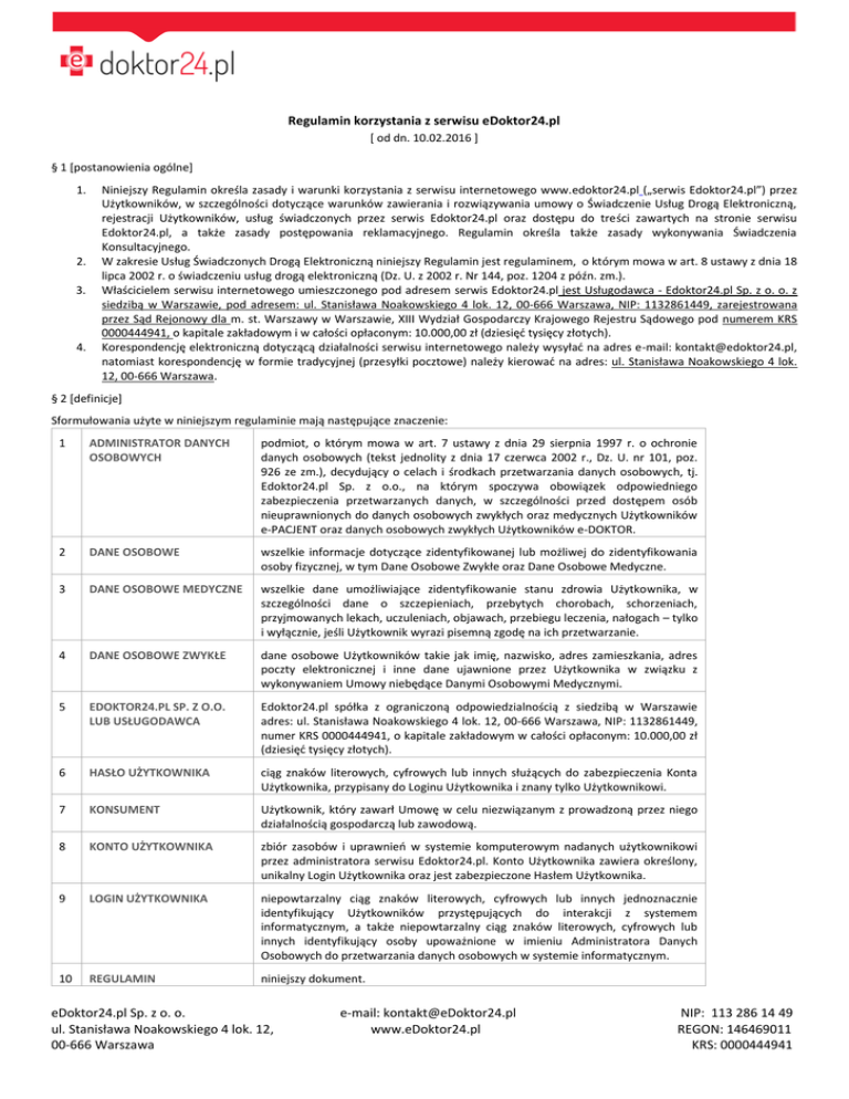 Regulamin korzystania z serwisu eDoktor24.pl [ od dn. 10.02.2016 ] § 1 [postanowienia ogólne] 1. 2. 3. 4. Niniejszy Regulamin określa zasady i warunki korzystania z serwisu internetowego www.edoktor24.pl („serwis Edoktor24.pl”) przez Użytkowników, w szczególności dotyczące warunków zawierania i rozwiązywania umowy o Świadczenie Usług Drogą Elektroniczną, rejestracji Użytkowników, usług świadczonych przez serwis Edoktor24.pl oraz dostępu do treści zawartych na stronie serwisu Edoktor24.pl, a także zasady postępowania reklamacyjnego. Regulamin określa także zasady wykonywania Świadczenia Konsultacyjnego. W zakresie Usług Świadczonych Drogą Elektroniczną niniejszy Regulamin jest regulaminem, o którym mowa w art. 8 ustawy z dnia 18 lipca 2002 r. o świadczeniu usług drogą elektroniczną (Dz. U. z 2002 r. Nr 144, poz. 1204 z późn. zm.). Właścicielem serwisu internetowego umieszczonego pod adresem serwis Edoktor24.pl jest Usługodawca - Edoktor24.pl Sp. z o. o. z siedzibą w Warszawie, pod adresem: ul. Stanisława Noakowskiego 4 lok. 12, 00-666 Warszawa, NIP: 1132861449, zarejestrowana przez Sąd Rejonowy dla m. st. Warszawy w Warszawie, XIII Wydział Gospodarczy Krajowego Rejestru Sądowego pod numerem KRS 0000444941, o kapitale zakładowym i w całości opłaconym: 10.000,00 zł (dziesięć tysięcy złotych). Korespondencję elektroniczną dotyczącą działalności serwisu internetowego należy wysyłać na adres e-mail: [email protected], natomiast korespondencję w formie tradycyjnej (przesyłki pocztowe) należy kierować na adres: ul. Stanisława Noakowskiego 4 lok. 12, 00-666 Warszawa. § 2 [definicje] Sformułowania użyte w niniejszym regulaminie mają następujące znaczenie: 1 ADMINISTRATOR DANYCH OSOBOWYCH podmiot, o którym mowa w art. 7 ustawy z dnia 29 sierpnia 1997 r. o ochronie danych osobowych (tekst jednolity z dnia 17 czerwca 2002 r., Dz. U. nr 101, poz. 926 ze zm.), decydujący o celach i środkach przetwarzania danych osobowych, tj. Edoktor24.pl Sp. z o.o., na którym spoczywa obowiązek odpowiedniego zabezpieczenia przetwarzanych danych, w szczególności przed dostępem osób nieuprawnionych do danych osobowych zwykłych oraz medycznych Użytkowników e-PACJENT oraz danych osobowych zwykłych Użytkowników e-DOKTOR. 2 DANE OSOBOWE wszelkie informacje dotyczące zidentyfikowanej lub możliwej do zidentyfikowania osoby fizycznej, w tym Dane Osobowe Zwykłe oraz Dane Osobowe Medyczne. 3 DANE OSOBOWE MEDYCZNE wszelkie dane umożliwiające zidentyfikowanie stanu zdrowia Użytkownika, w szczególności dane o szczepieniach, przebytych chorobach, schorzeniach, przyjmowanych lekach, uczuleniach, objawach, przebiegu leczenia, nałogach – tylko i wyłącznie, jeśli Użytkownik wyrazi pisemną zgodę na ich przetwarzanie. 4 DANE OSOBOWE ZWYKŁE dane osobowe Użytkowników takie jak imię, nazwisko, adres zamieszkania, adres poczty elektronicznej i inne dane ujawnione przez Użytkownika w związku z wykonywaniem Umowy niebędące Danymi Osobowymi Medycznymi. 5 EDOKTOR24.PL SP. Z O.O. LUB USŁUGODAWCA Edoktor24.pl spółka z ograniczoną odpowiedzialnością z siedzibą w Warszawie adres: ul. Stanisława Noakowskiego 4 lok. 12, 00-666 Warszawa, NIP: 1132861449, numer KRS 0000444941, o kapitale zakładowym w całości opłaconym: 10.000,00 zł (dziesięć tysięcy złotych). 6 HASŁO UŻYTKOWNIKA ciąg znaków literowych, cyfrowych lub innych służących do zabezpieczenia Konta Użytkownika, przypisany do Loginu Użytkownika i znany tylko Użytkownikowi. 7 KONSUMENT Użytkownik, który zawarł Umowę w celu niezwiązanym z prowadzoną przez niego działalnością gospodarczą lub zawodową. 8 KONTO UŻYTKOWNIKA zbiór zasobów i uprawnień w systemie komputerowym nadanych użytkownikowi przez administratora serwisu Edoktor24.pl. Konto Użytkownika zawiera określony, unikalny Login Użytkownika oraz jest zabezpieczone Hasłem Użytkownika. 9 LOGIN UŻYTKOWNIKA niepowtarzalny ciąg znaków literowych, cyfrowych lub innych jednoznacznie identyfikujący Użytkowników przystępujących do interakcji z systemem informatycznym, a także niepowtarzalny ciąg znaków literowych, cyfrowych lub innych identyfikujący osoby upoważnione w imieniu Administratora Danych Osobowych do przetwarzania danych osobowych w systemie informatycznym. 10 REGULAMIN niniejszy dokument. eDoktor24.pl Sp. z o. o. ul. Stanisława Noakowskiego 4 lok. 12, 00-666 Warszawa e-mail: [email protected] www.eDoktor24.pl NIP: 113 286 14 49 REGON: 146469011 KRS: 0000444941 11 SERWIS EDOKTOR24.PL LUB SERWIS platforma umożliwiająca i organizująca kontakt, w drodze środków komunikowania się na odległość, Użytkownika e-PACJENT z Użytkownikiem e-DOKTOR, w szczególności w celu zadawania pytań dotyczących stosowania zasad higieny i pielęgnacji zdrowia oraz zapobiegania chorobom oraz ich leczenia. Celem takiego kontaktu jest wyłącznie edukacja zdrowotna, wzbudzenie zainteresowania sprawami zdrowia oraz zdobywanie i pogłębianie wiedzy o własnym organizmie i rozwoju. 12 ŚRODKI KOMUNIKOWANIA SIĘ NA ODLEGŁOŚĆ urządzenie informatyczne i teleinformatyczne wraz z oprogramowaniem służące do indywidualnego porozumiewania się na odległość przy wykorzystaniu transmisji danych między systemami informatycznymi i teleinformatycznymi, w szczególności za pośrednictwem poczty elektronicznej. 13 ŚWIADCZENIA KONSULTACYJNE usługi wykonywane przez Użytkowników e-DOKTOR na rzecz Użytkowników ePACJENT na zlecenie Usługodawcy związane z promocją zdrowia, polegające na promowaniu zdrowego stylu życia oraz środowiskowych i indywidualnych czynników sprzyjających zdrowiu, a także na edukacji zdrowotnej i szkoleniowej, umożliwiającej Użytkownikom e-PACJENT zwiększenie kontroli nad czynnikami warunkującymi stan zdrowia i przez to jego poprawę. W ramach Świadczeń Konsultacyjnych, Użytkownicy e-DOKTOR są uprawnieni wyłącznie do: 1) 2) 3) przekazywania U